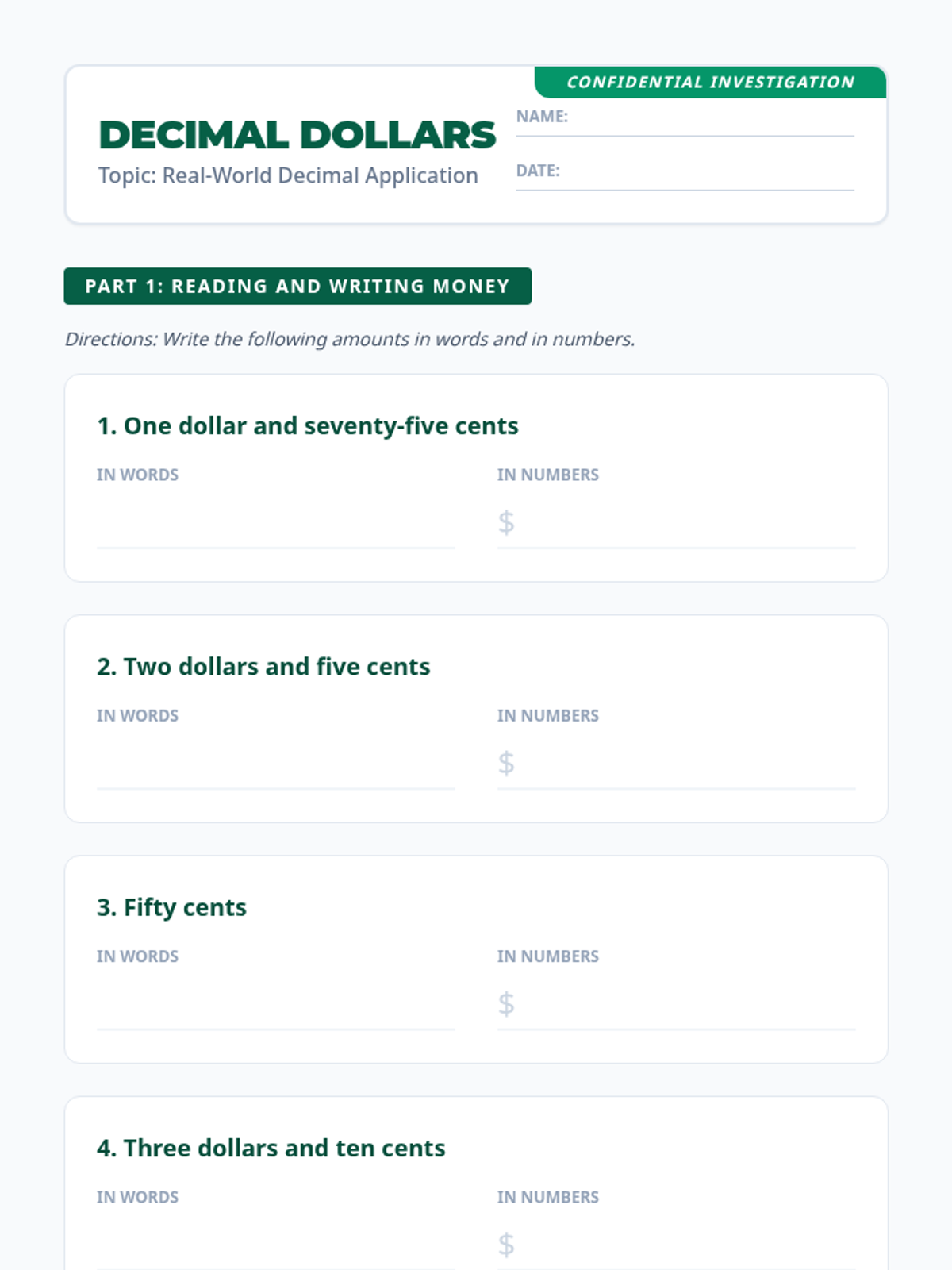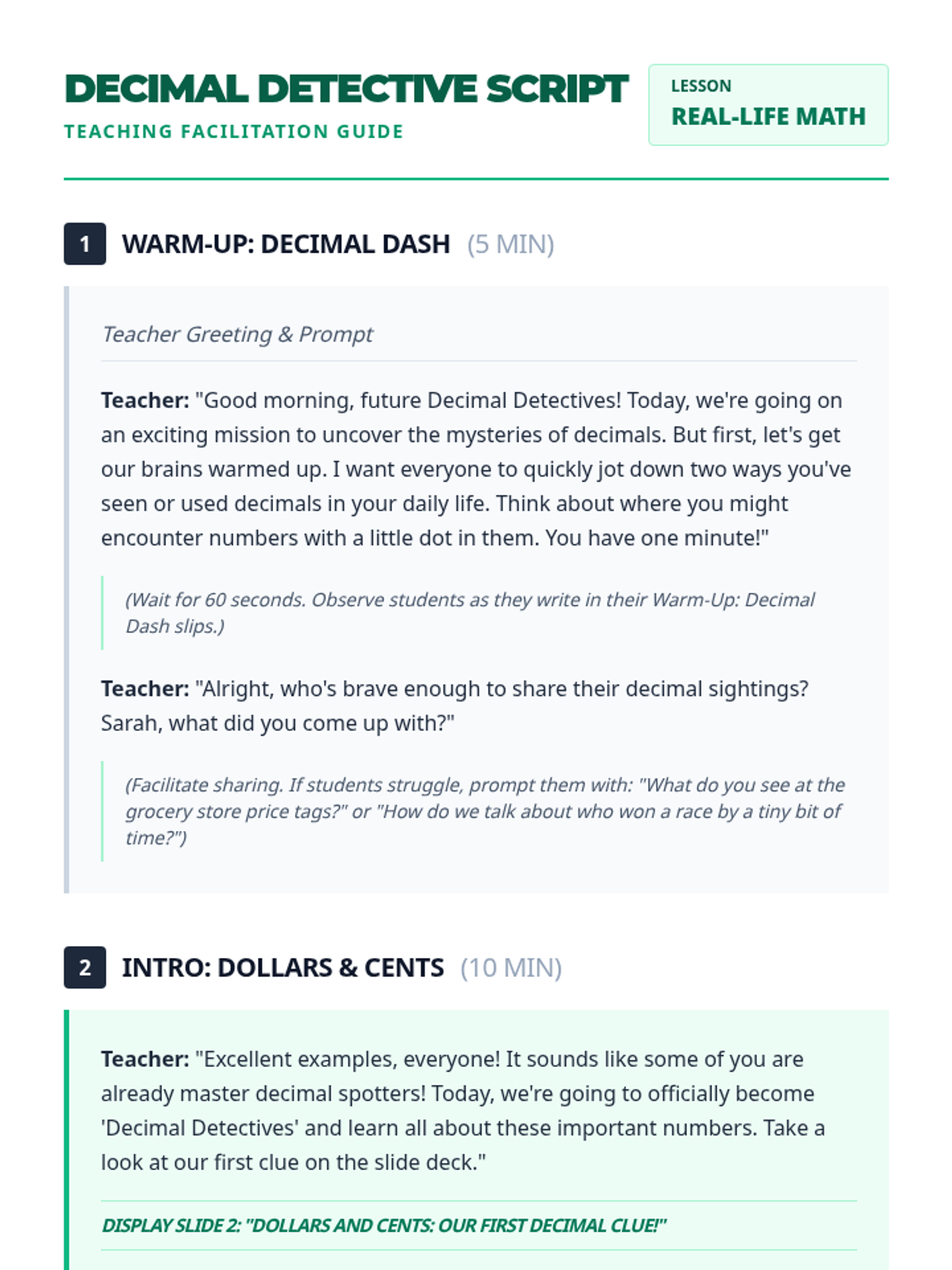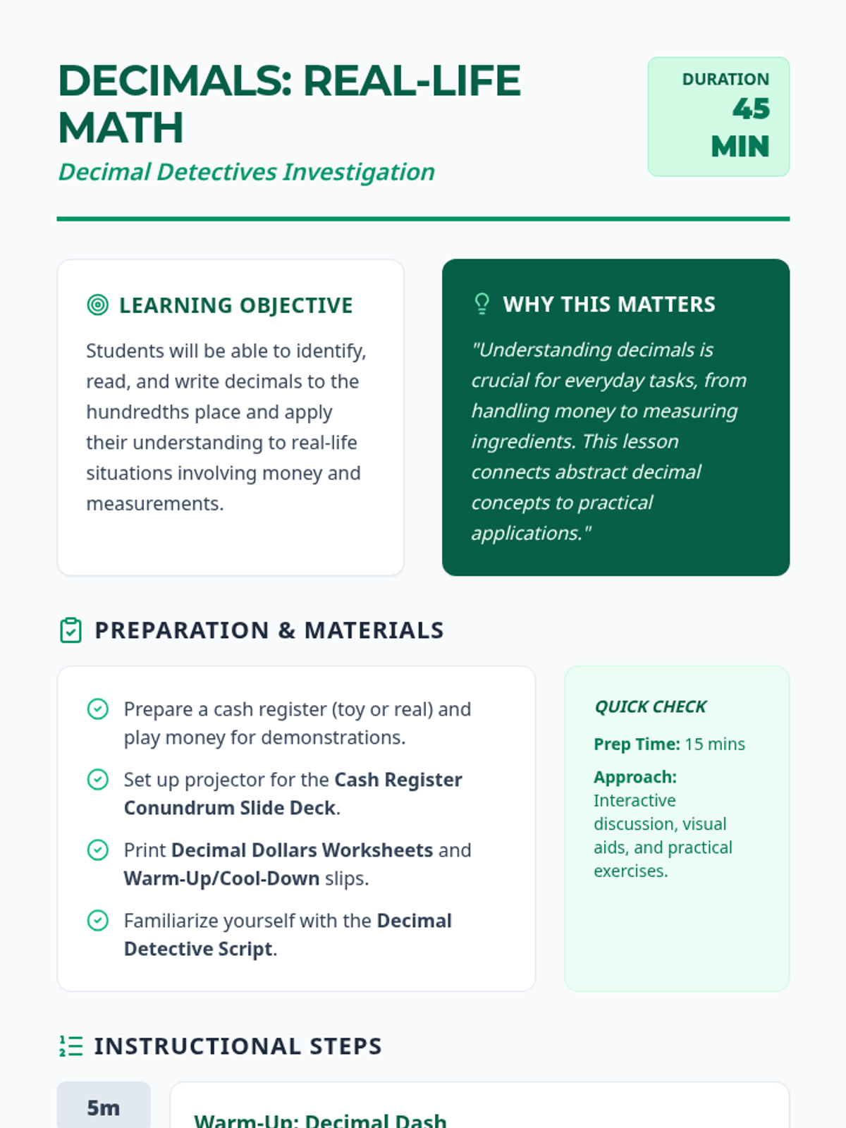 A 45-minute lesson for 5th graders connecting abstract decimal concepts to real-world applications like money, measurements, and sports statistics. Students act as 'Decimal Detectives' to uncover the importance of tenths and hundredths in everyday life.