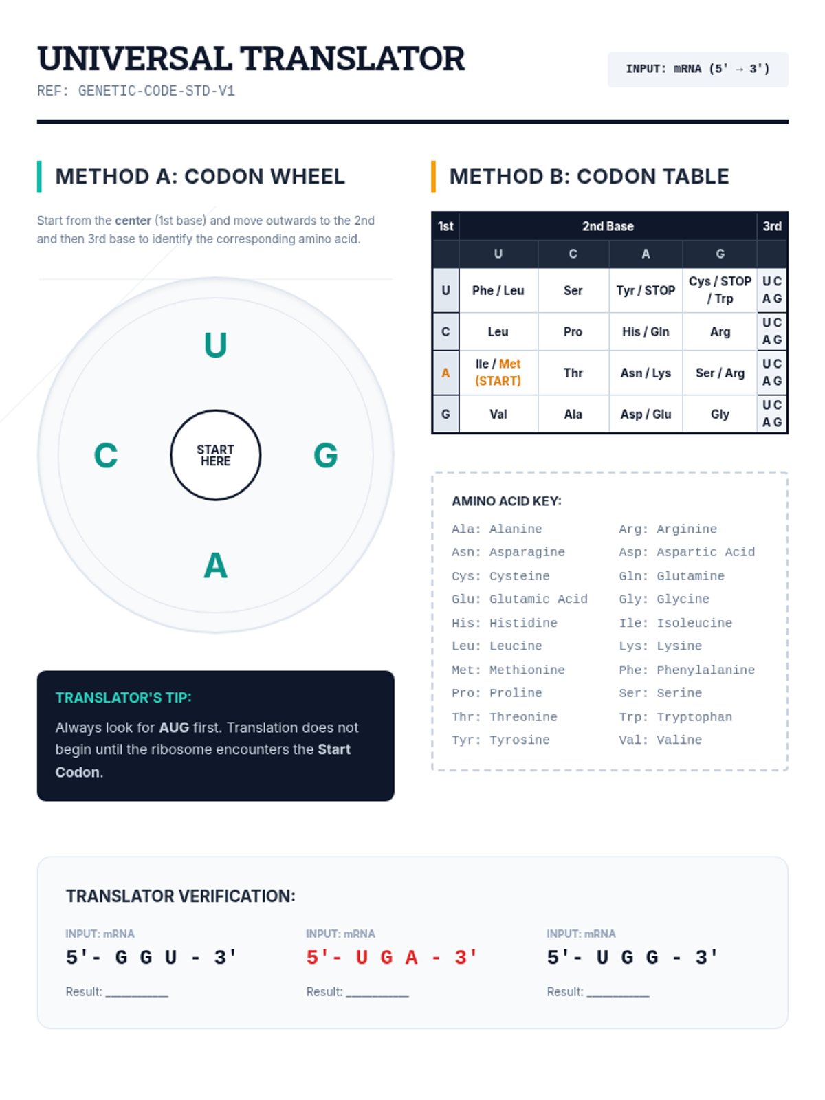 Students explore the universality and redundancy of the genetic code by using codon charts to translate mRNA sequences. They engage in exercises to identify start and stop codons and determine the impact of reading frames.