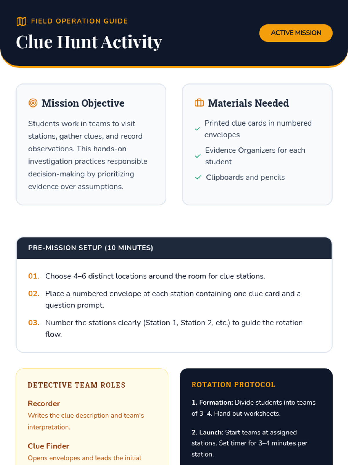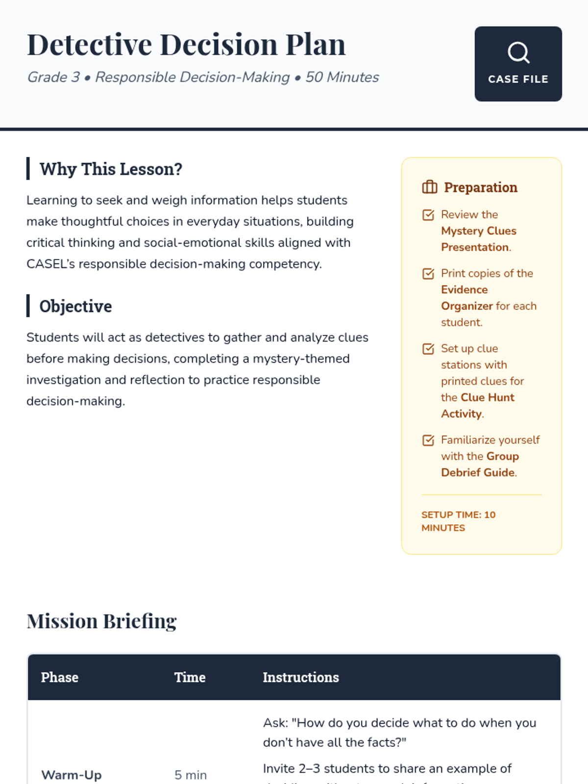 A 50-minute mystery-themed lesson for 3rd graders that teaches responsible decision-making by training students as 'Decision Detectives' who gather and evaluate evidence before making choices.