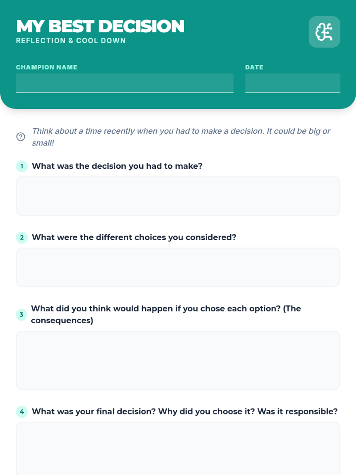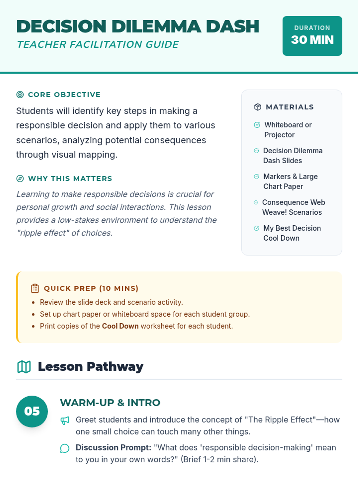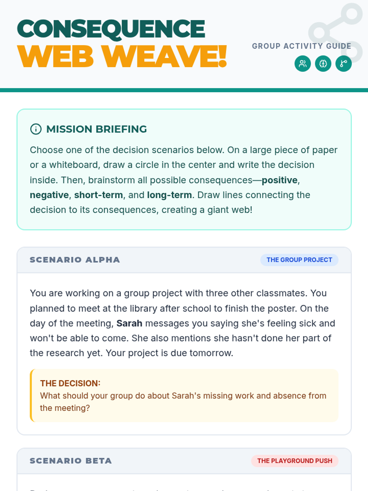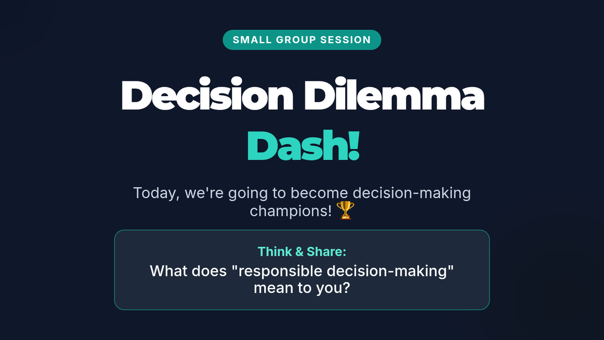 An engaging 30-minute Tier 2 group lesson for 5th graders focused on responsible decision-making. Students use 'Consequence Webs' to map out the ripple effects of their choices in various real-world scenarios.