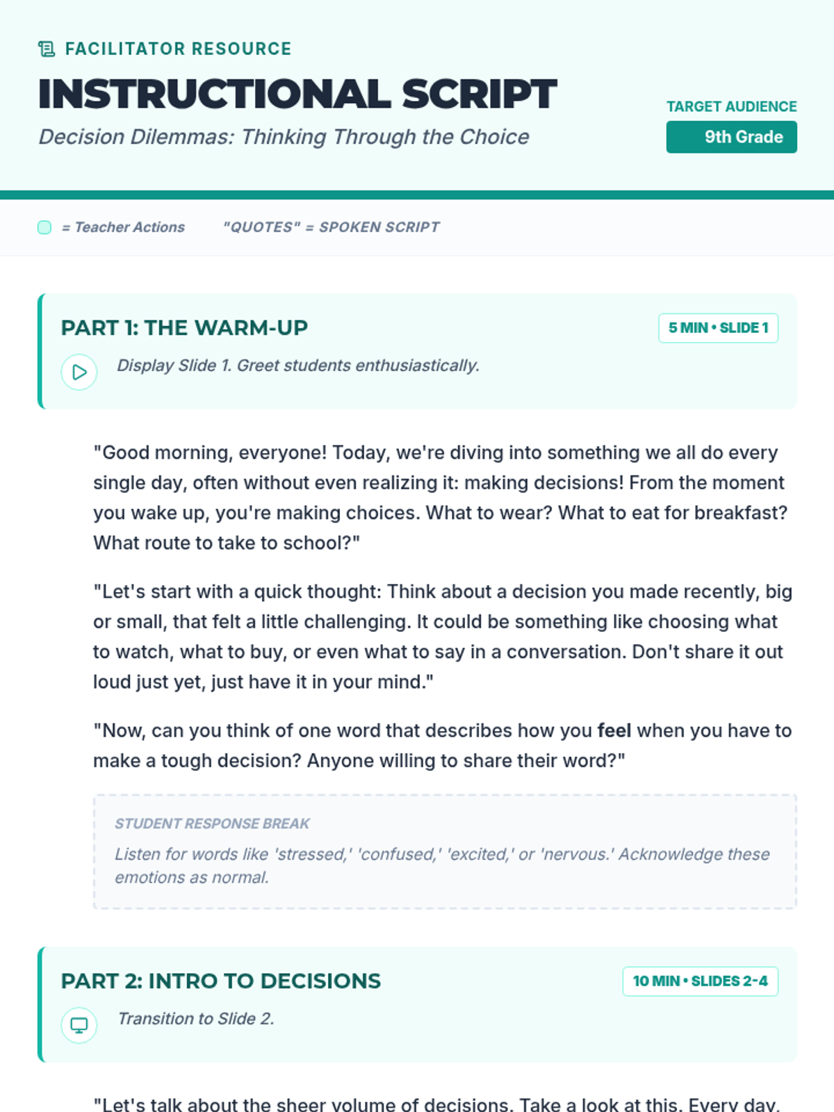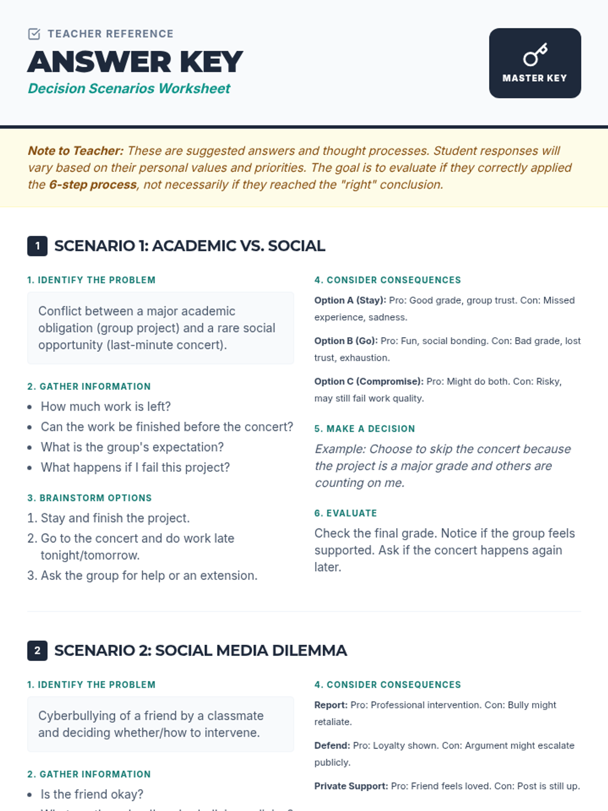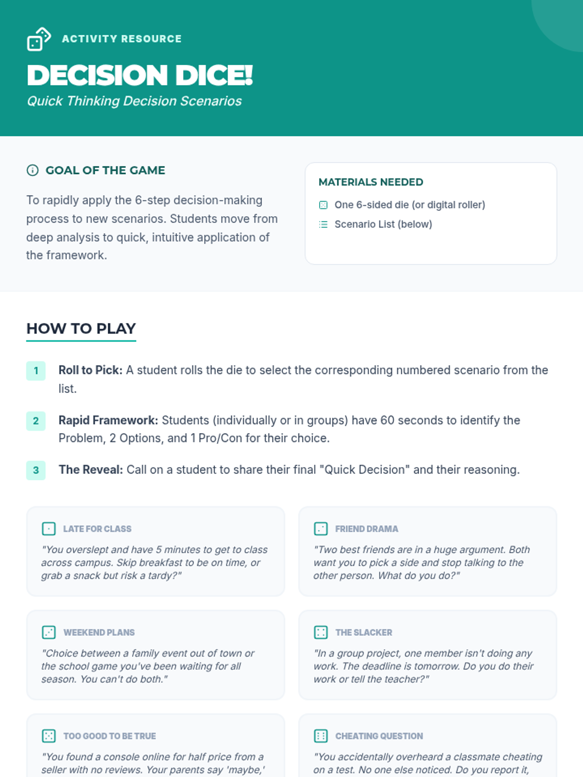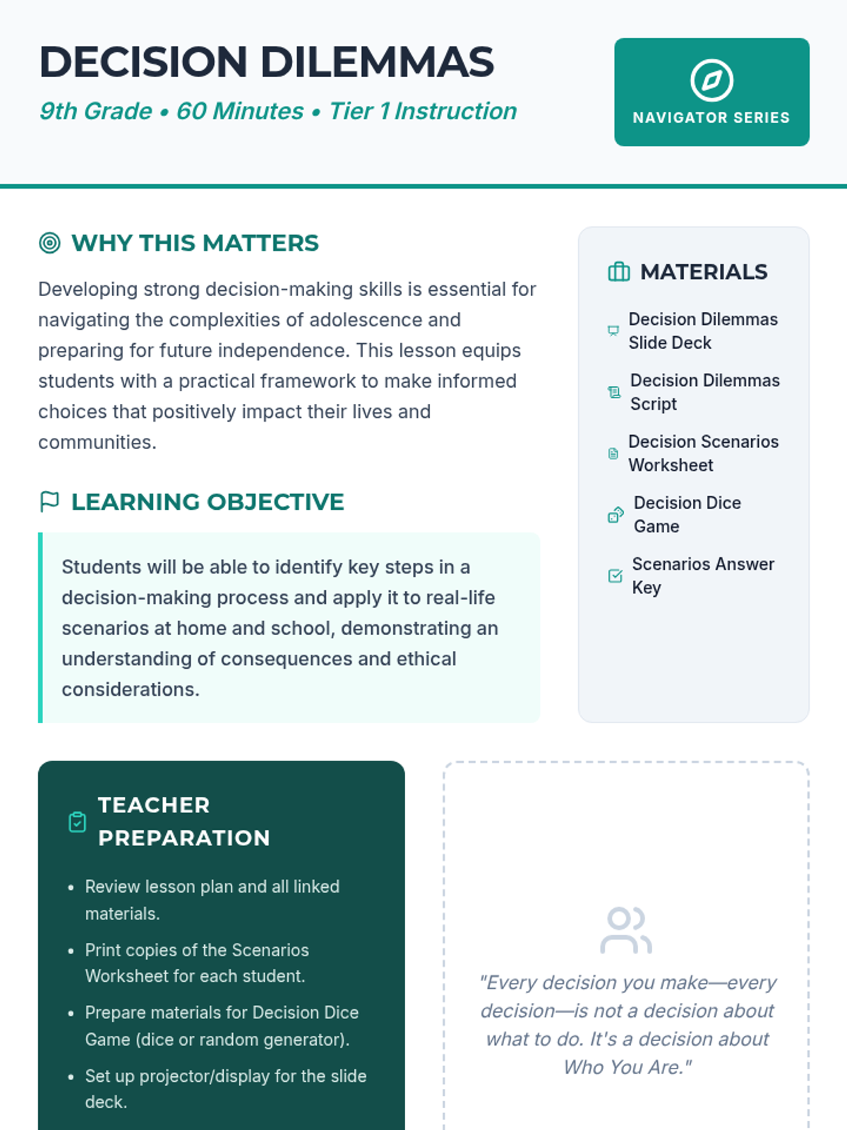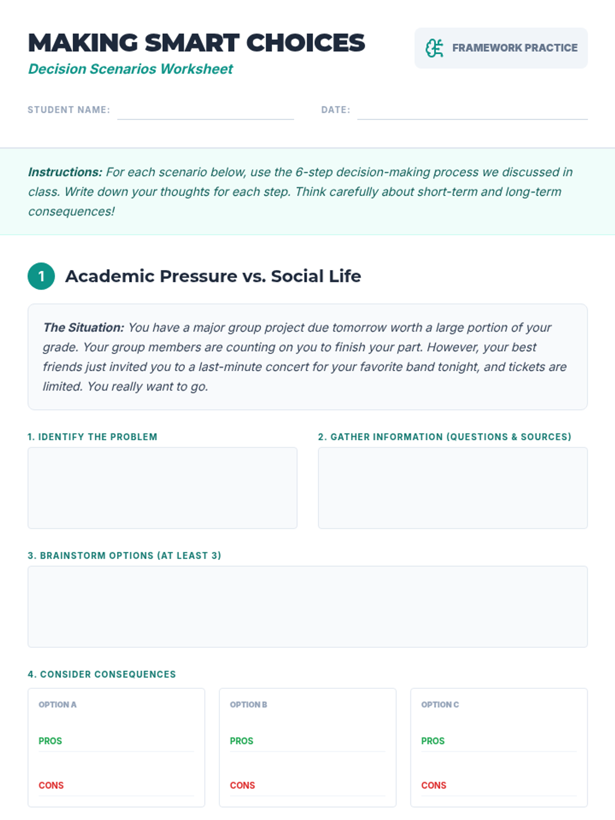 A 60-minute lesson for 9th graders focusing on a 6-step framework for thoughtful and responsible decision-making. Students will practice applying this structured approach to real-life scenarios through discussion, worksheets, and a dynamic game.