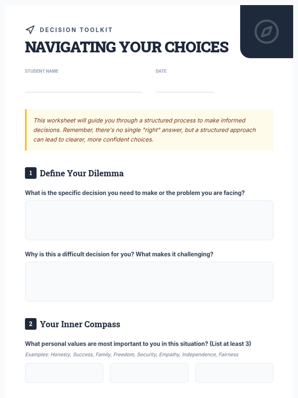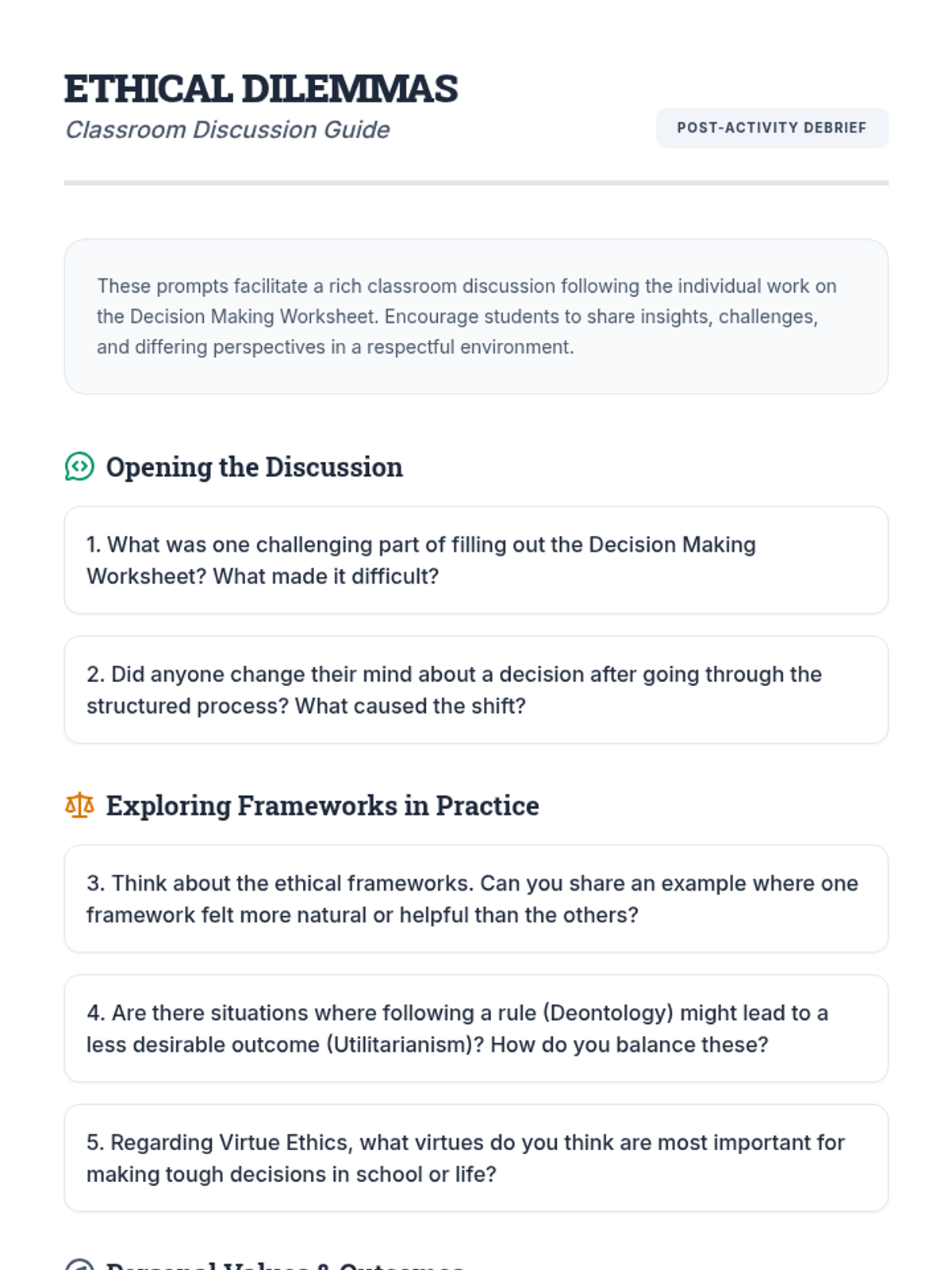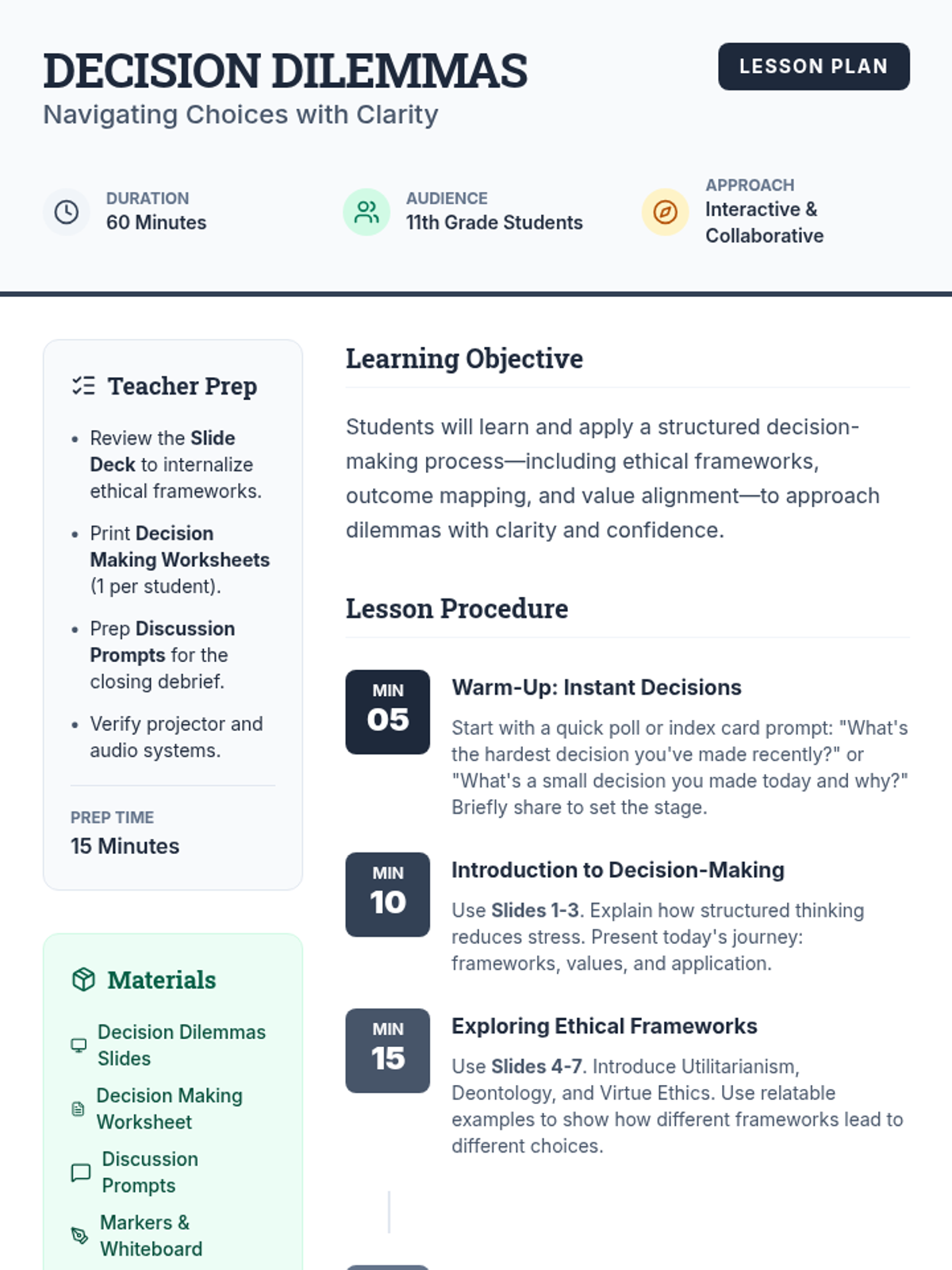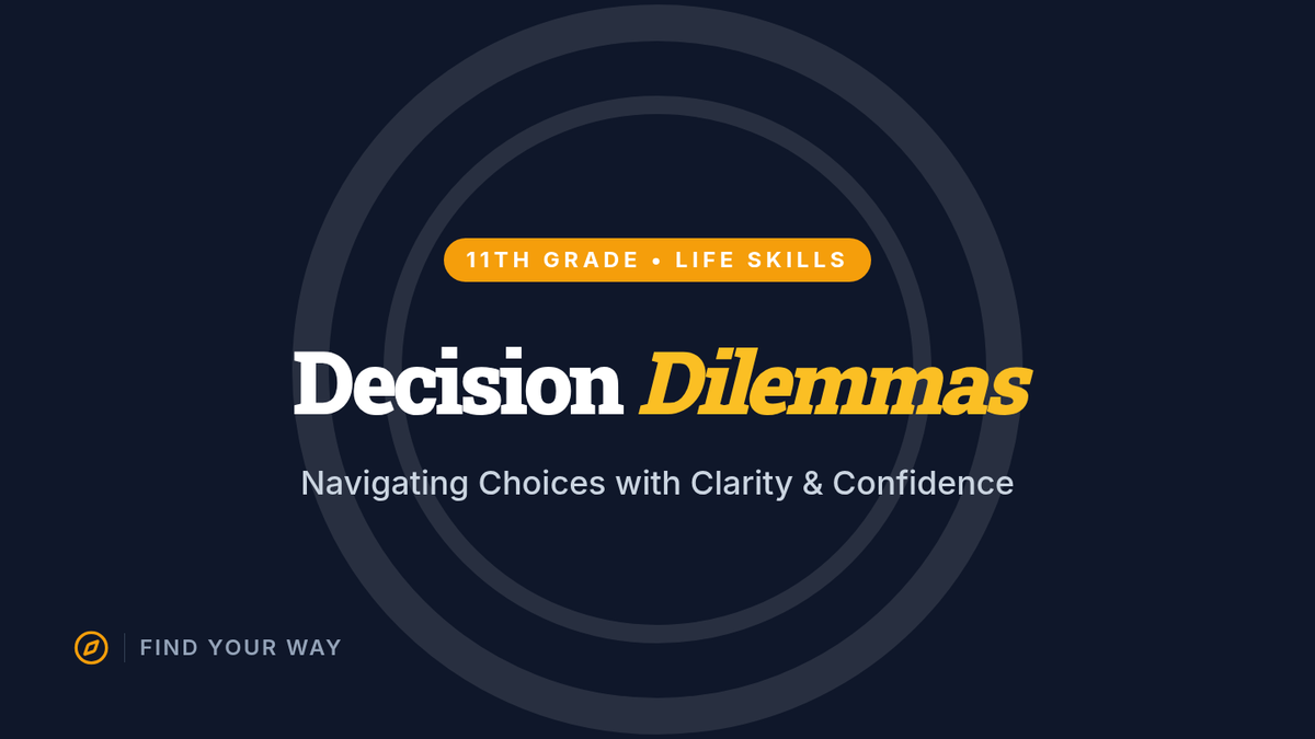 A structured lesson for 11th graders on informed decision-making, exploring ethical frameworks, personal values, and potential outcomes to navigate life's dilemmas with confidence.