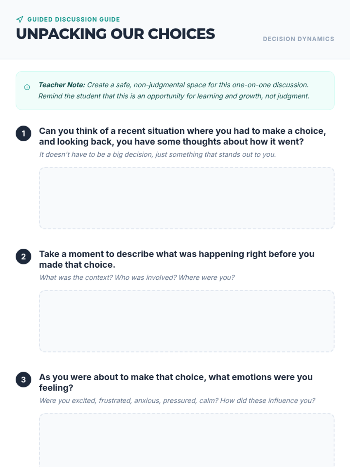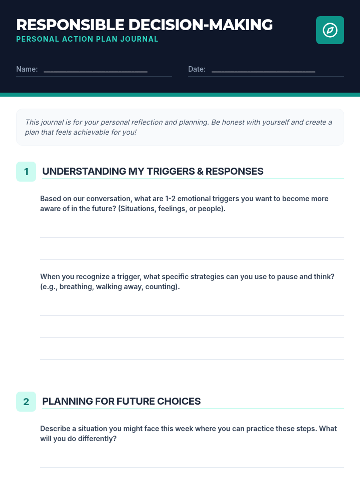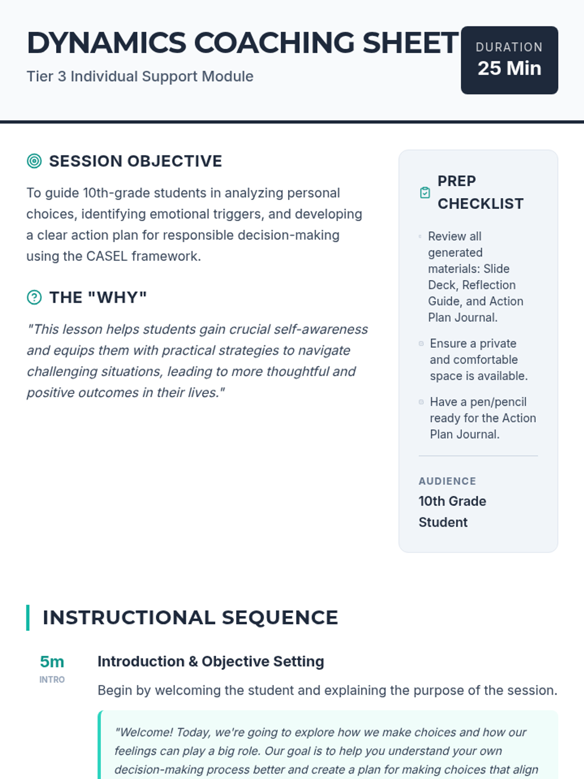 A one-on-one coaching module for 10th-grade students focused on analyzing personal choices, identifying emotional triggers, and developing action plans for responsible decision-making.