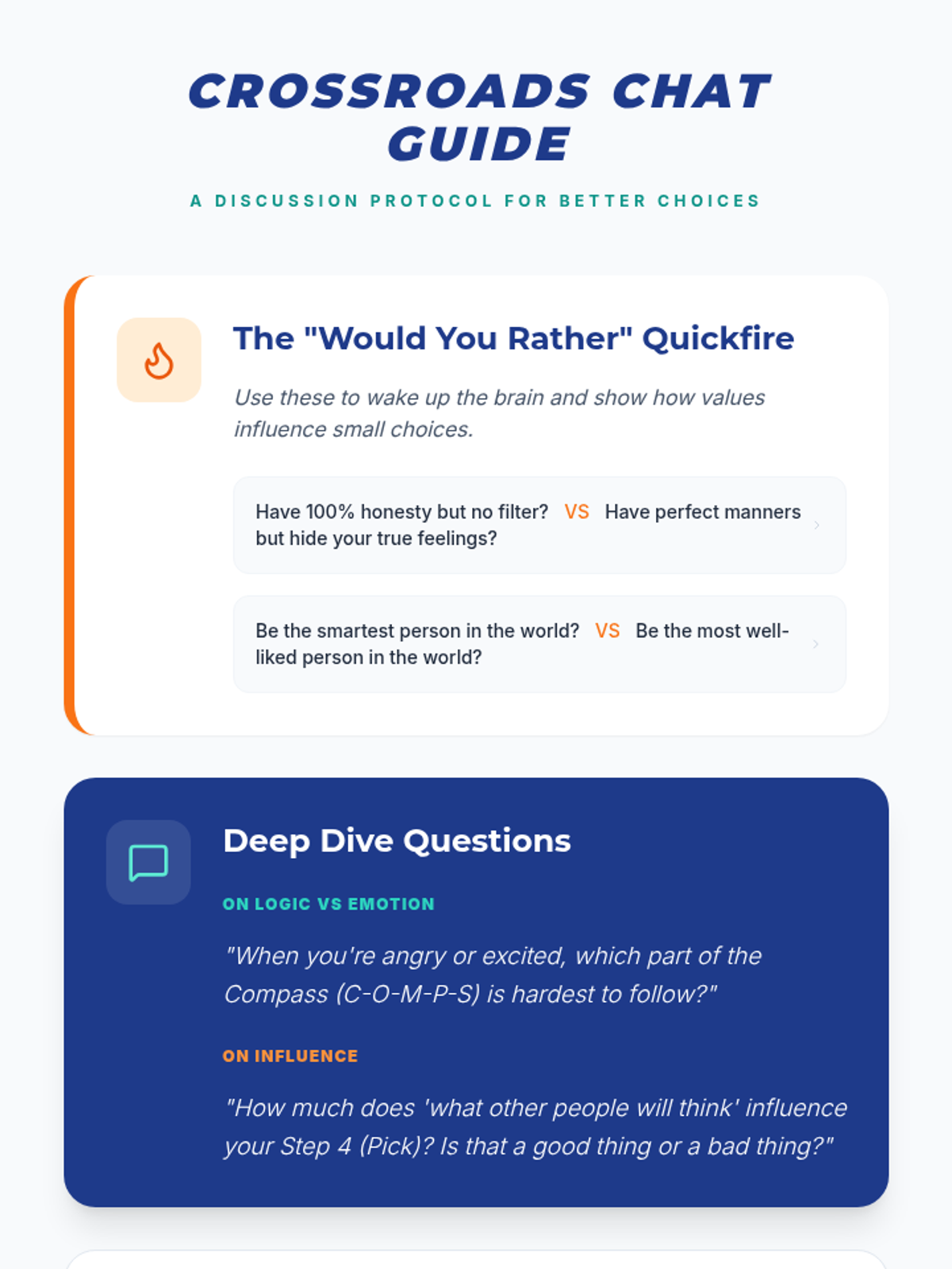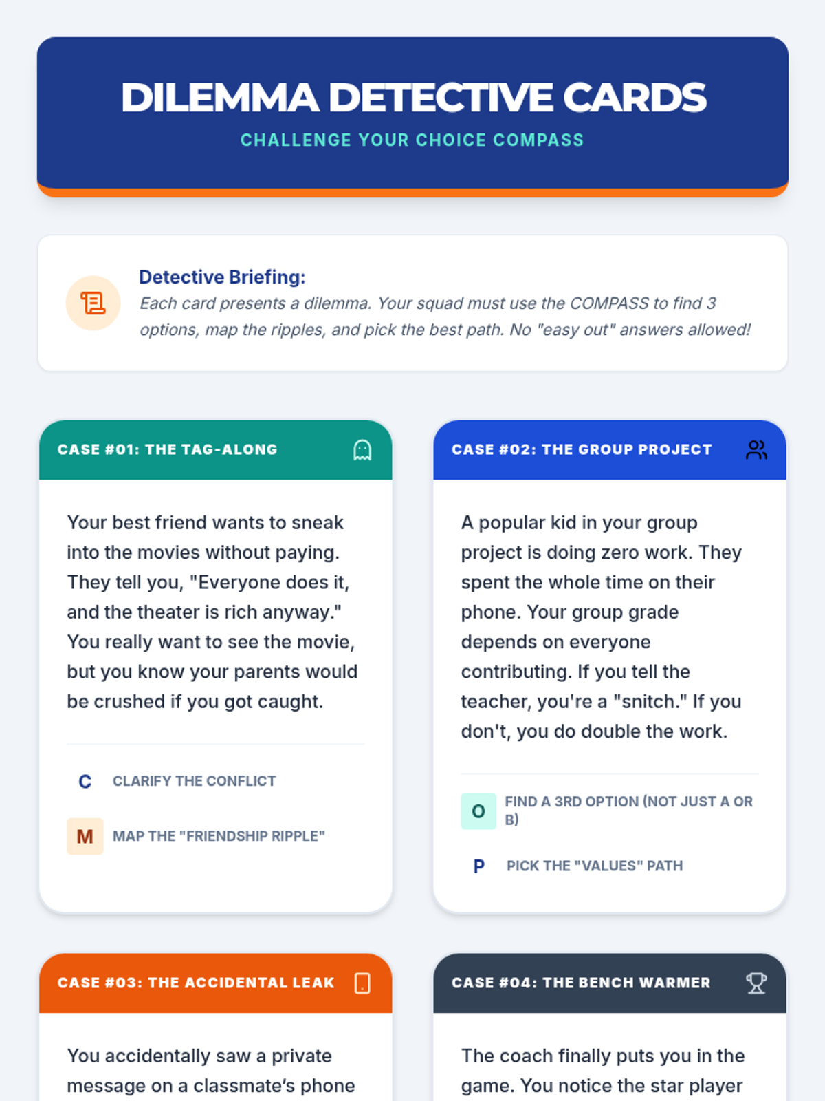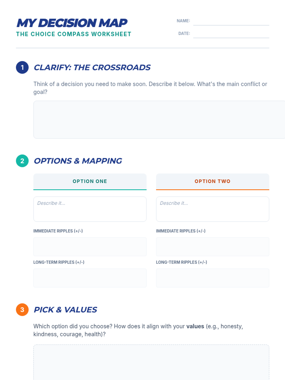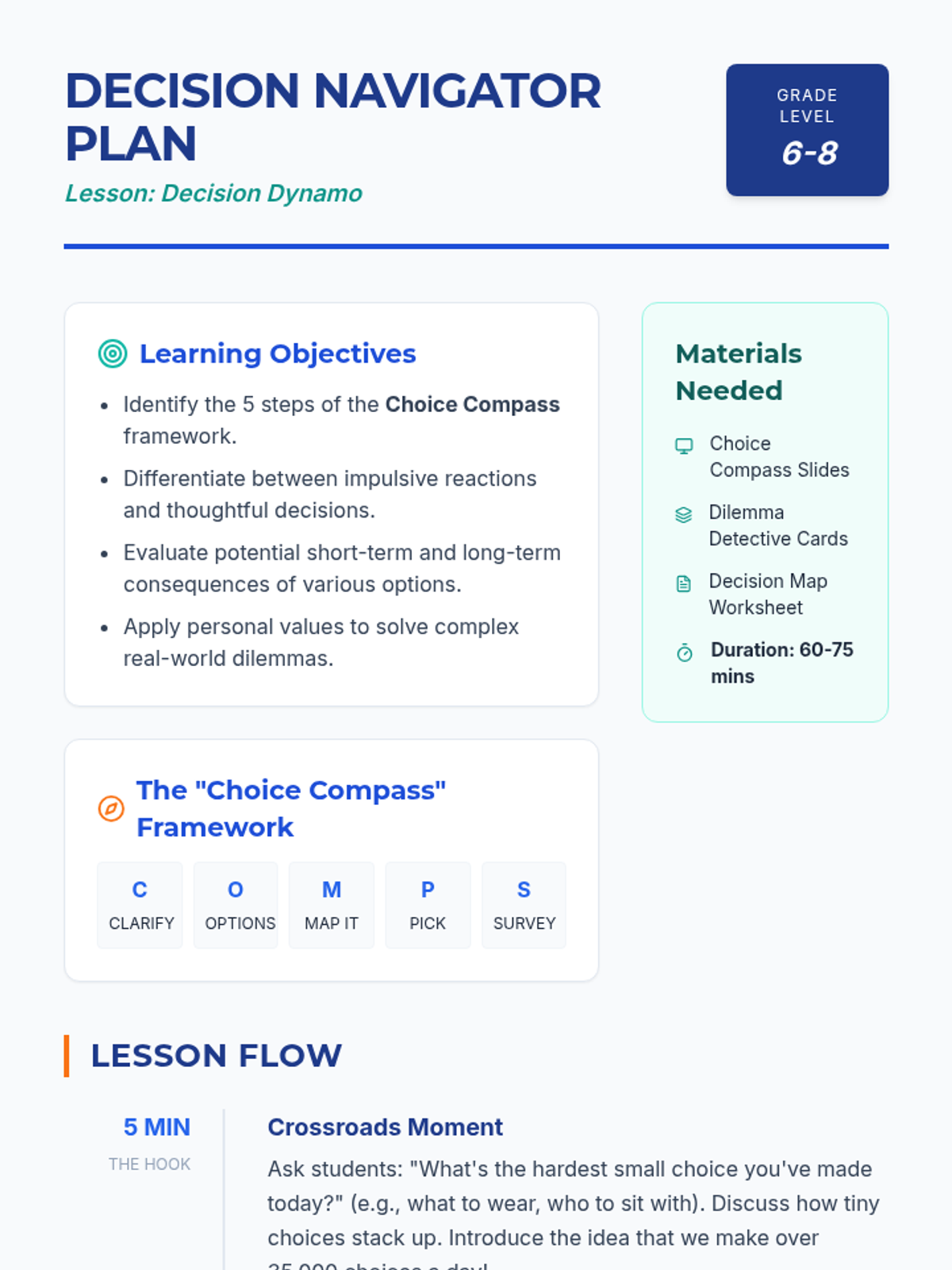 A comprehensive lesson for middle schoolers on structured decision-making, using the 'Choice Compass' framework to evaluate options and consequences.