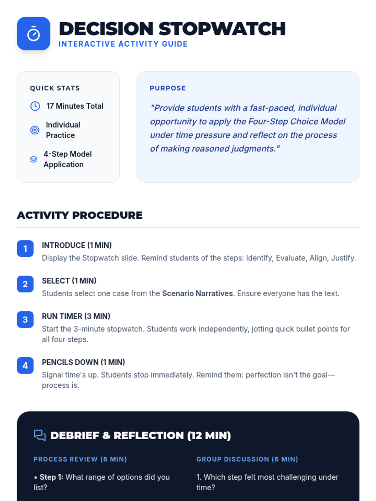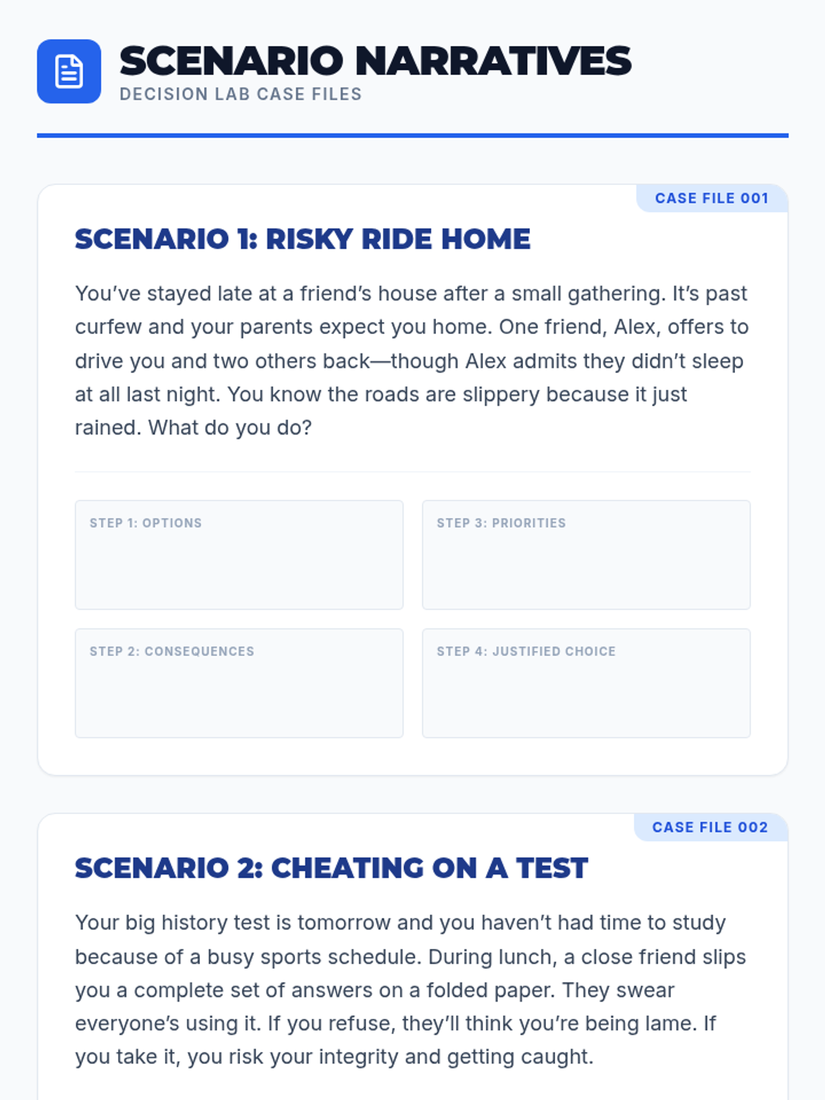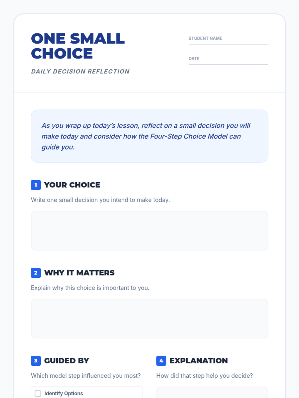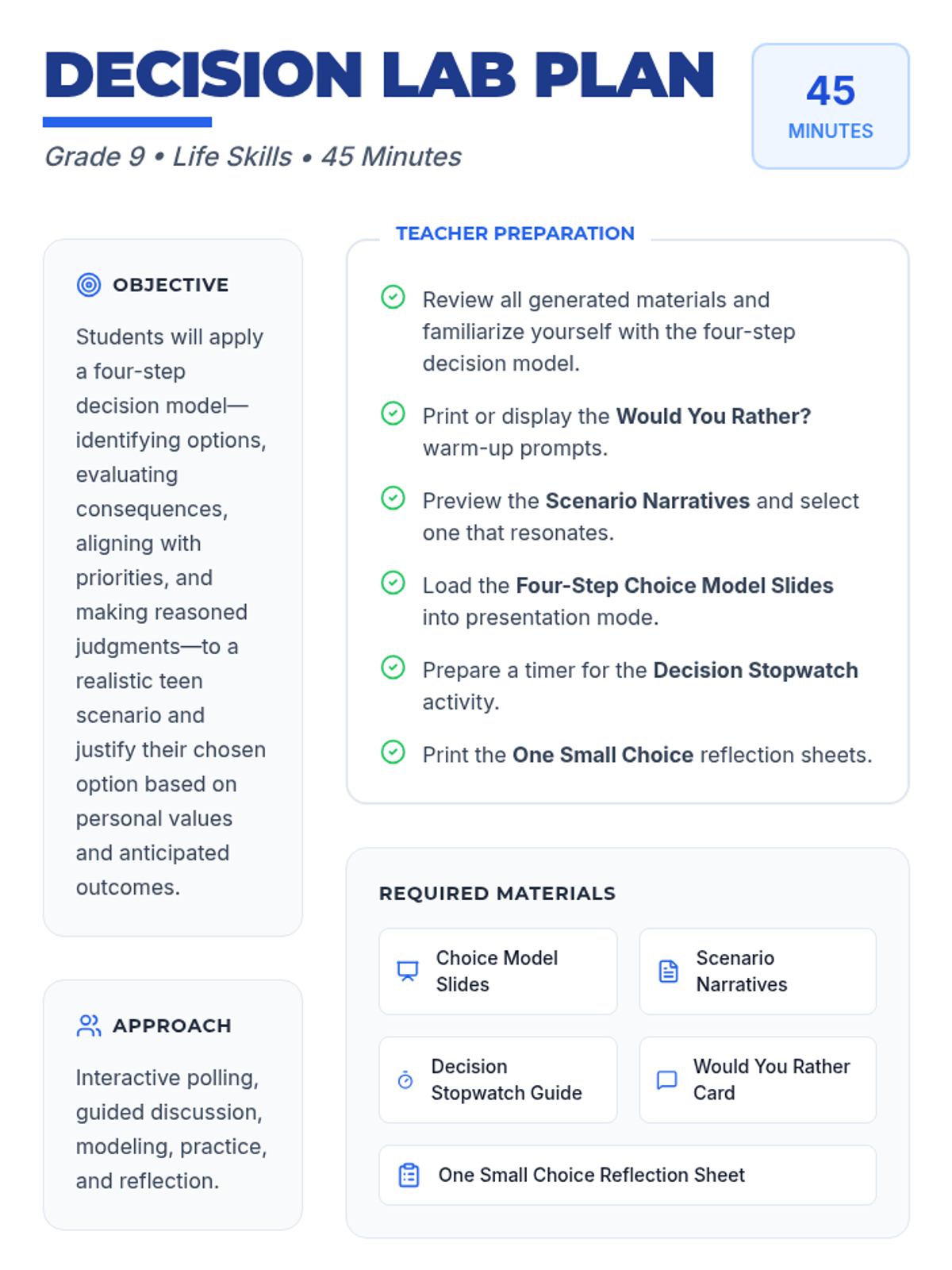 A 45-minute life skills lesson for 9th graders focusing on a four-step decision-making model to evaluate consequences and align choices with personal values.