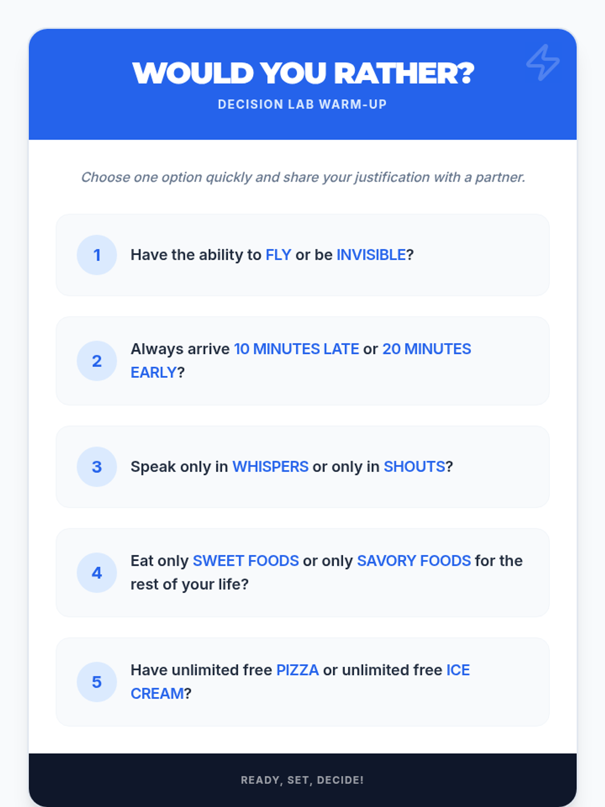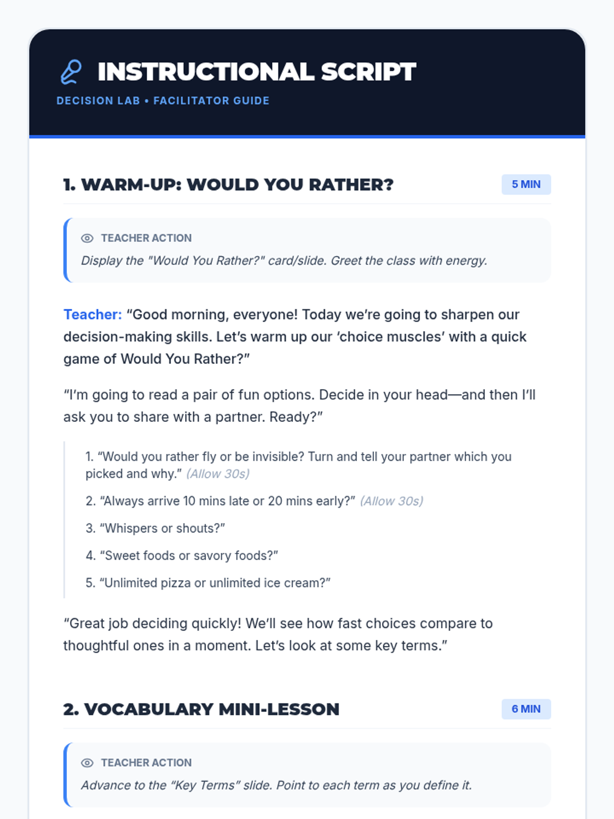 Reframes delayed gratification as a strategic investment. Students analyze the 'ROI' of their time and credits, participating in a simulation that mirrors real-world economic and academic trade-offs.