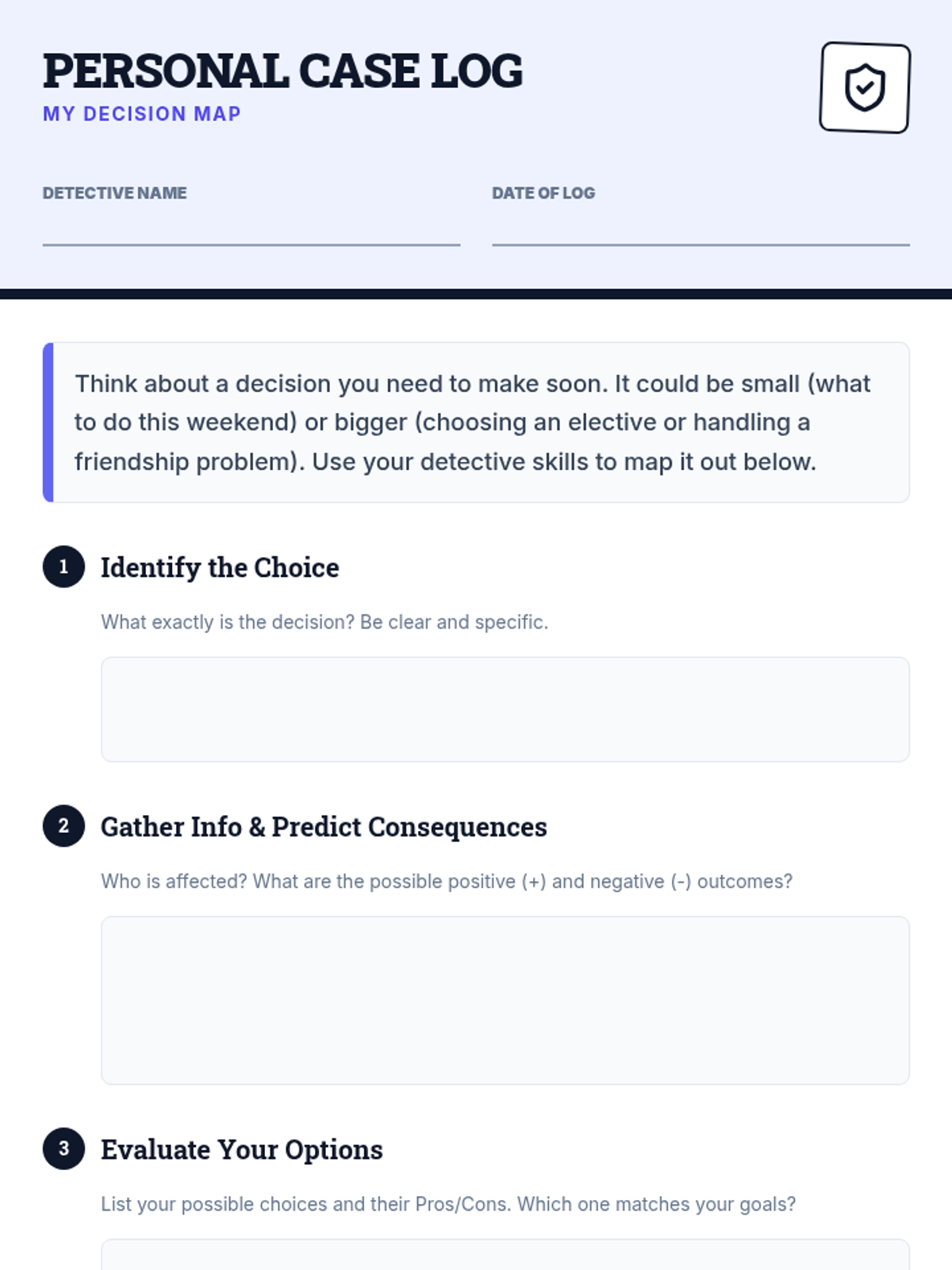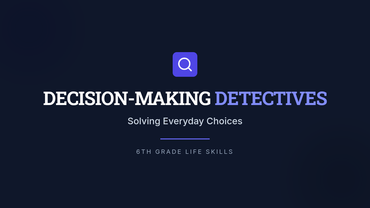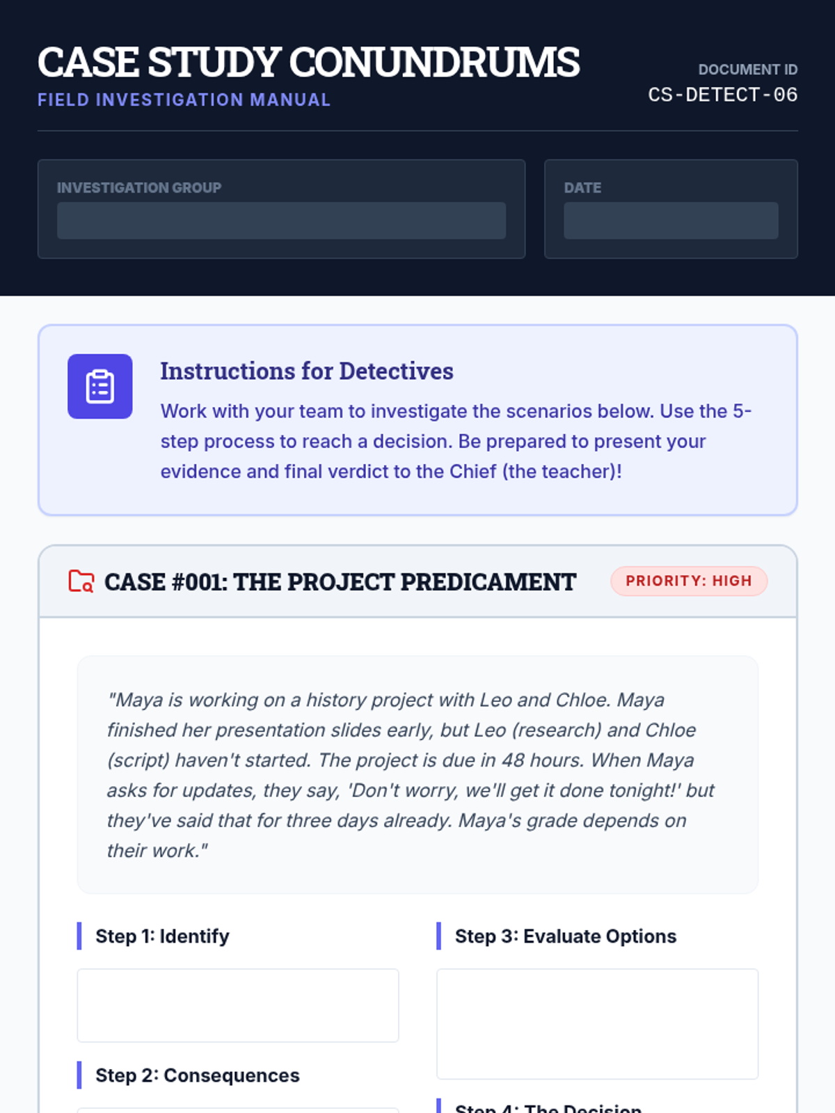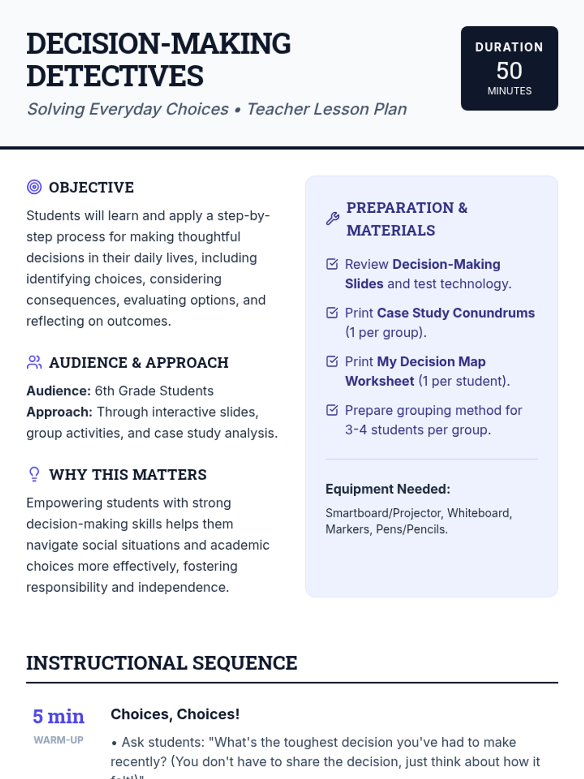 A 50-minute lesson for 6th graders that teaches a structured 5-step decision-making process using interactive case studies and personal reflection. Students act as 'detectives' to investigate consequences and evaluate options for everyday social and academic scenarios.