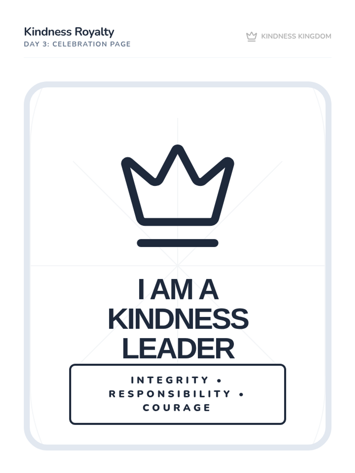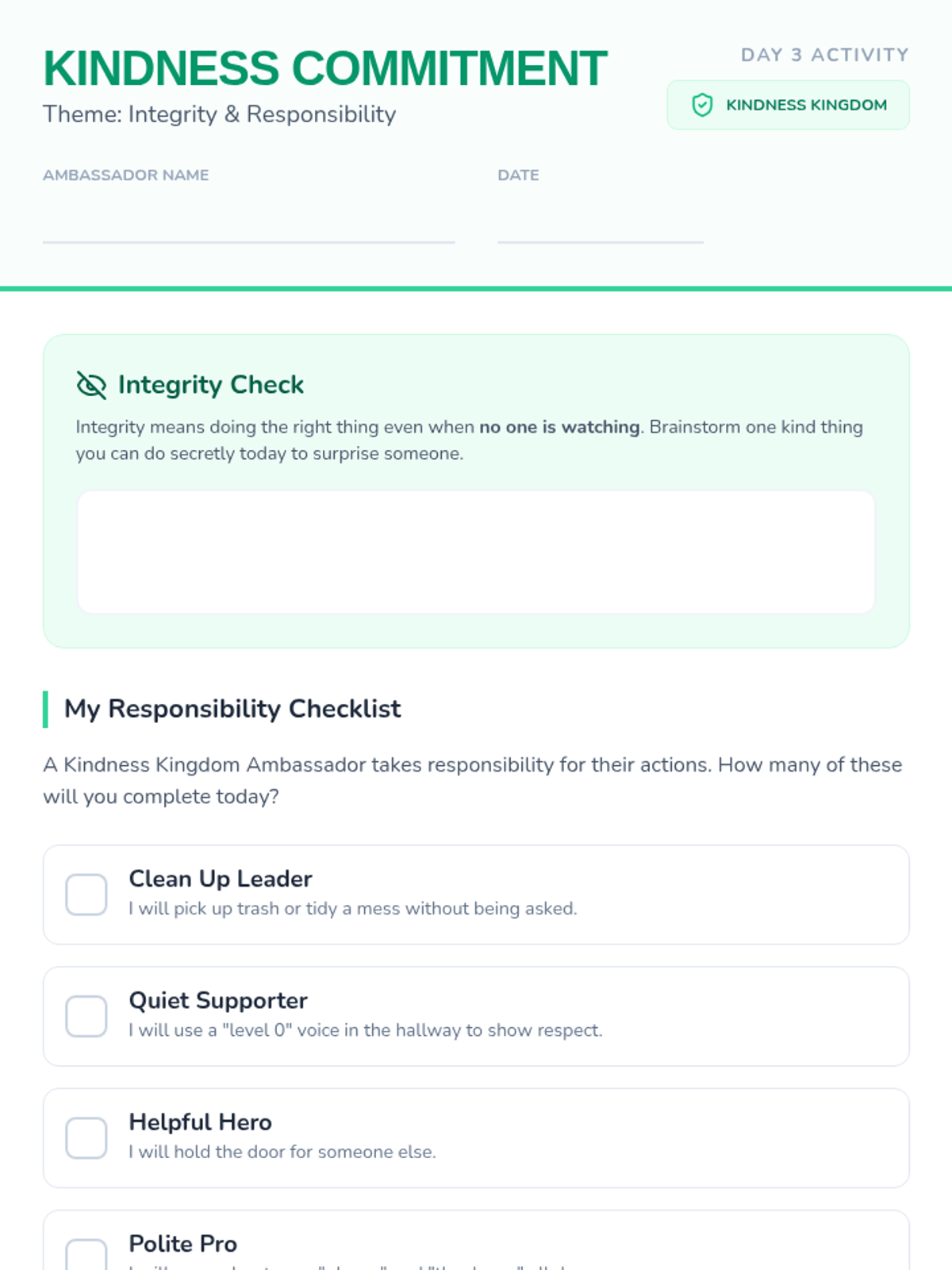 Explores integrity and responsibility by making personal commitments to kindness and identifying ways to act kindly even when no one is watching.