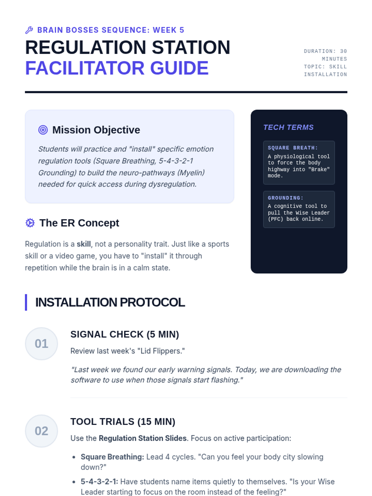 A 30-minute Tier 2 small group intervention for 5th graders focused on identifying emotions and learning regulation strategies like deep breathing, counting, and positive self-talk.