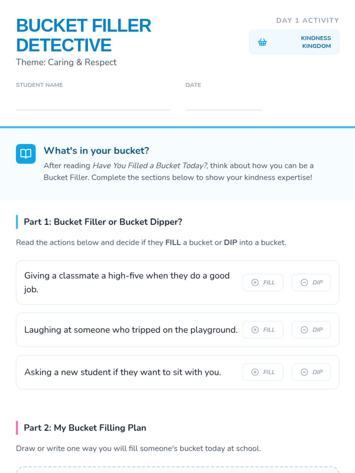 Students learn about caring and respect through the 'bucket filling' metaphor, identifying ways to be kind to others and themselves.