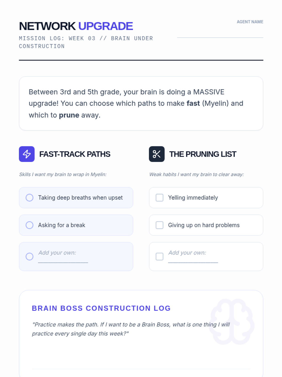 Learn how the 3rd-5th grade brain is "under construction," specifically looking at how practice makes connections faster and stronger through myelination and pruning.