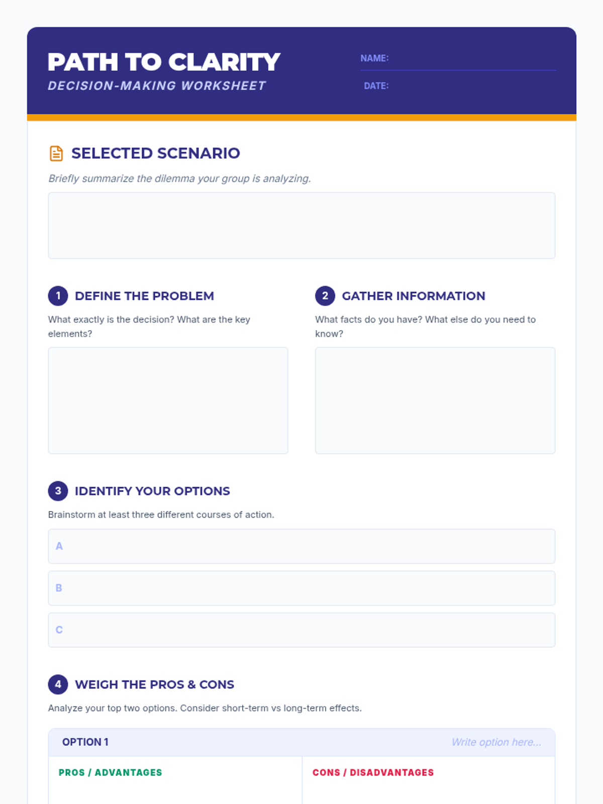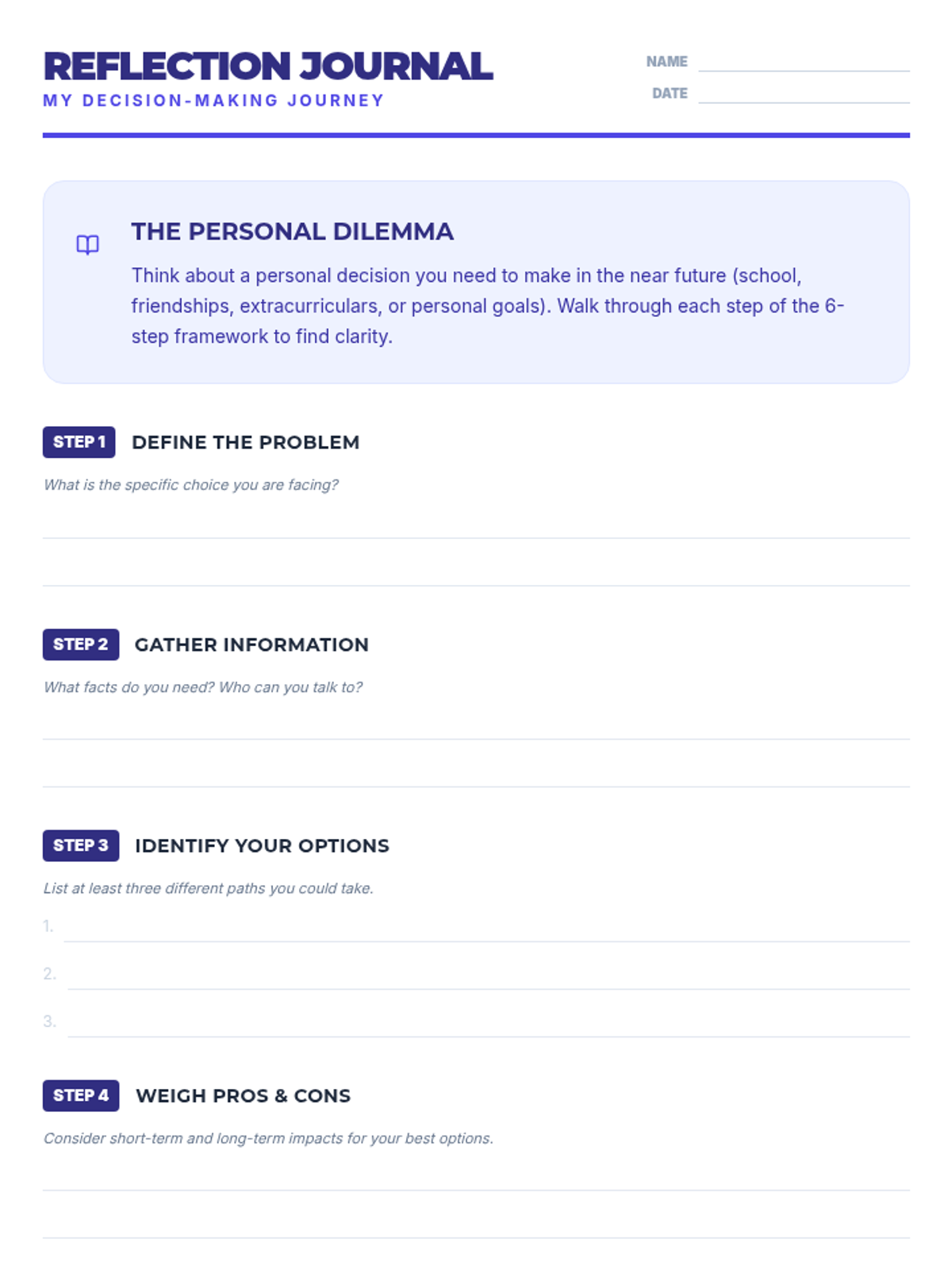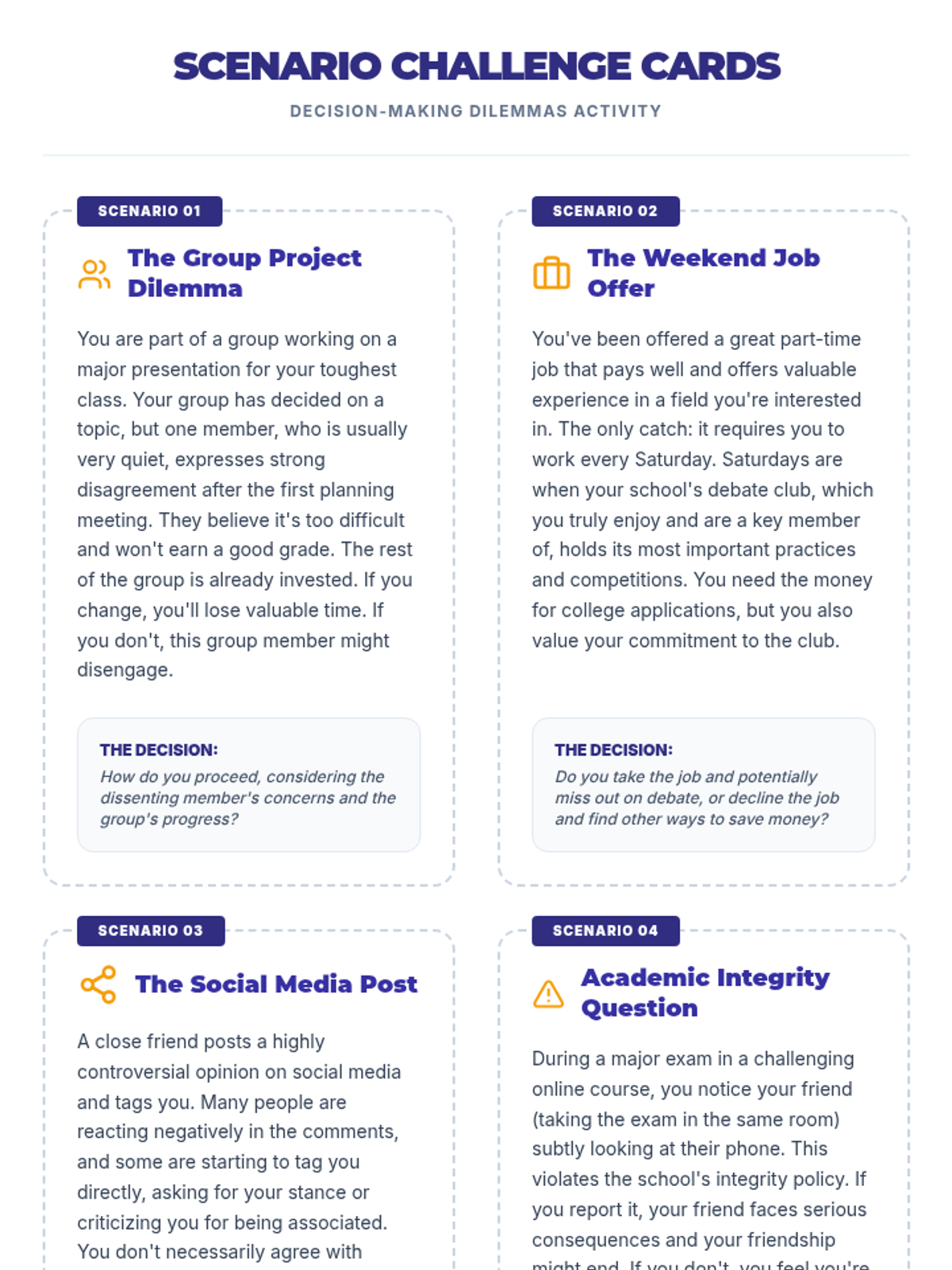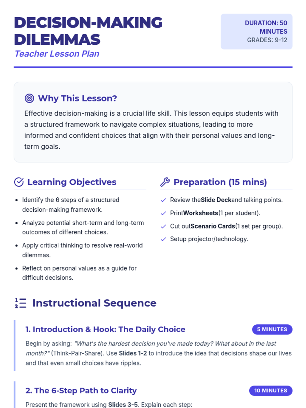 A 50-minute lesson for high schoolers using a 6-step framework to navigate complex real-world scenarios and make value-aligned decisions.
