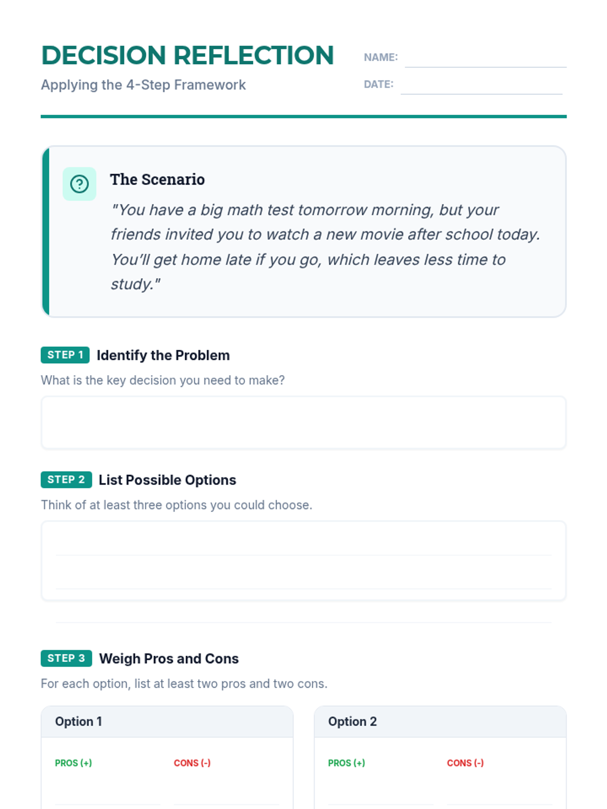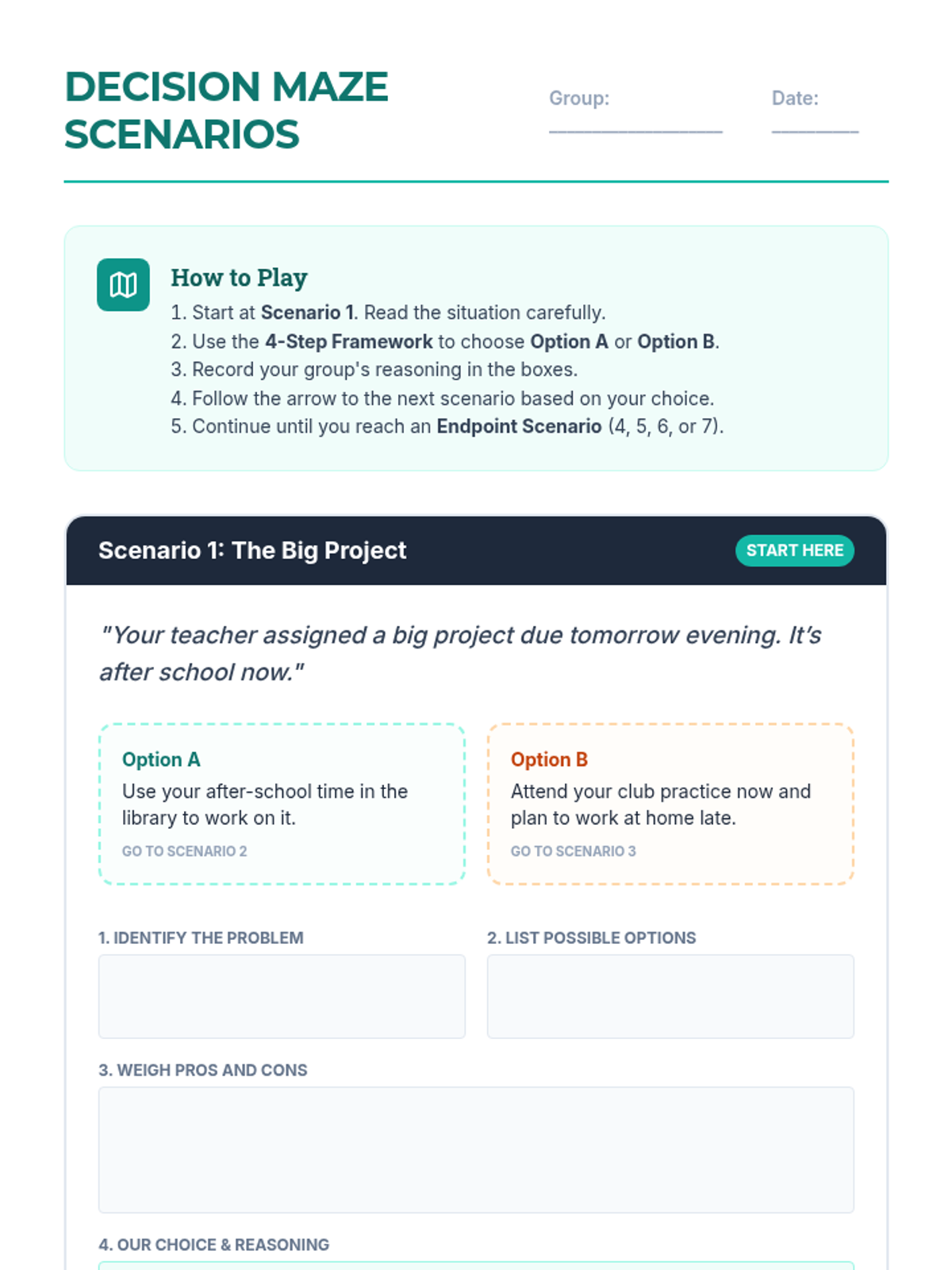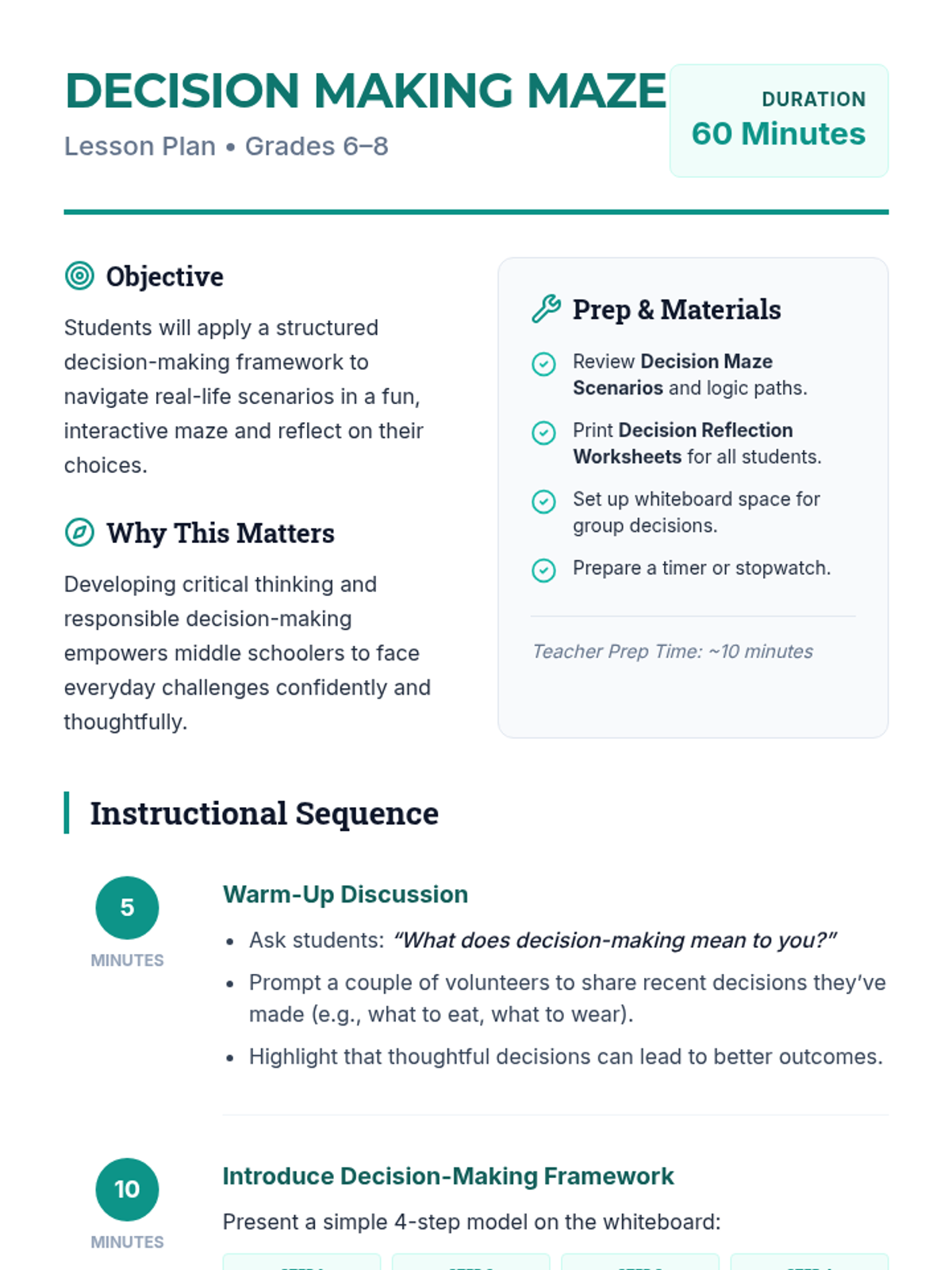 A scenario-driven lesson where middle school students navigate a 'Decision Making Maze' to practice critical thinking and responsible choices using a structured 4-step framework.