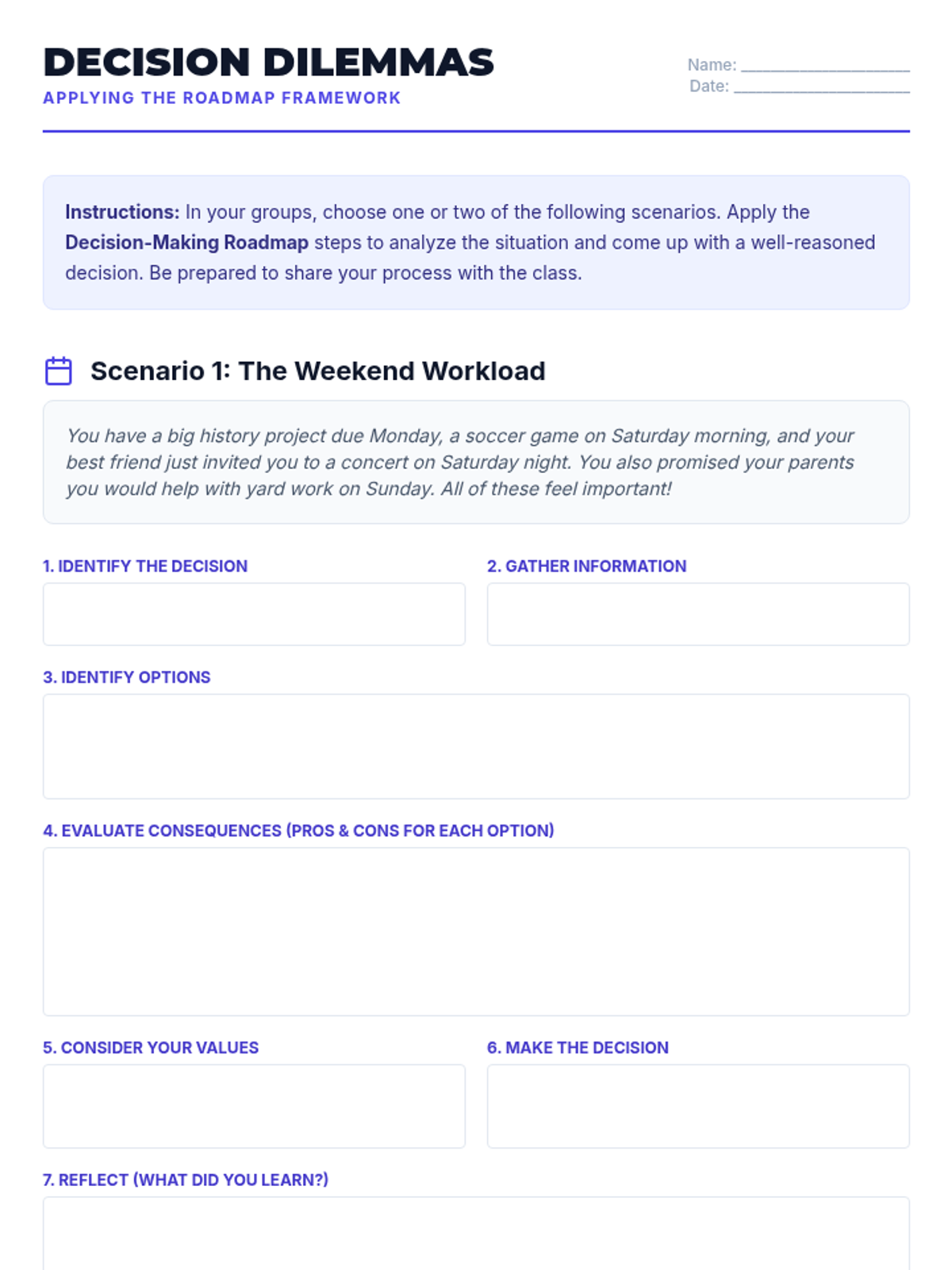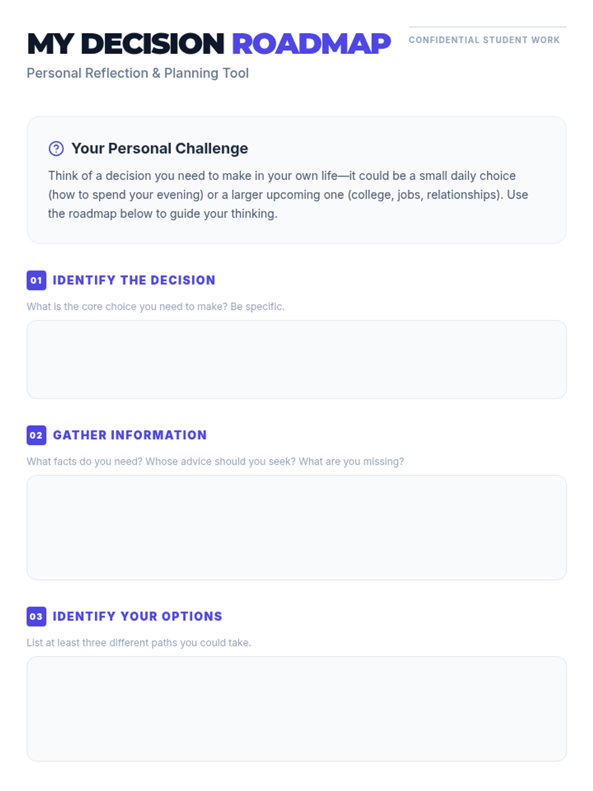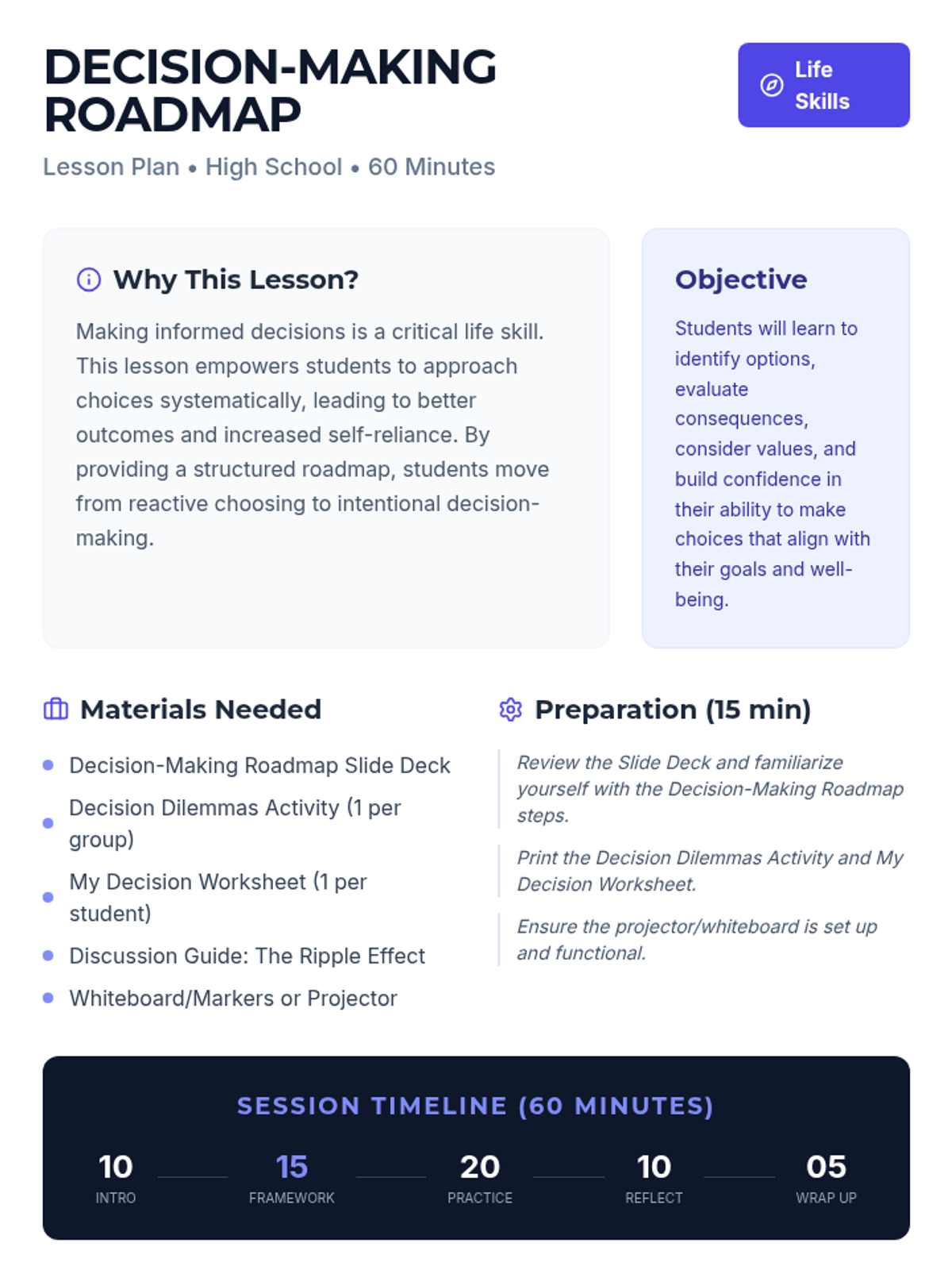 A 60-minute lesson for high school students focused on developing a structured decision-making process using a 'roadmap' framework to navigate personal and academic choices.