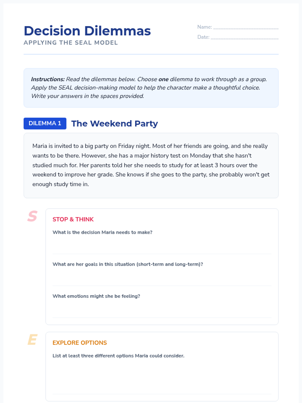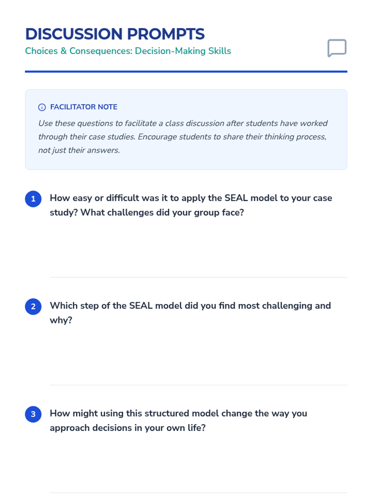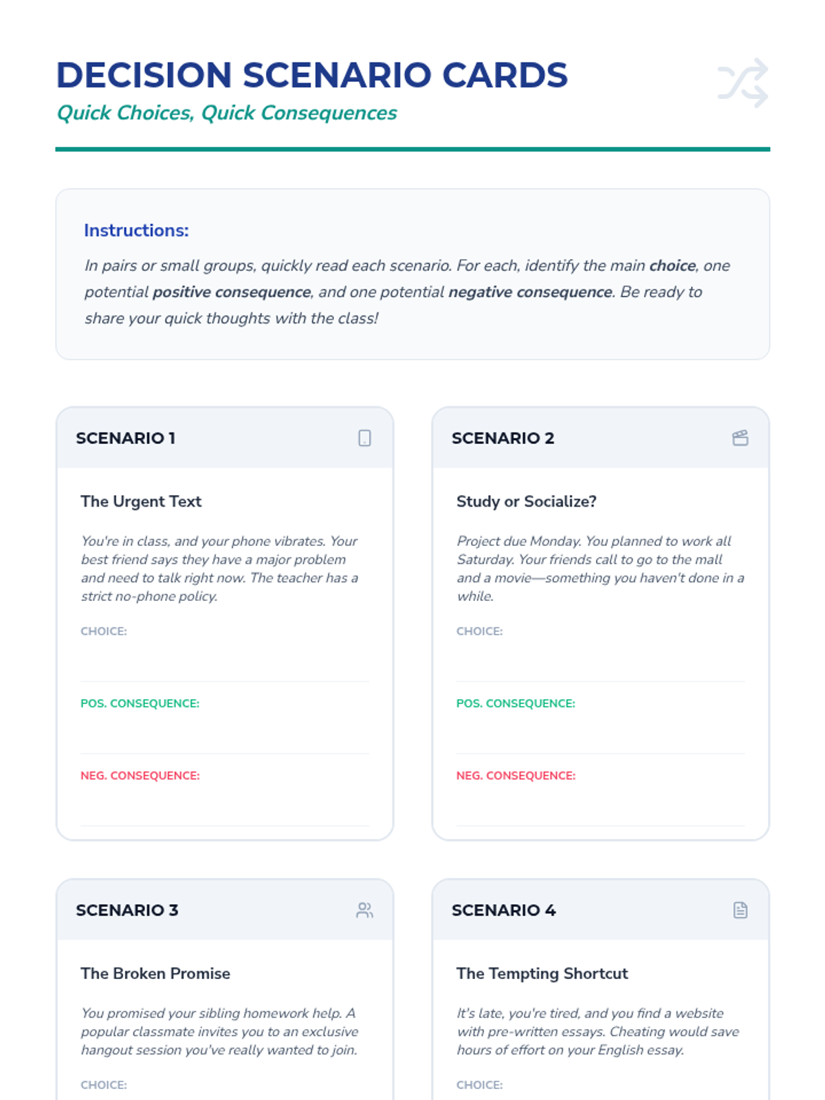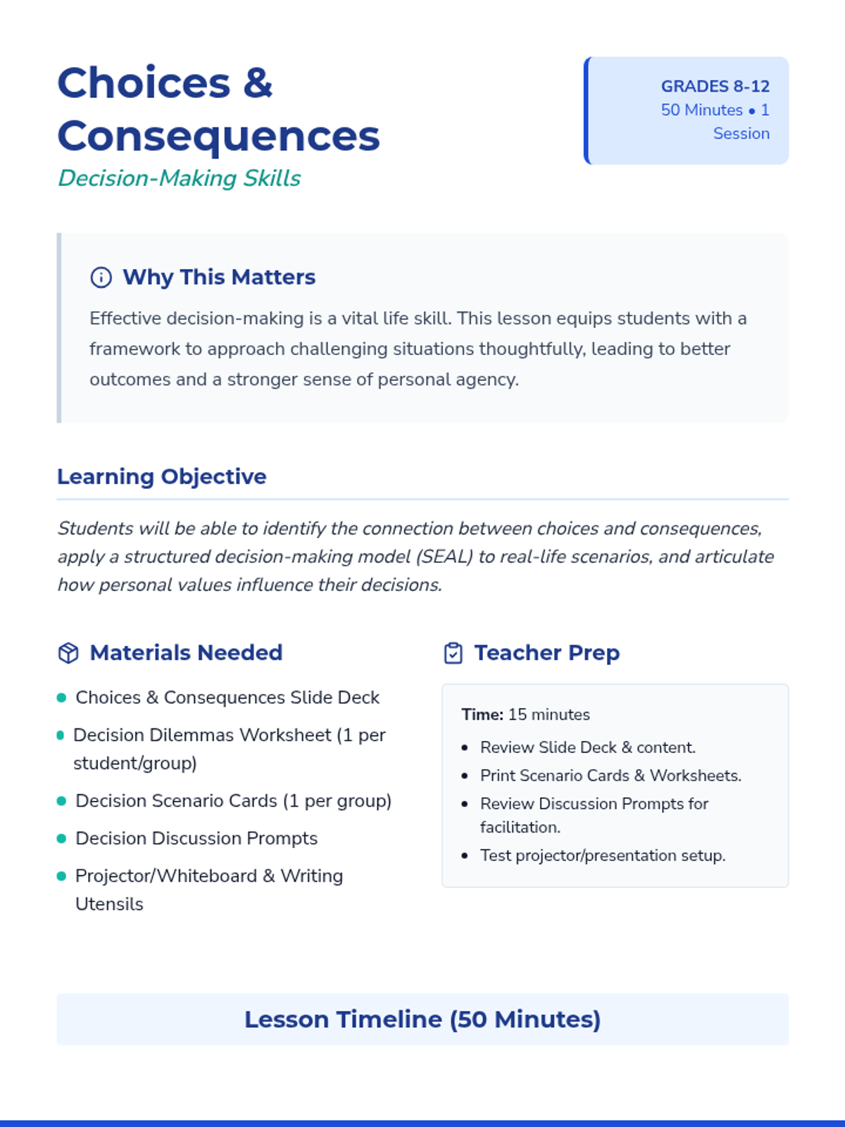 A comprehensive 50-minute lesson for grades 8-12 focused on the SEAL decision-making model. Students explore the connection between choices and consequences through scenarios, case studies, and structured reflection.