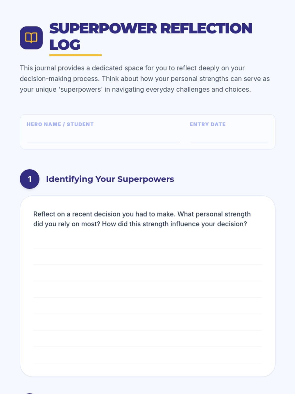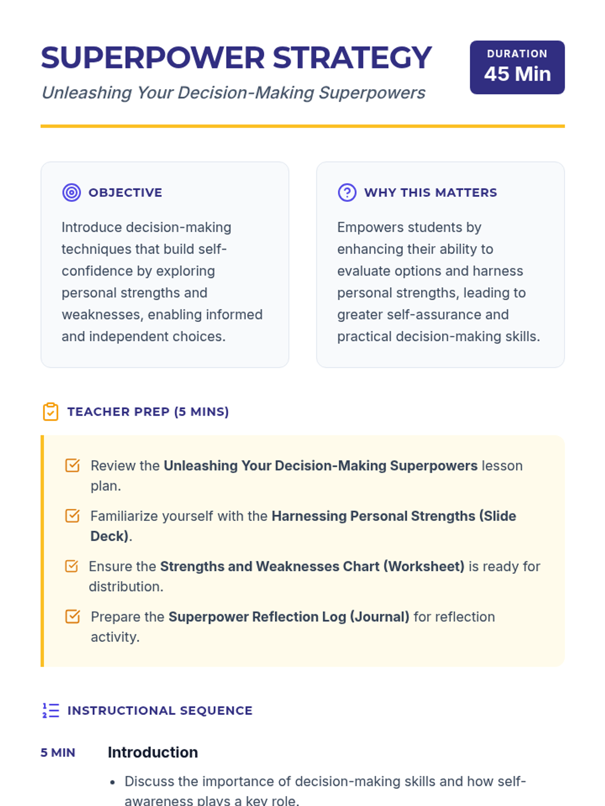 This lesson empowers 10th-grade students to enhance their decision-making by identifying personal strengths as 'superpowers' and acknowledging areas for growth. Through interactive slides and reflective writing, students build self-confidence and independence in their choices.