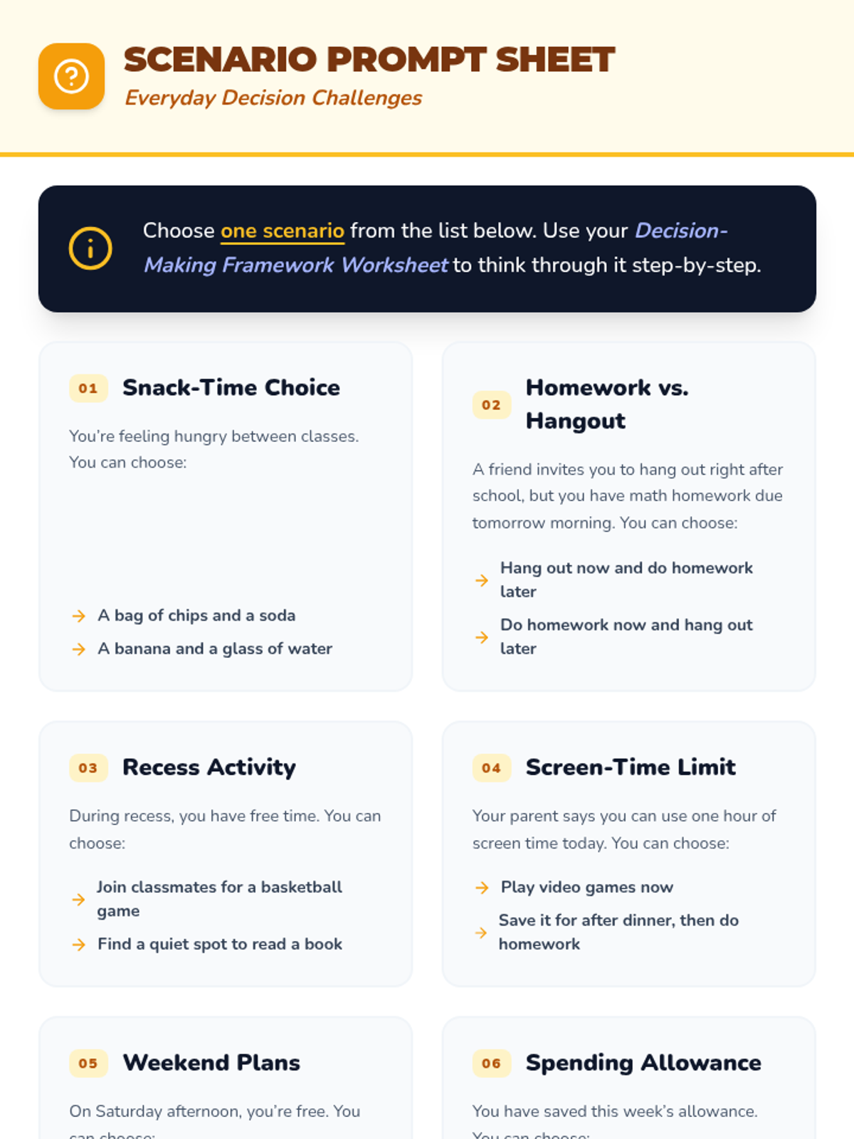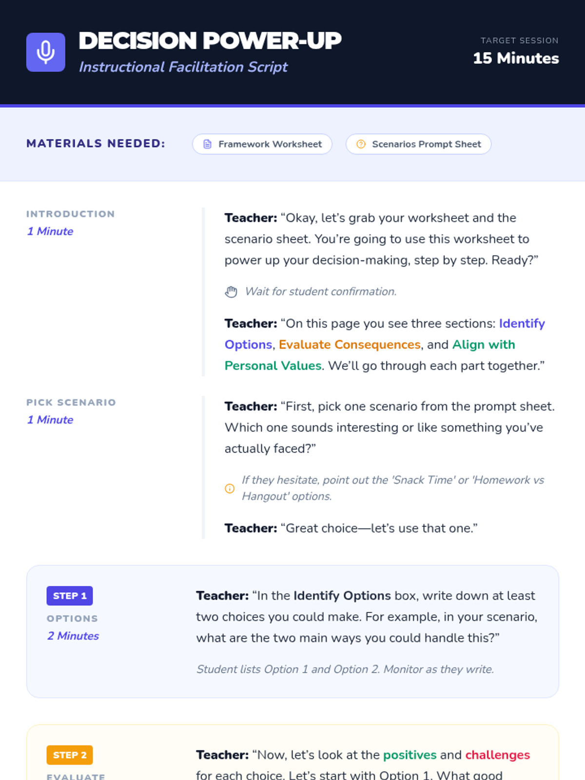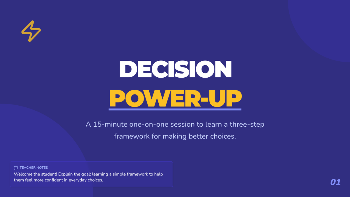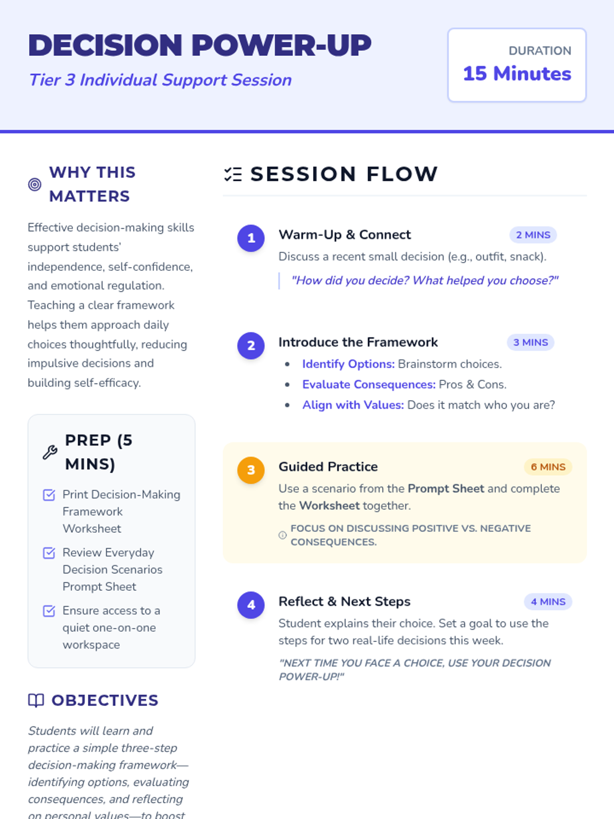 A 15-minute one-on-one Tier 3 session for 7th-grade students to master a three-step decision-making framework, building self-regulation and confidence in their daily choices.