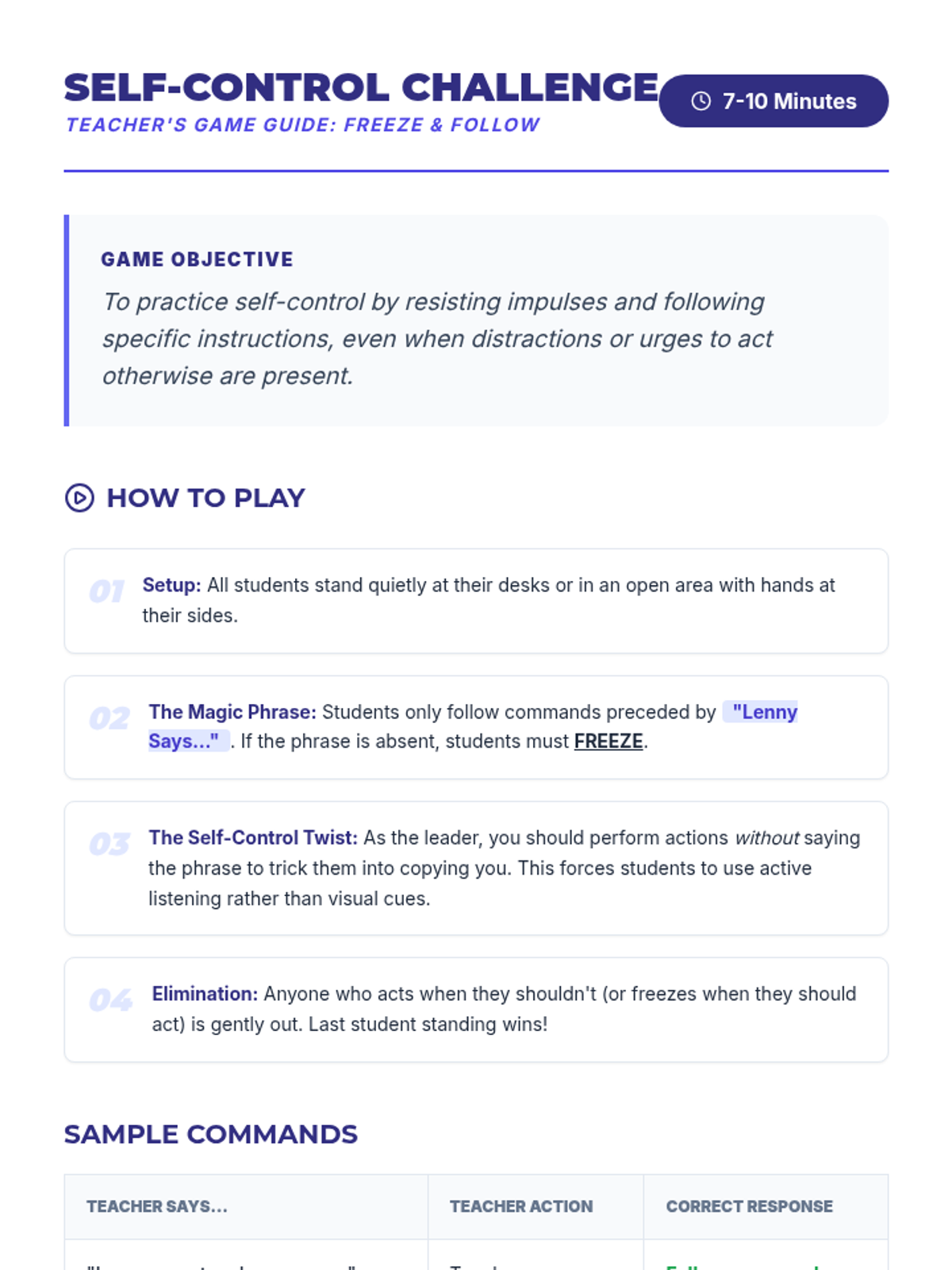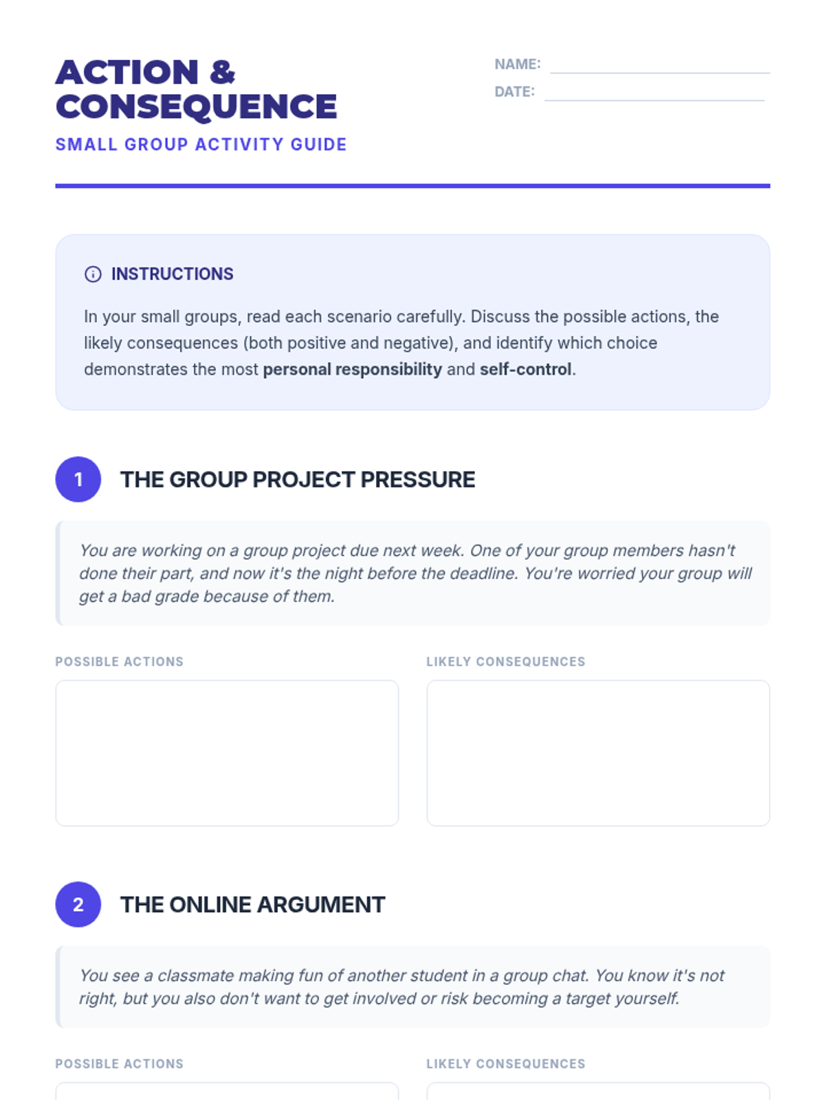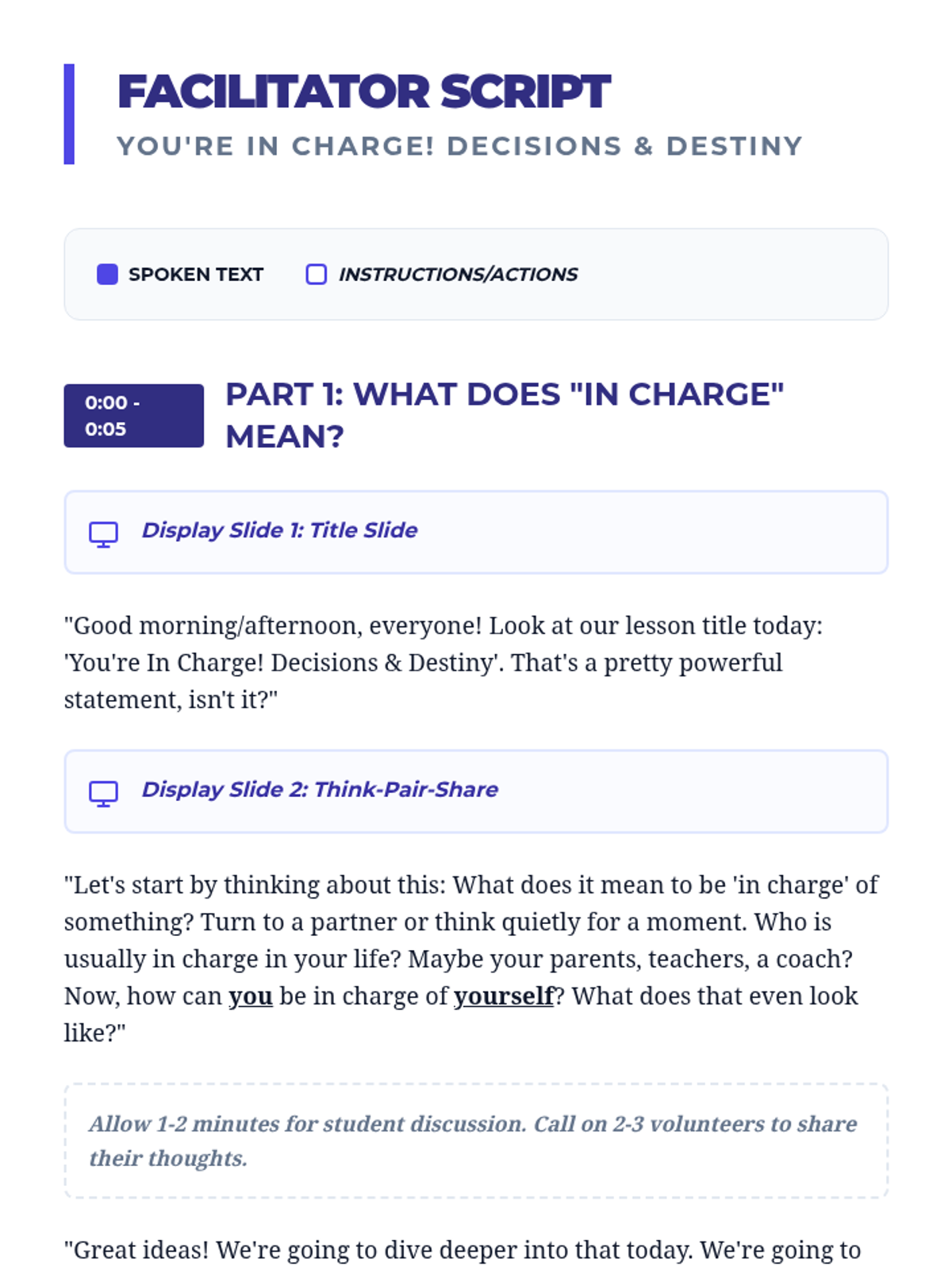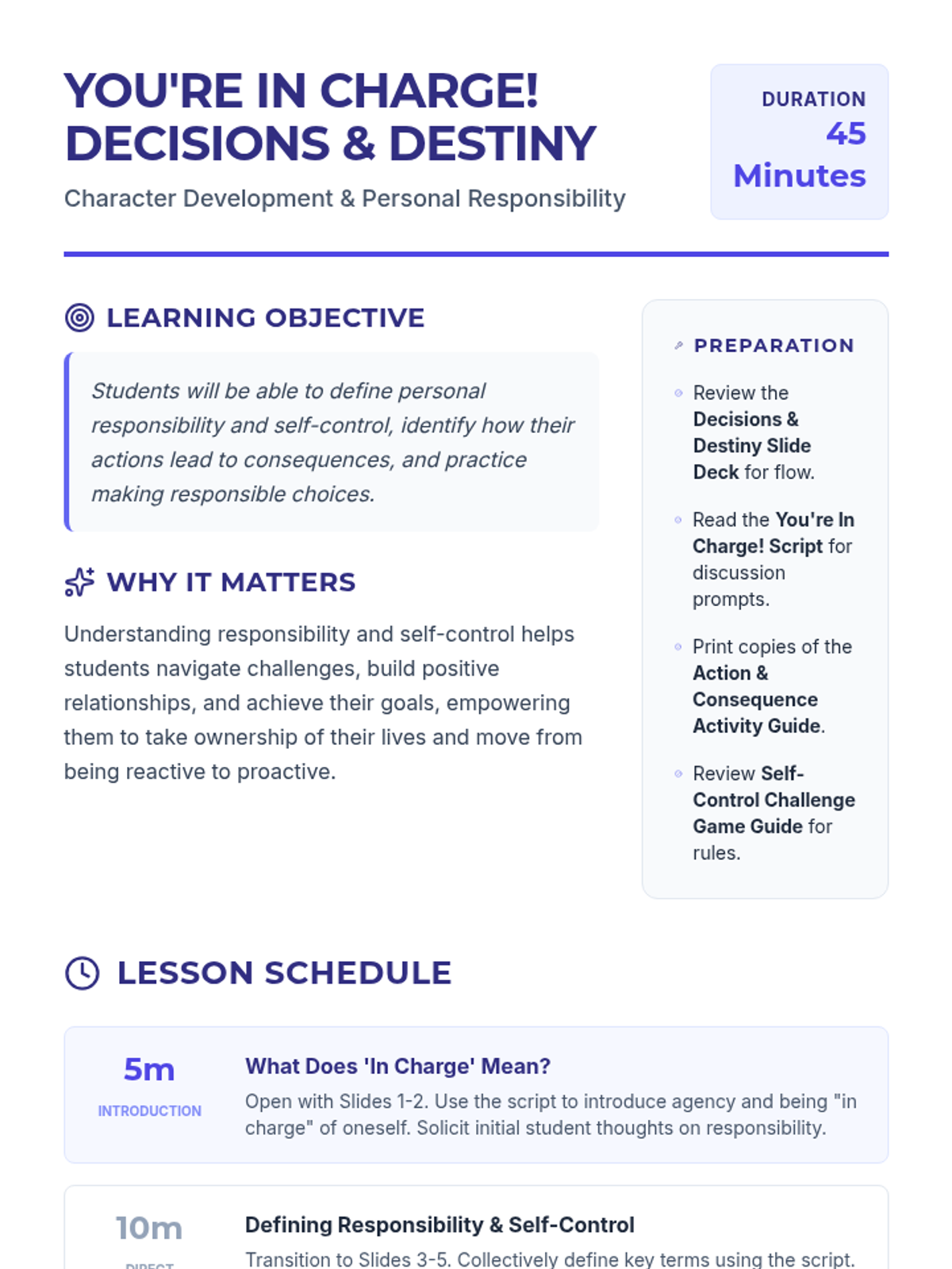 A 45-minute middle school lesson focused on personal responsibility and self-control, helping students understand how their choices shape their future.