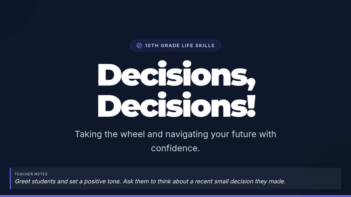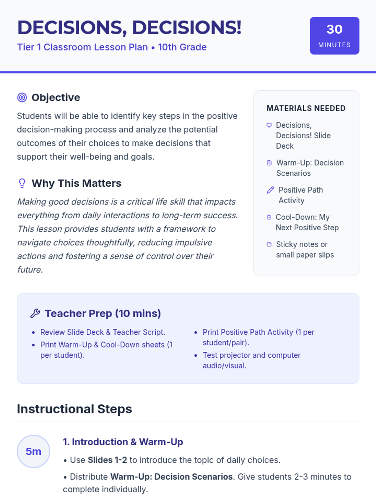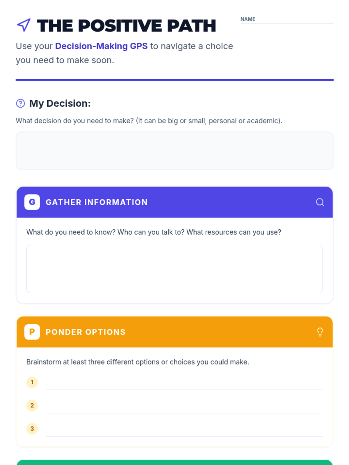 A 30-minute Tier 1 lesson for 10th graders that teaches the 'Decision-Making GPS' framework (Gather, Ponder, Set) to help students make choices that align with their values and goals.