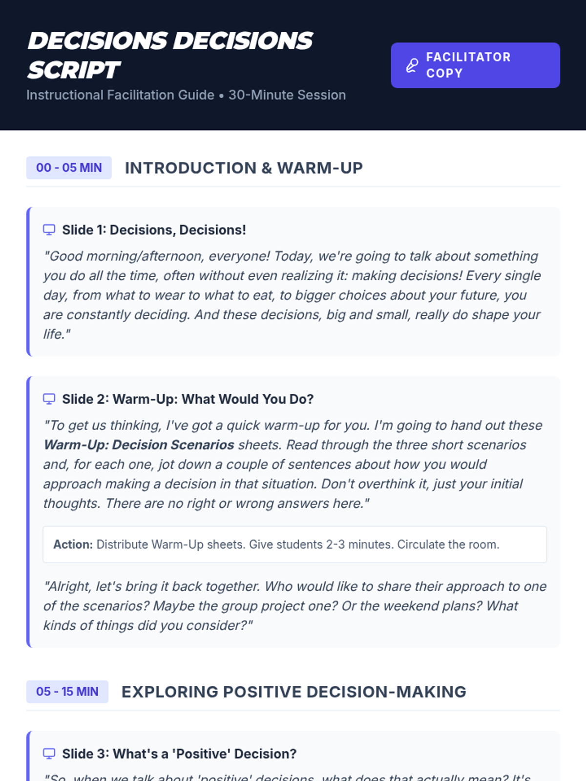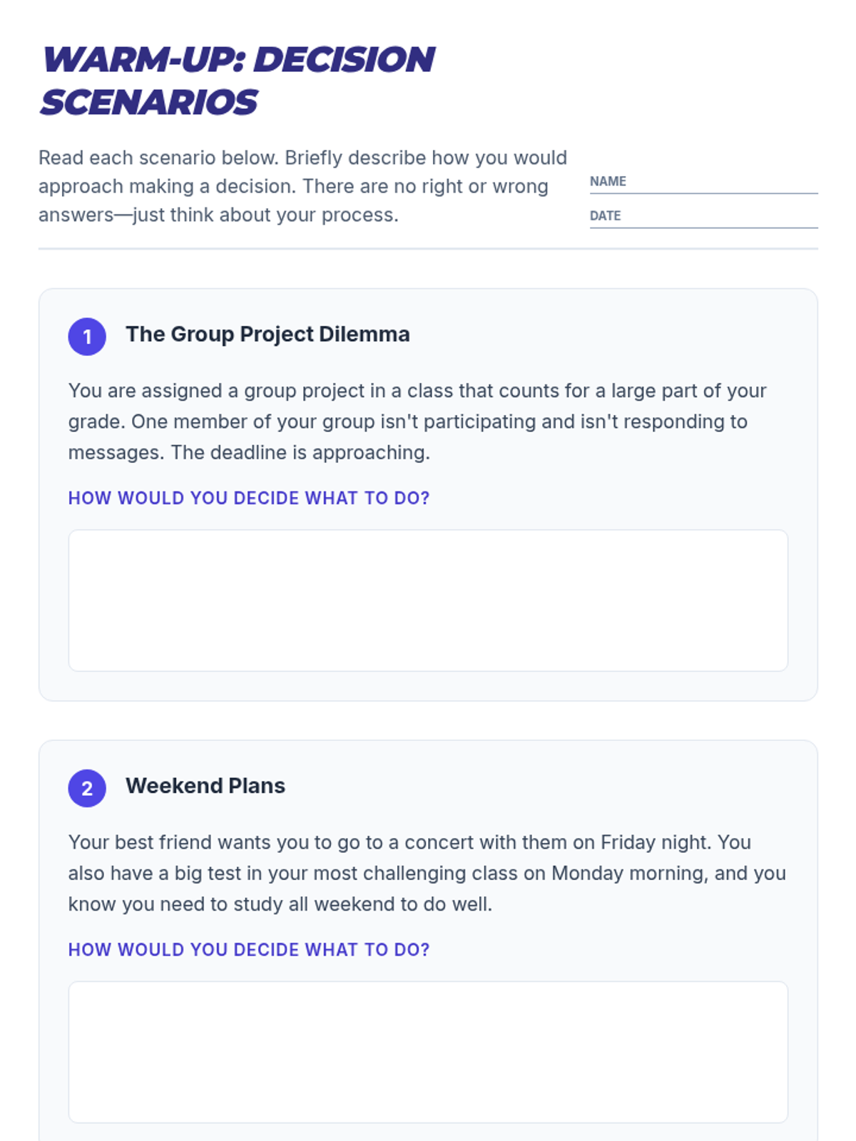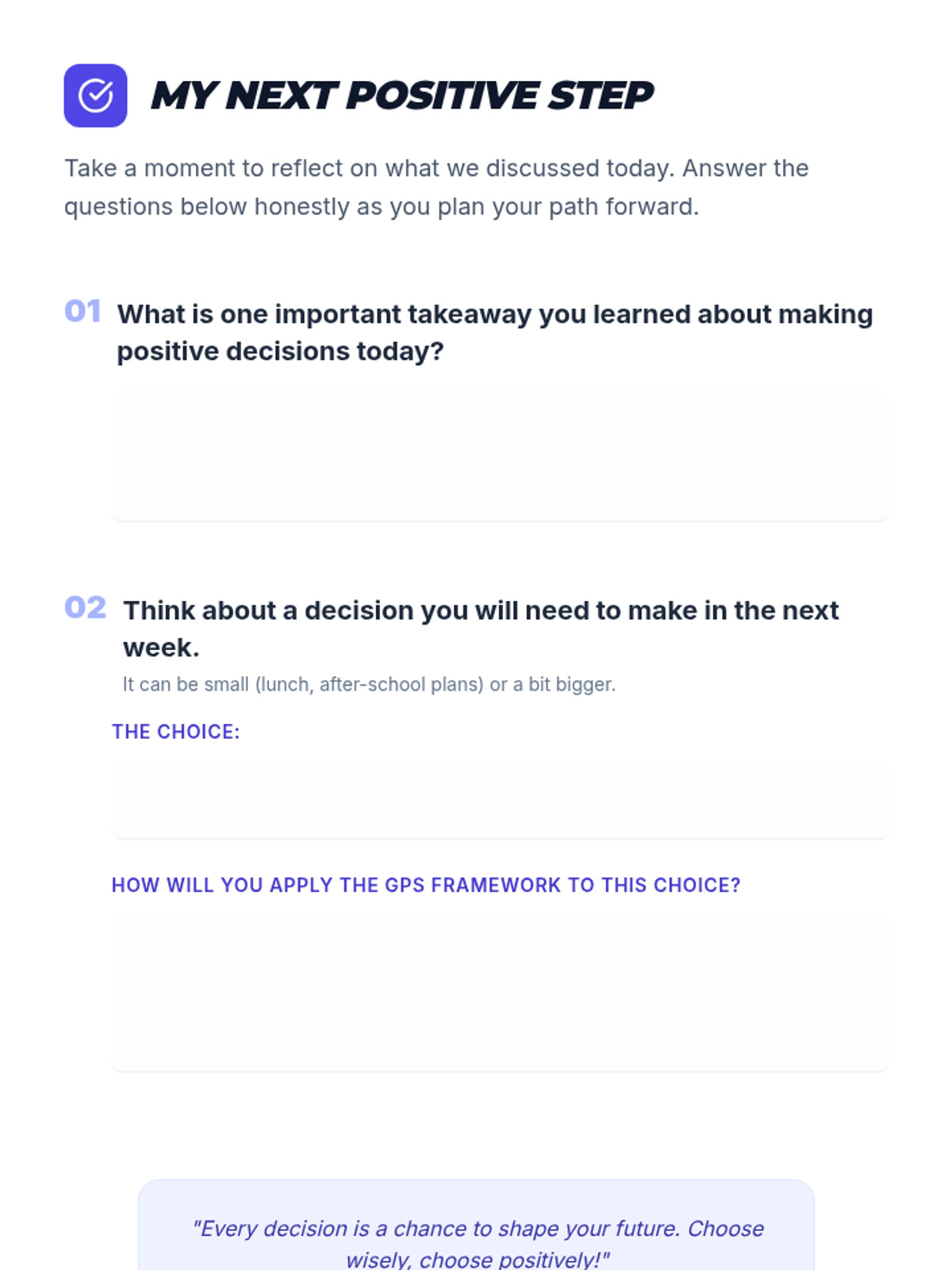 A 30-minute Tier 1 lesson for 10th graders that teaches the 'Decision-Making GPS' framework (Gather, Ponder, Set) to help students make choices that align with their values and goals.
