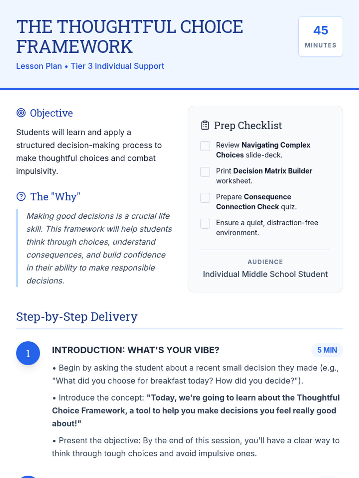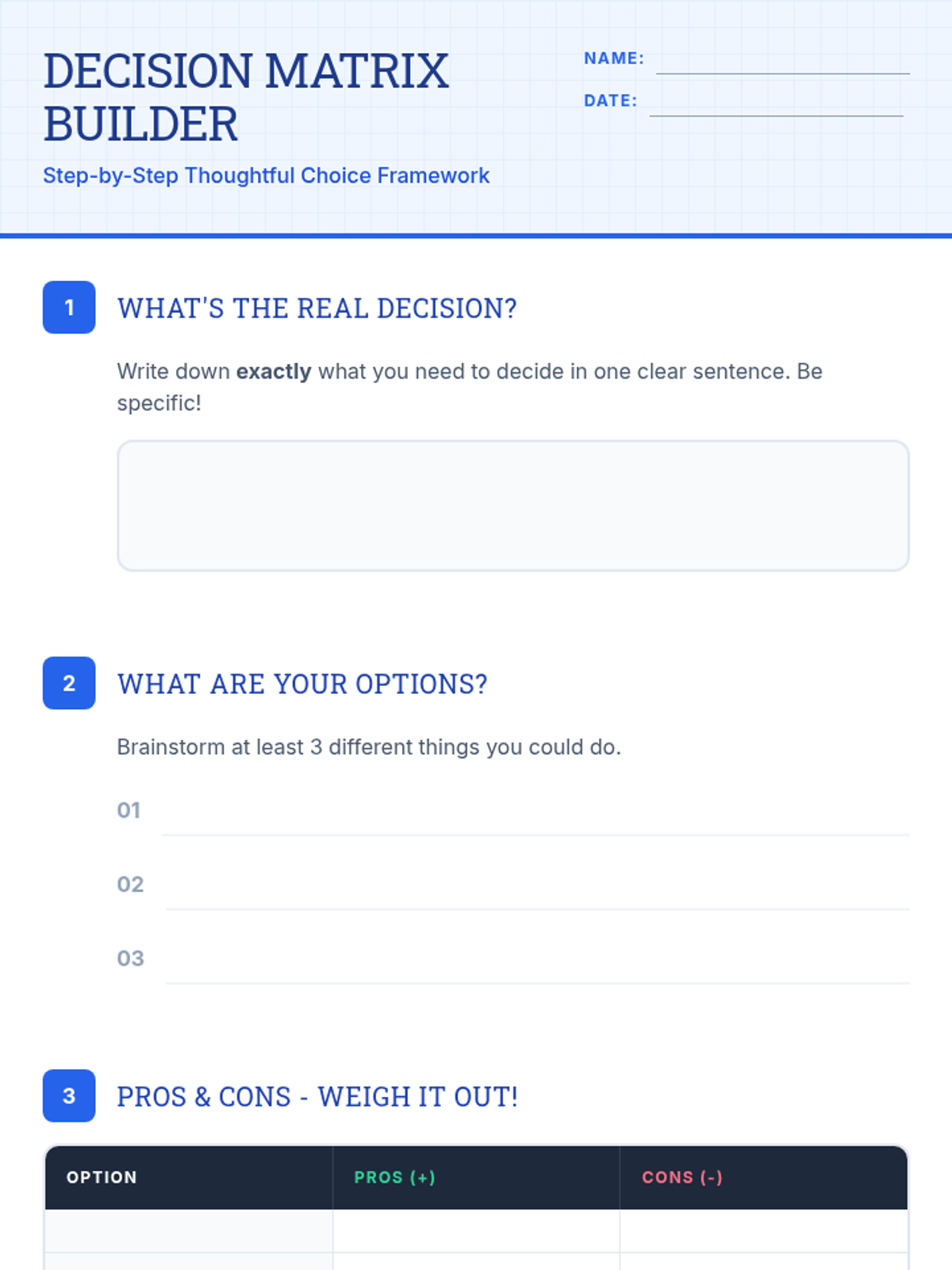 This individual resource guides a student through a structured decision-making process to combat impulsivity. It helps them weigh pros and cons, consider long-term consequences, and develop a habit of thoughtful choices.