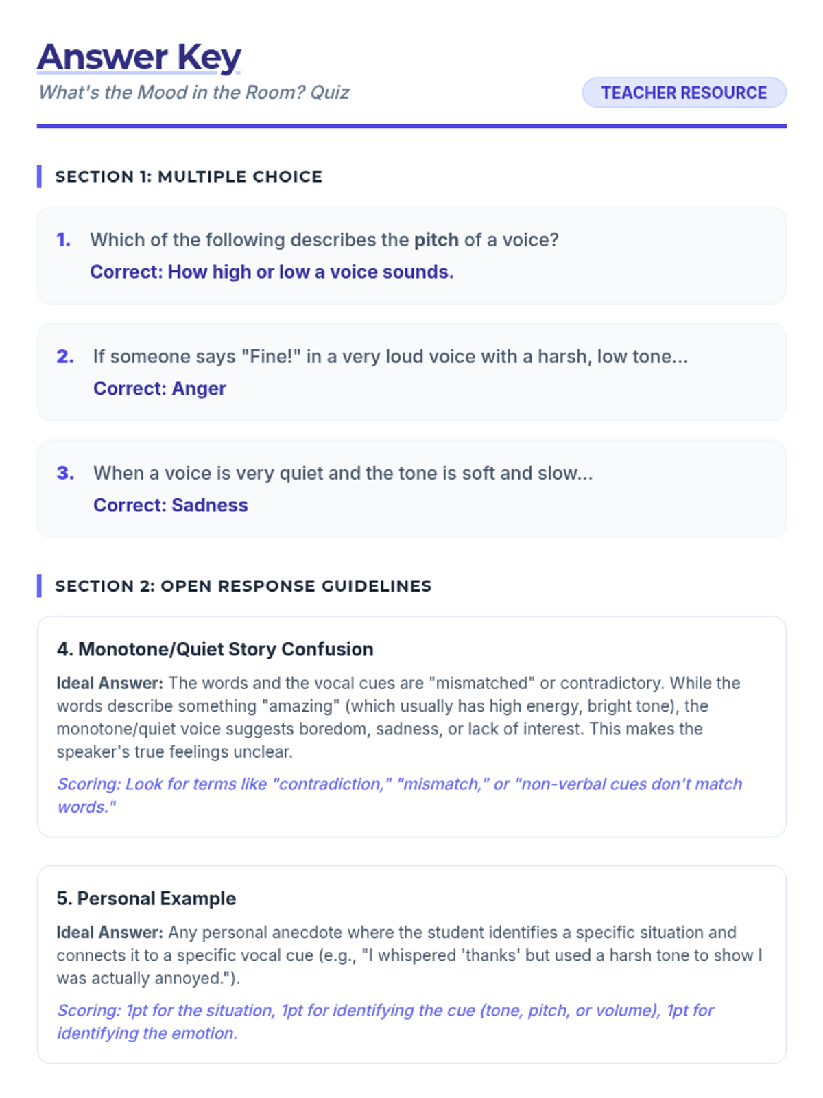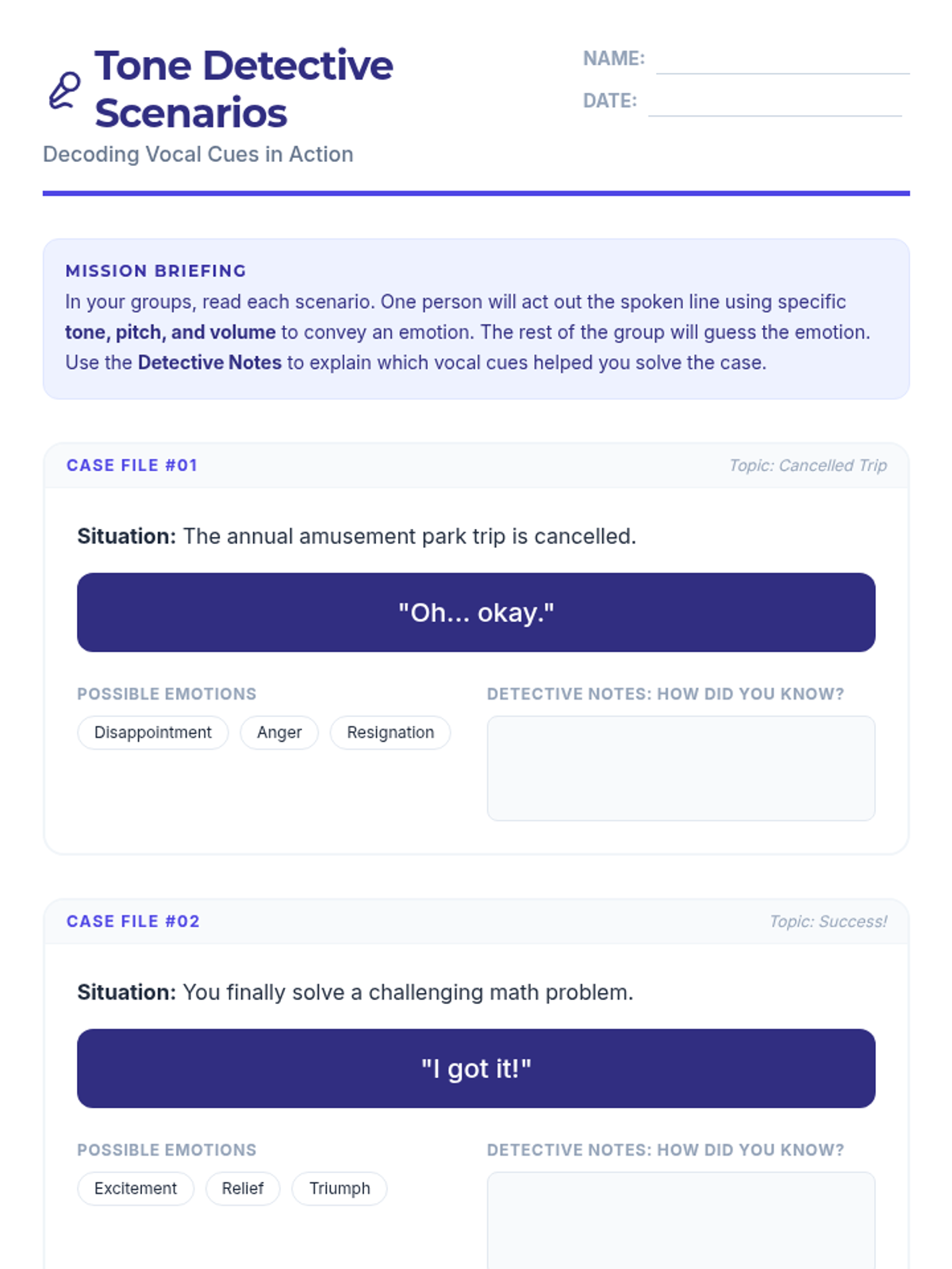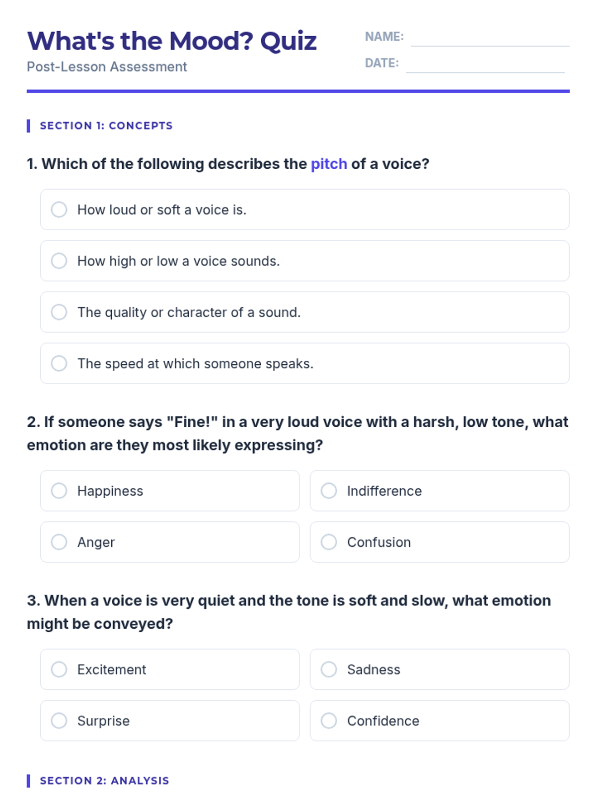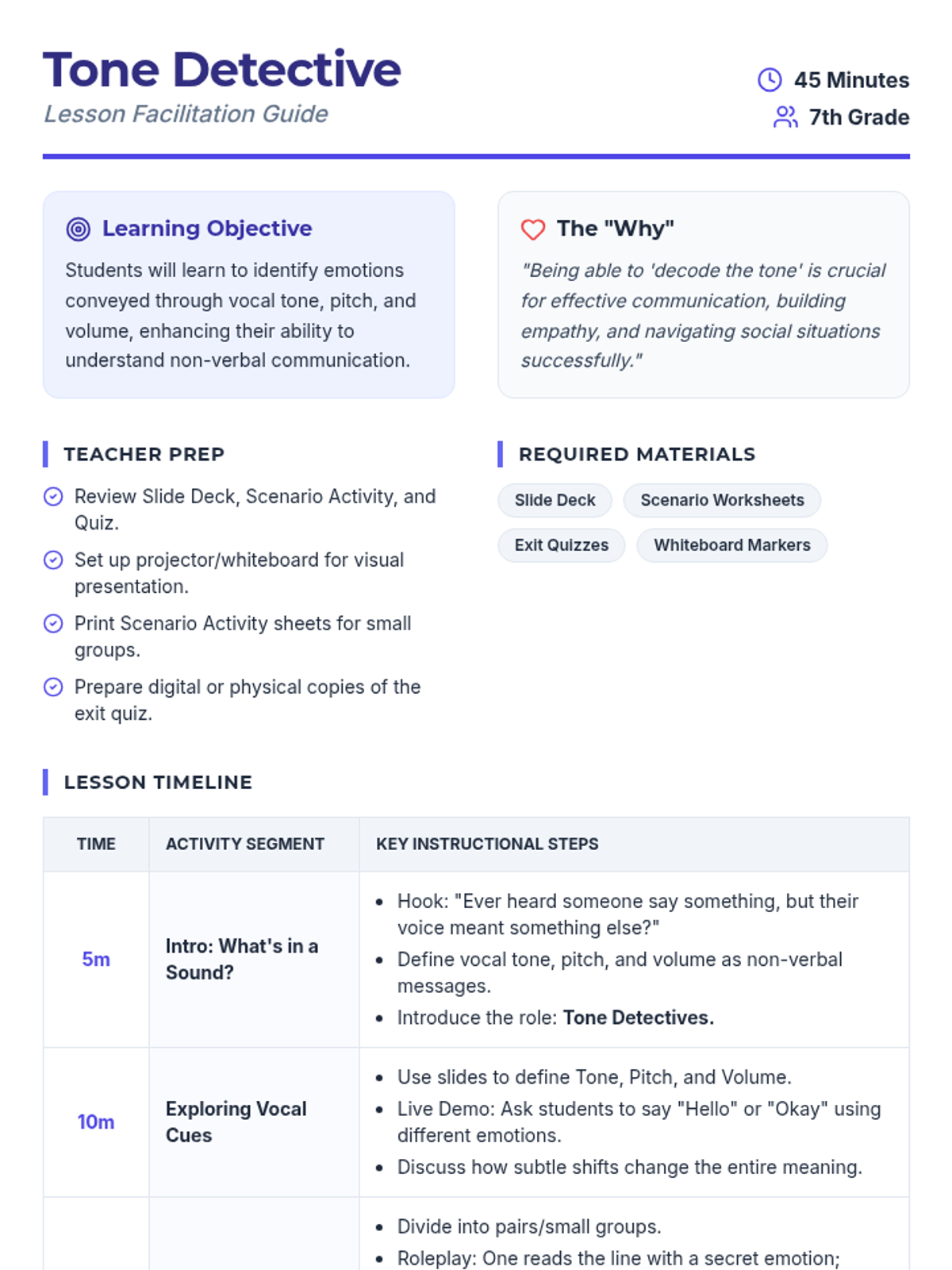 A 45-minute lesson for 7th graders to identify emotions through vocal tone, pitch, and volume, using interactive discussions and role-playing.