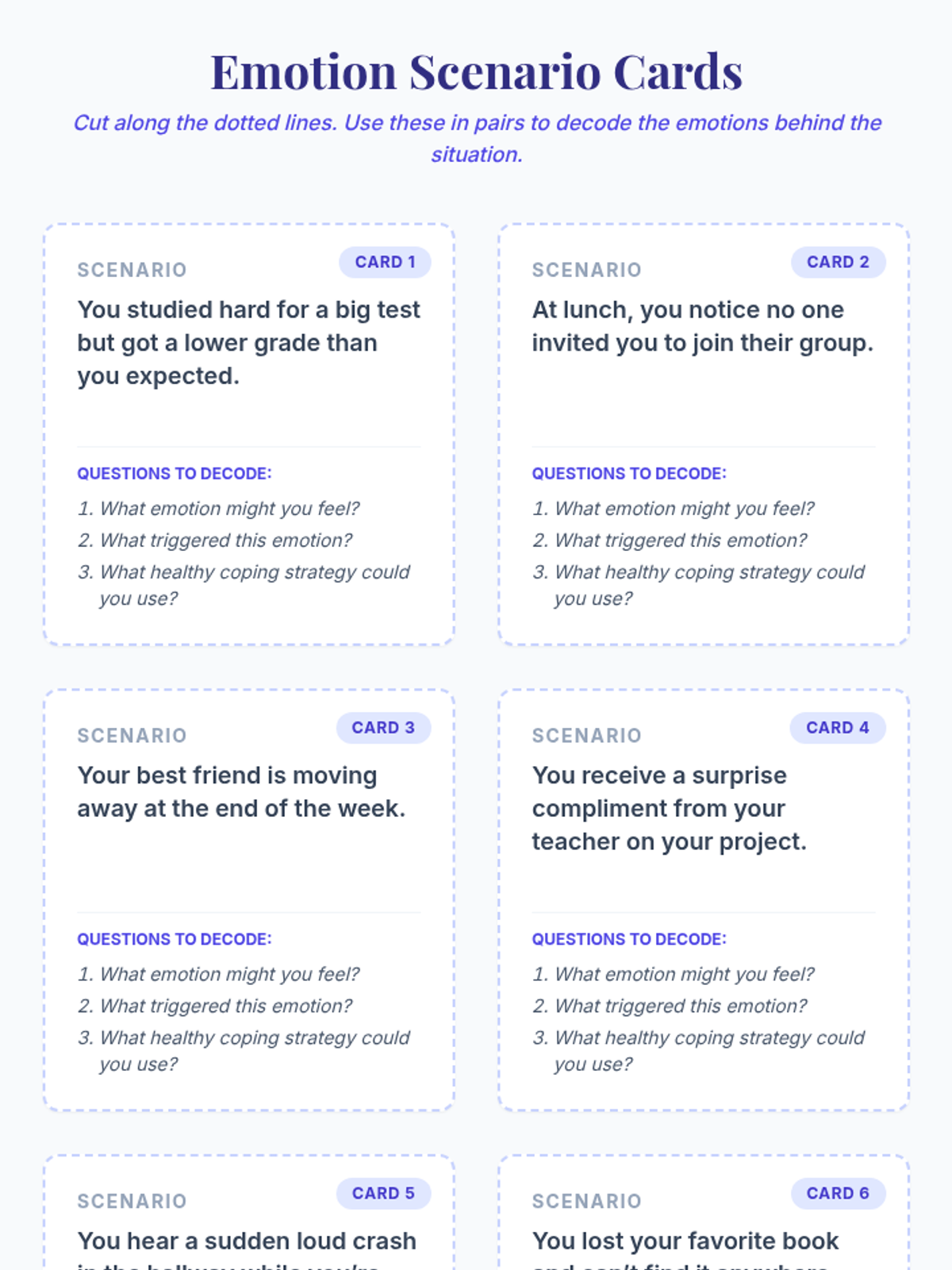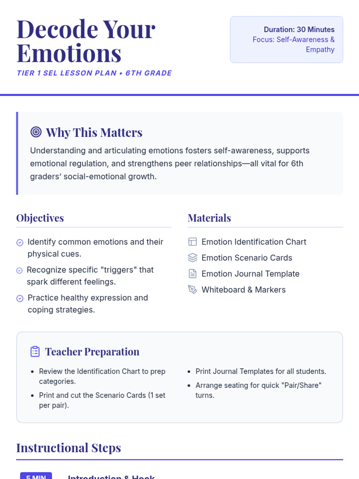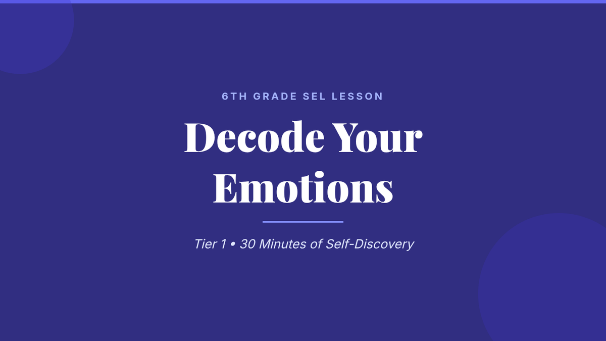 A 30-minute Tier 1 SEL lesson for 6th graders focused on identifying, understanding, and expressing emotions to build self-awareness and empathy.