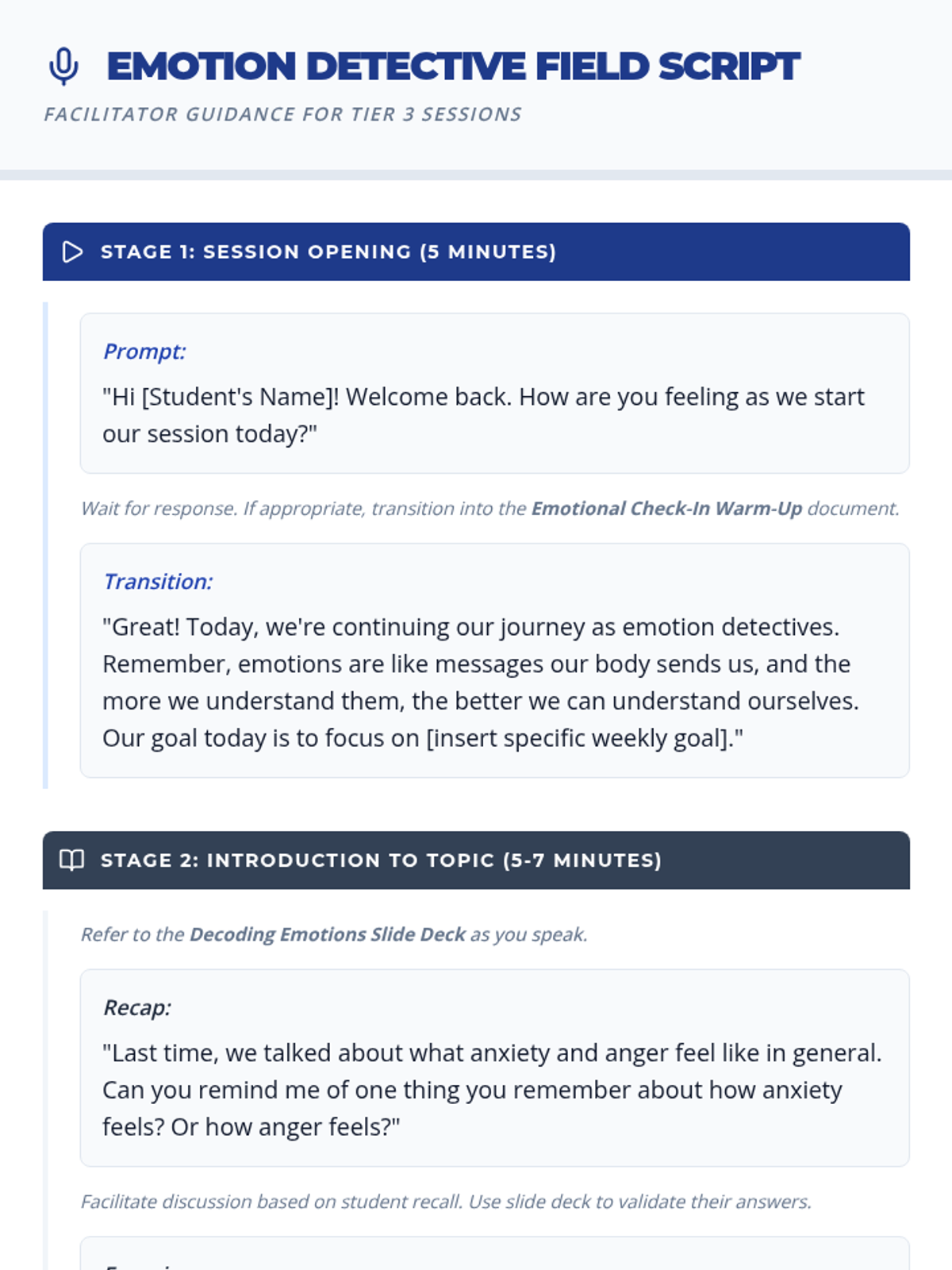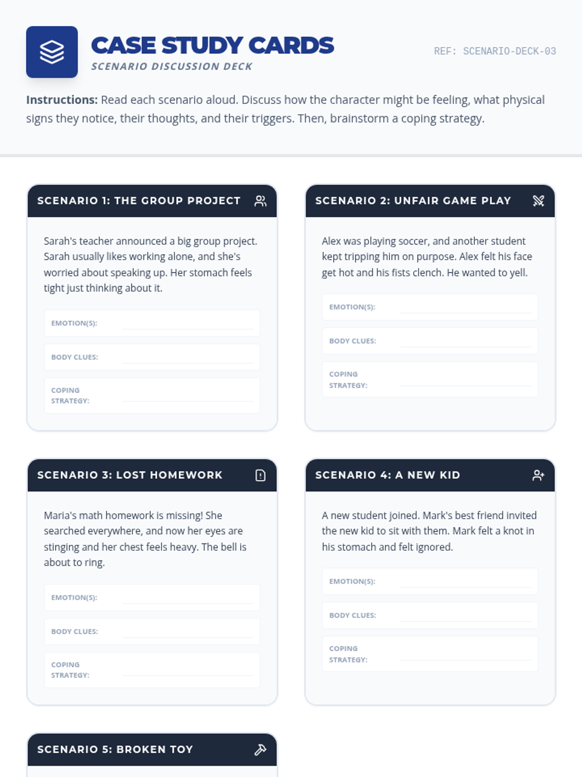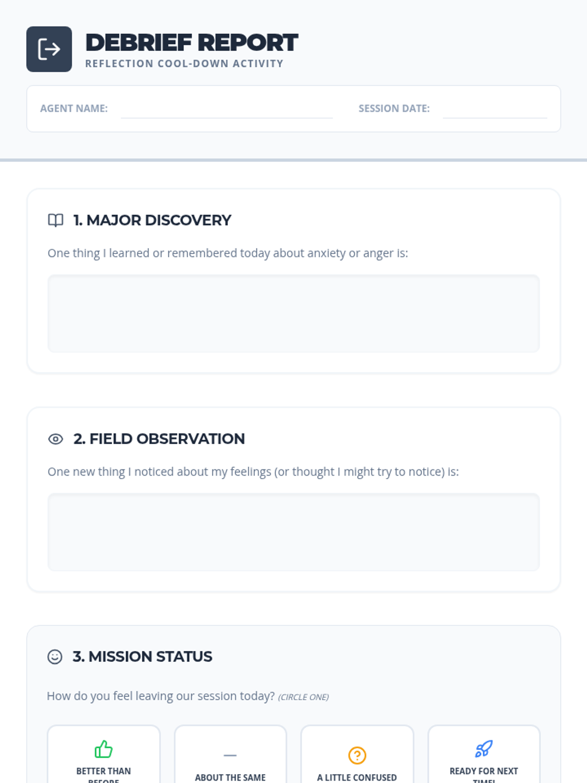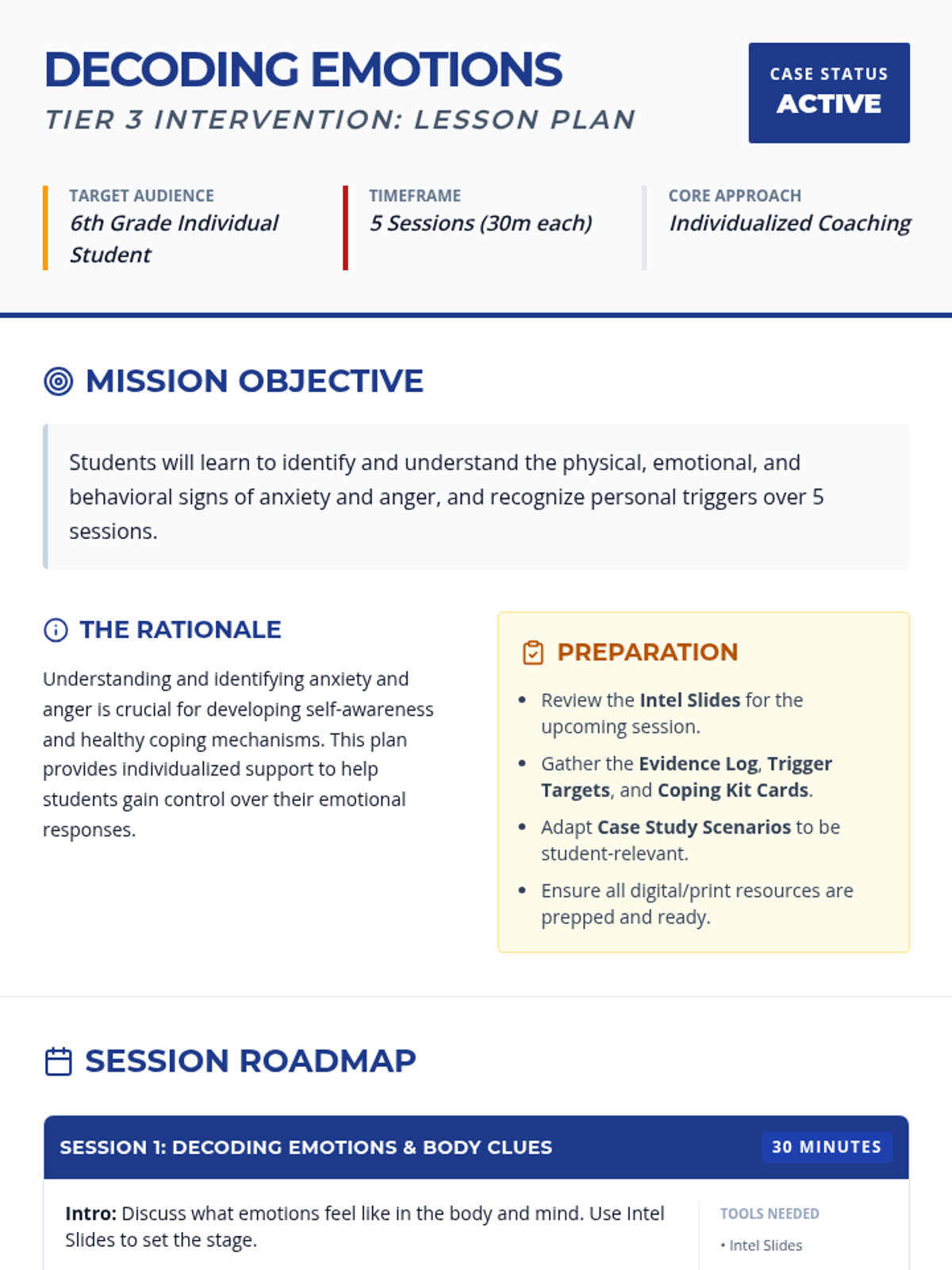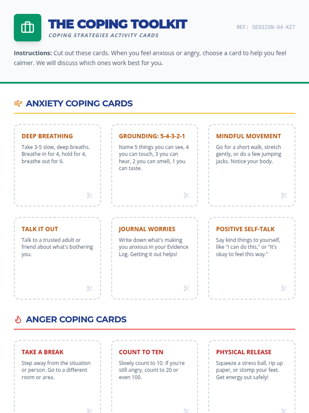 A 5-session individualized program helping students recognize physical signs, emotional triggers, and intensity levels of anxiety and anger while building a coping toolkit.