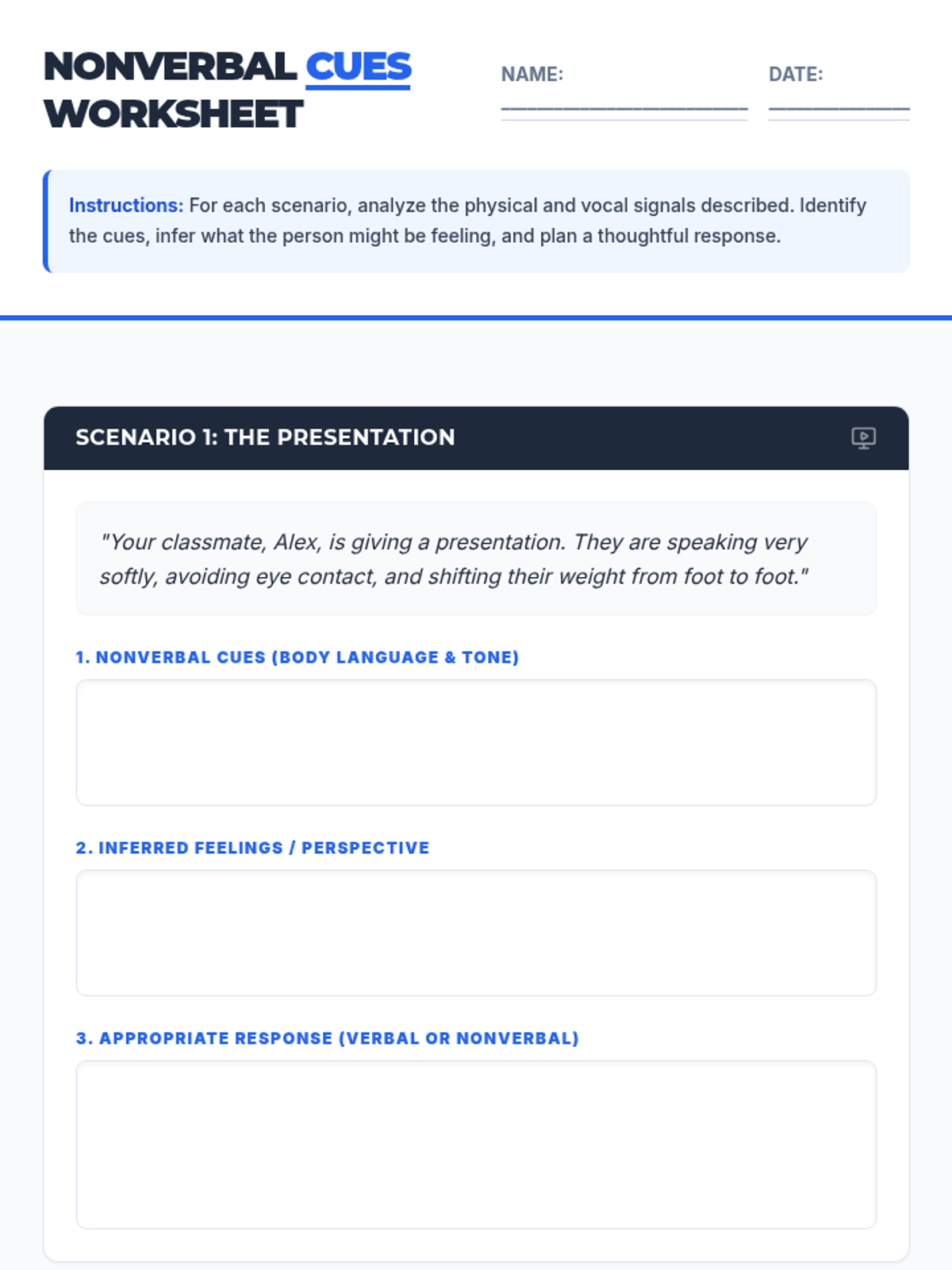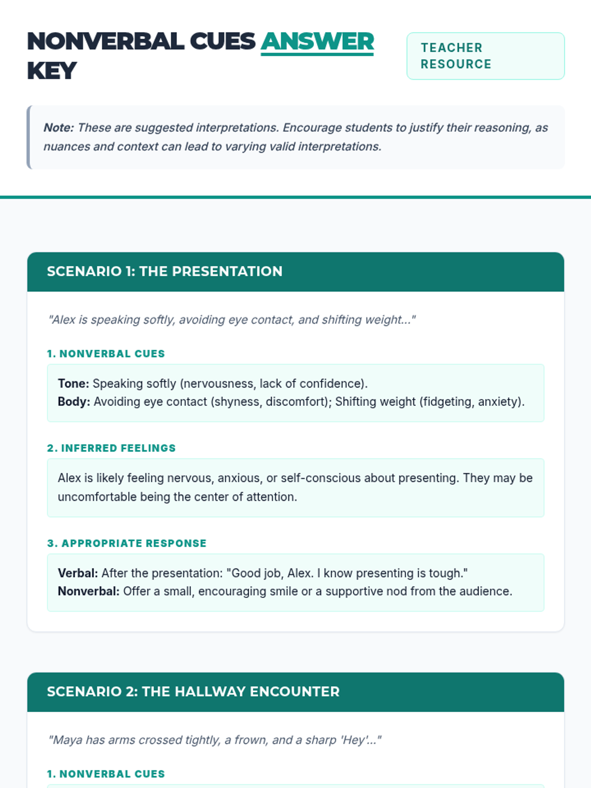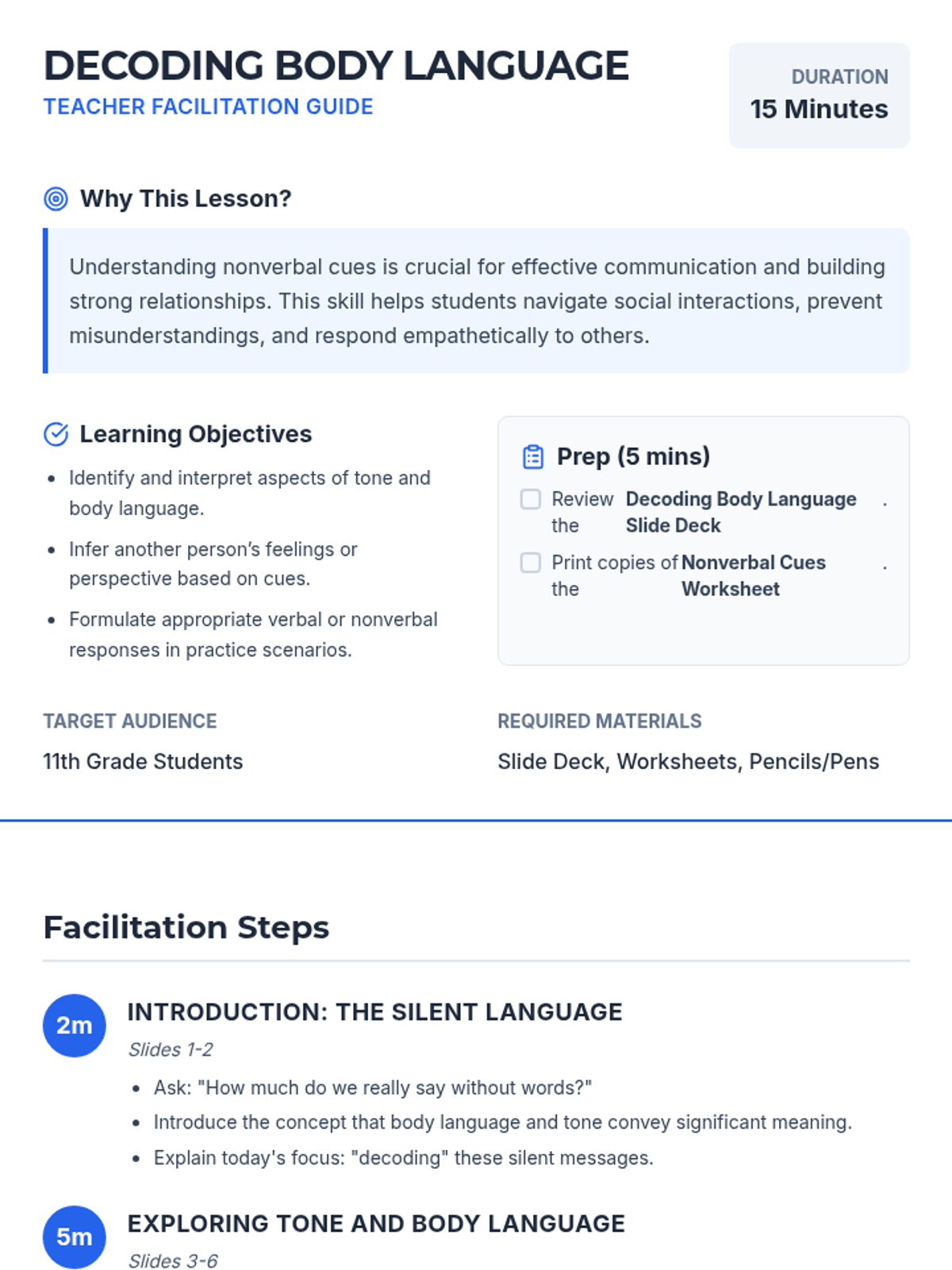 This lesson helps 11th-grade students understand and interpret nonverbal cues, such as tone and body language, to better infer others' feelings and perspectives. It provides practical strategies for responding appropriately in social situations.