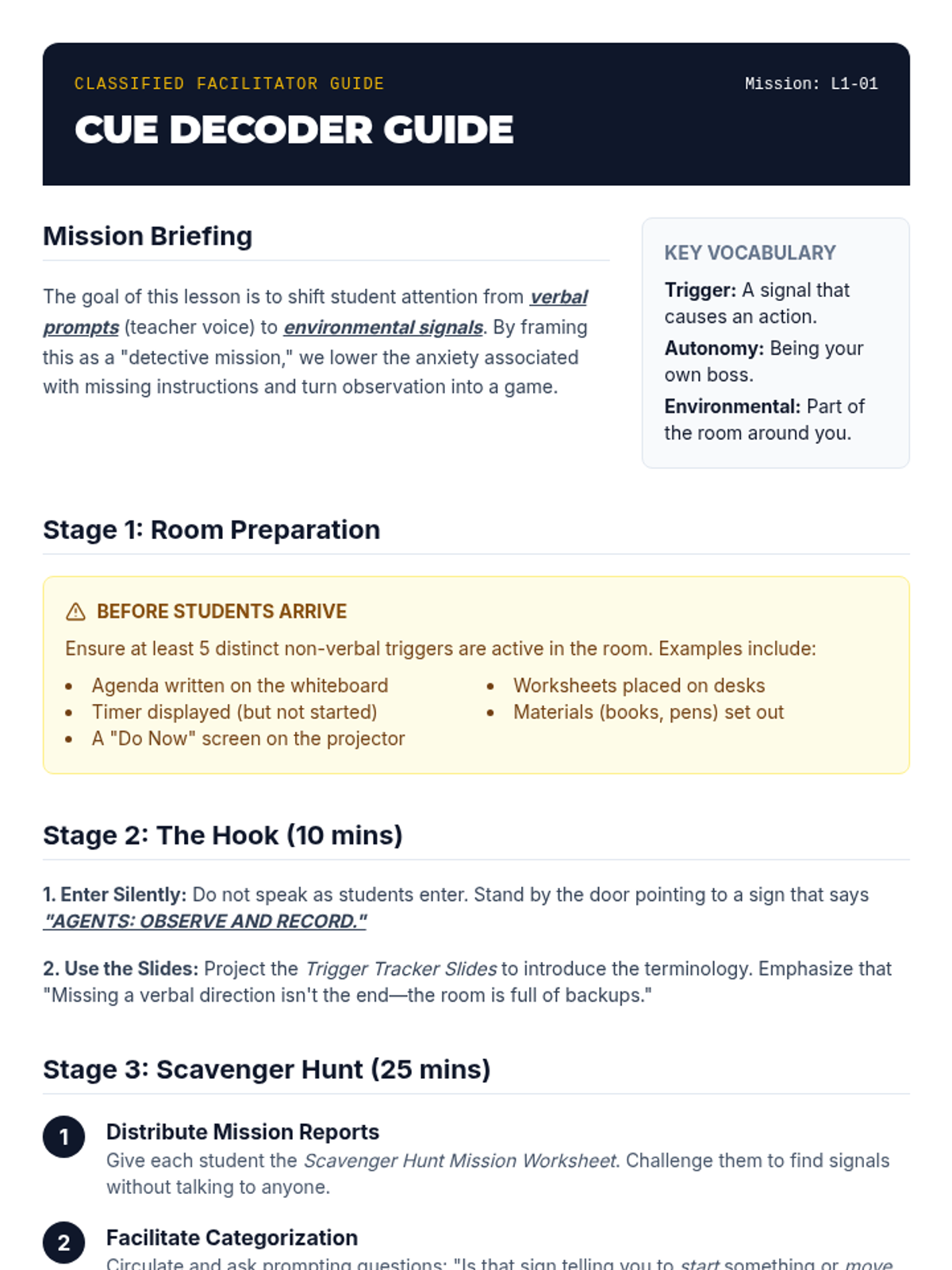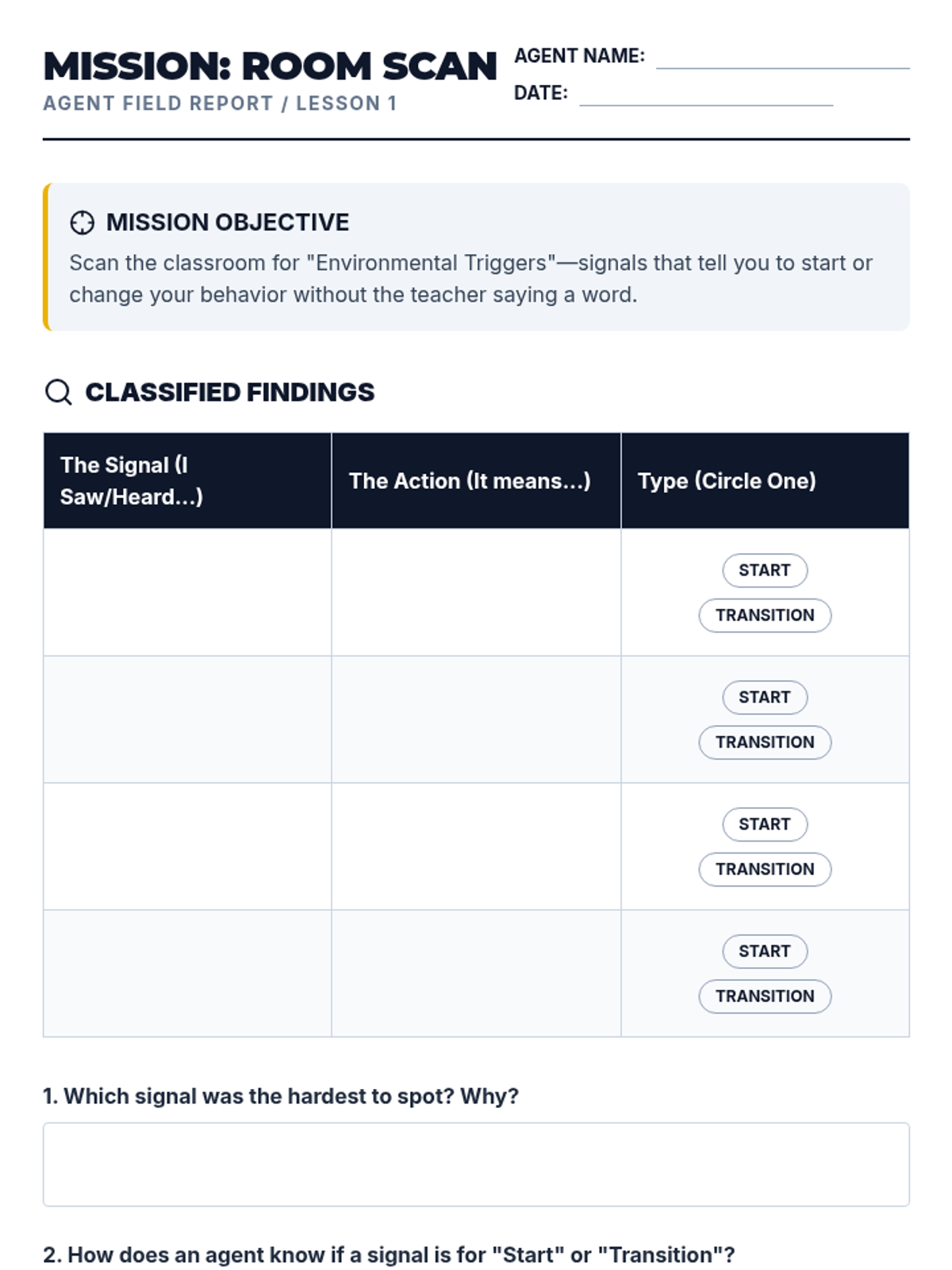 Students investigate the classroom environment to catalogue non-verbal signals like bells, board messages, and material layouts, categorizing them as 'Start Signals' or 'Transition Signals.'