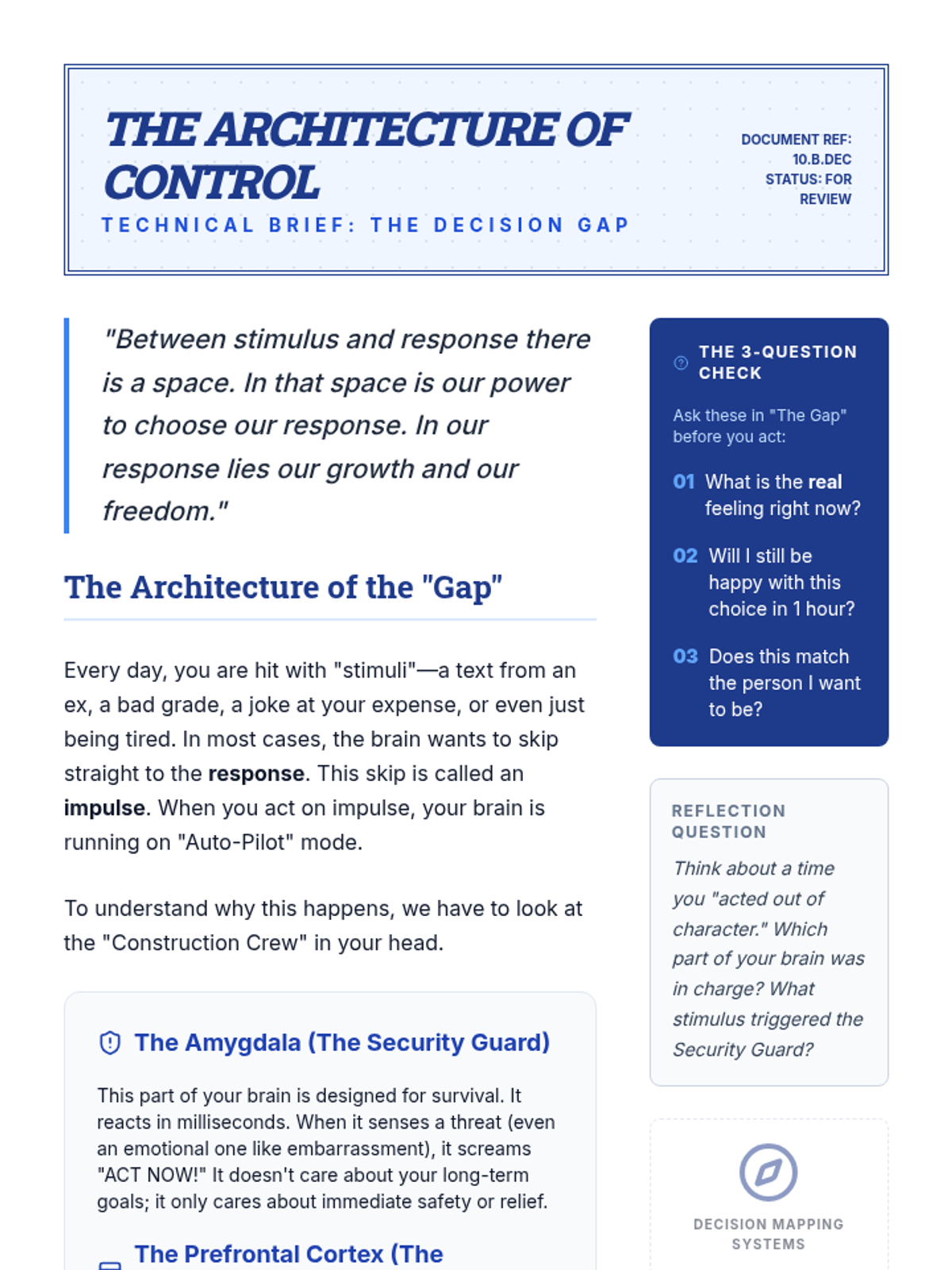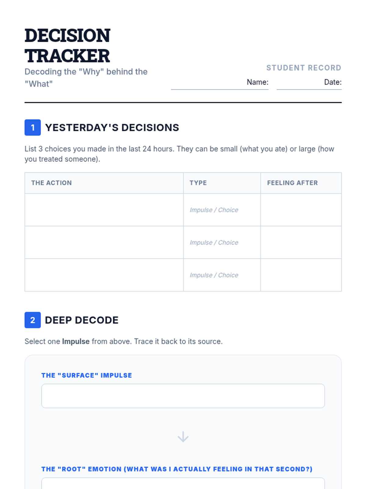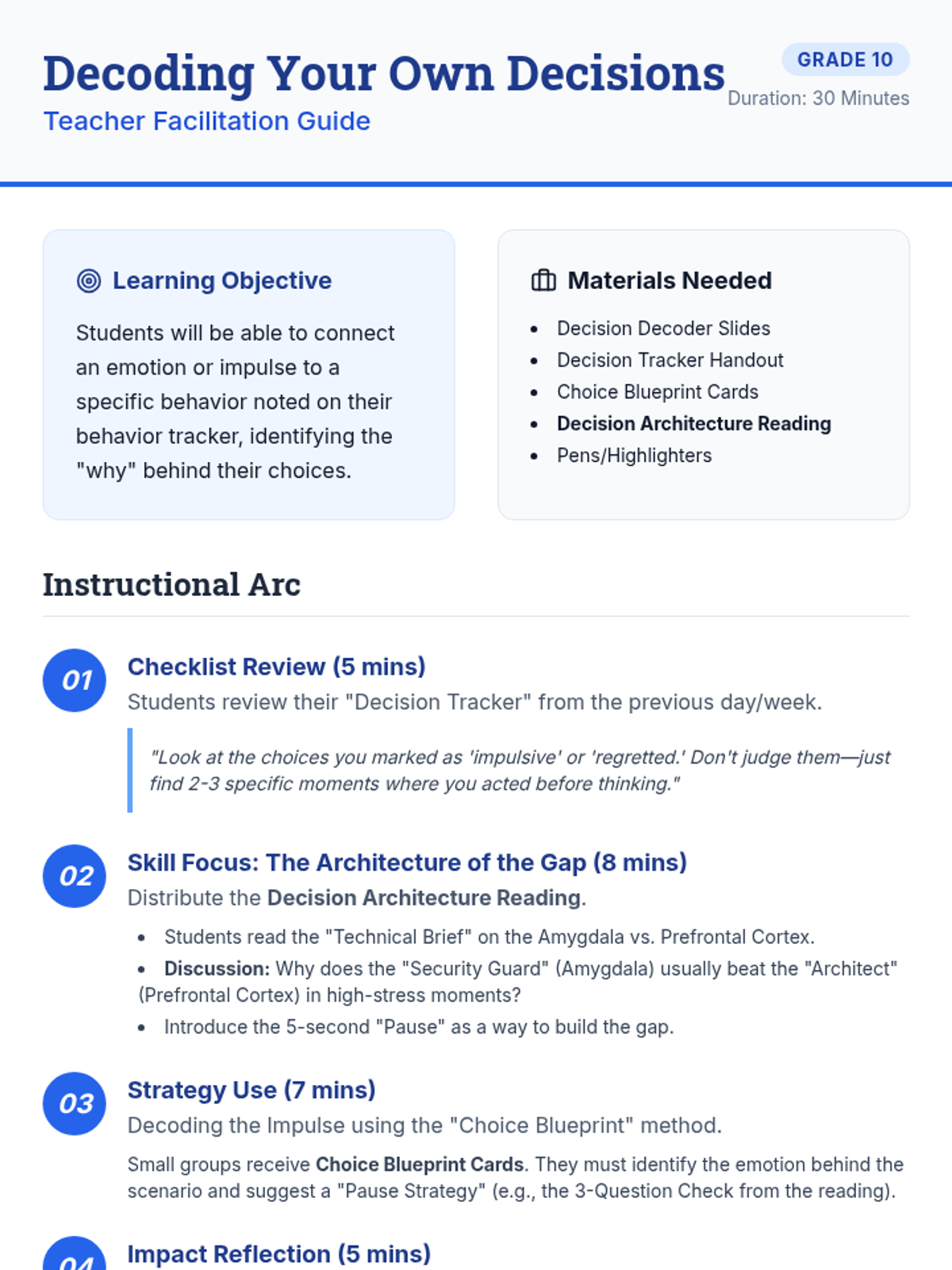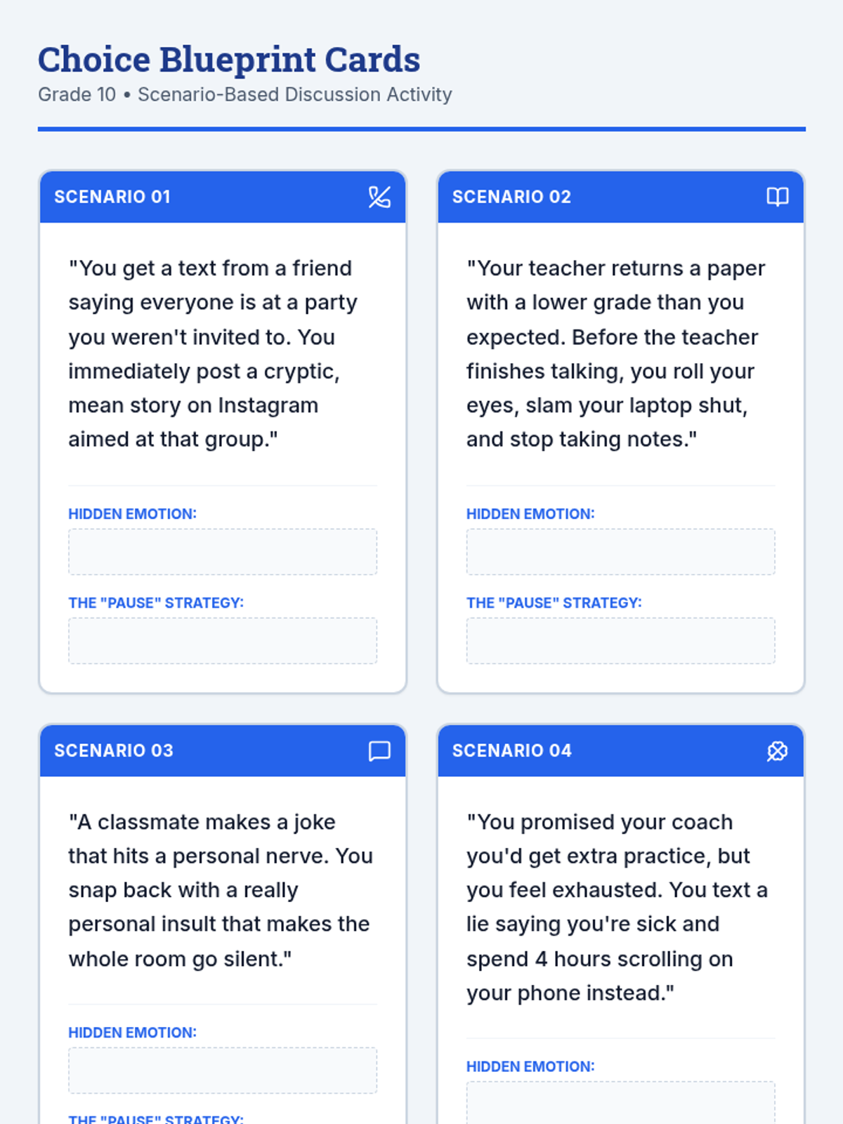 A 30-minute 10th-grade lesson focused on helping students identify the emotional drivers behind their impulsive actions and develop strategies for more intentional decision-making. Students analyze their own behaviors, participate in scenario-based discussions, and set goals for future self-regulation.