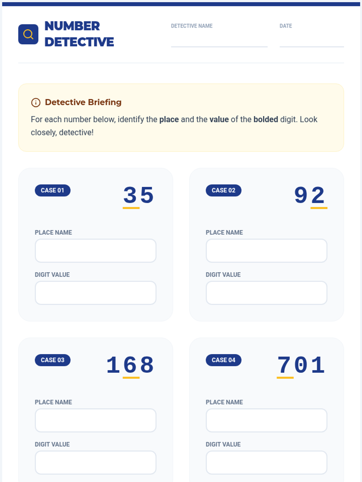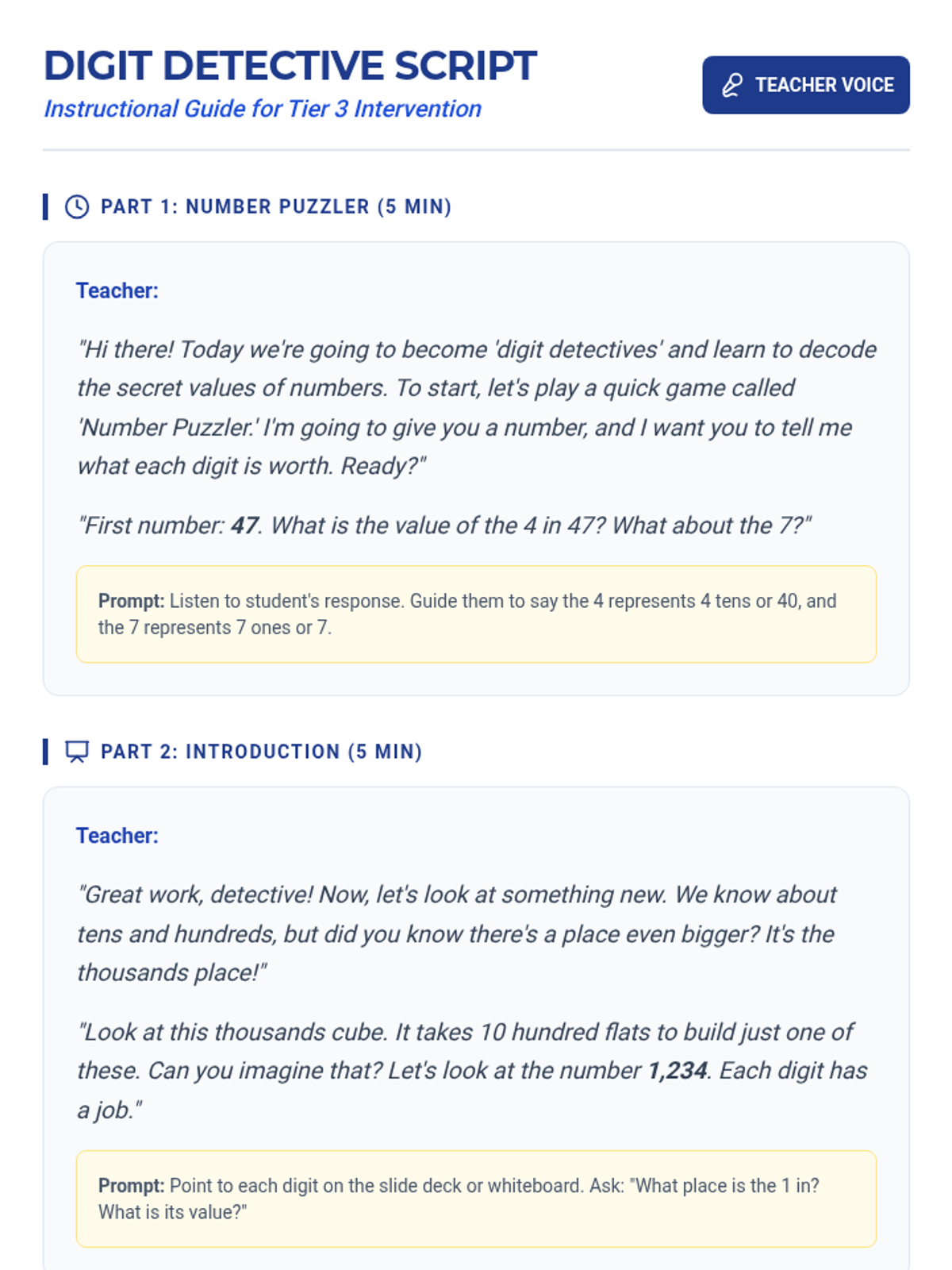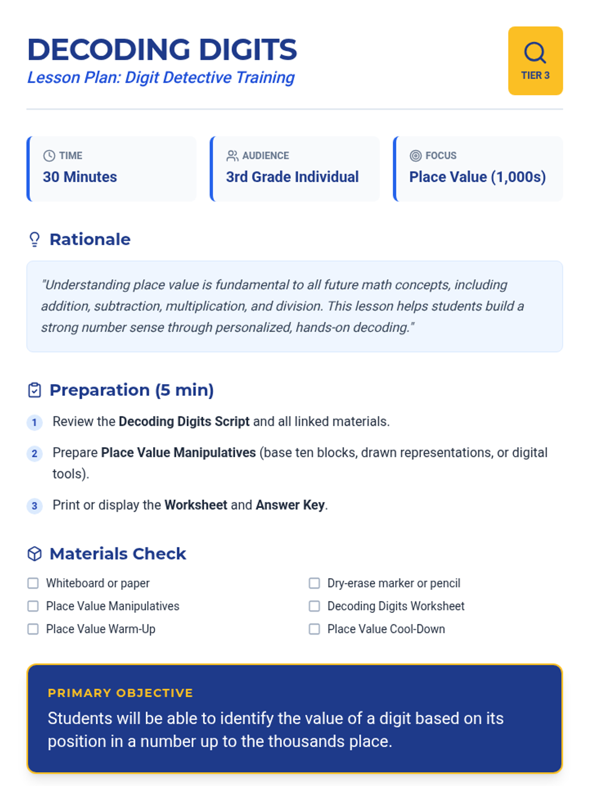 A 30-minute Tier 3 intervention lesson for 3rd graders to master place value up to the thousands place through a 'digit detective' theme.