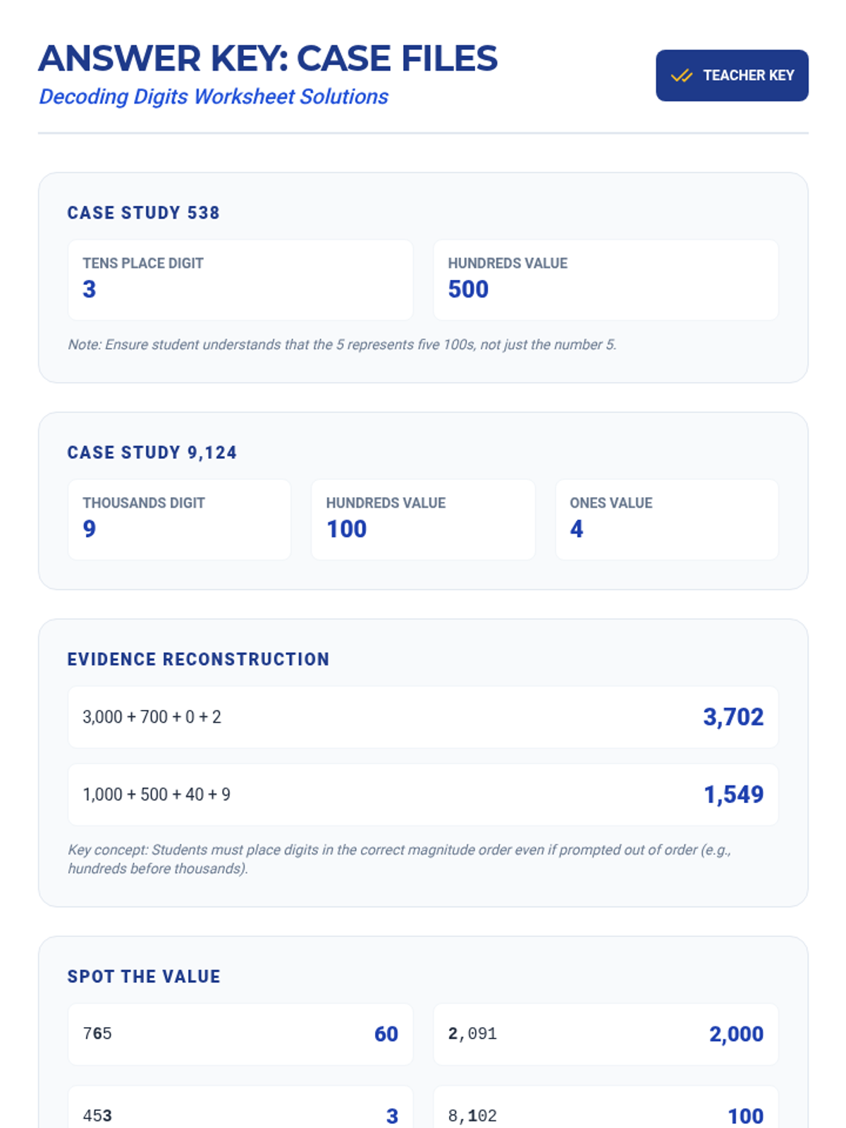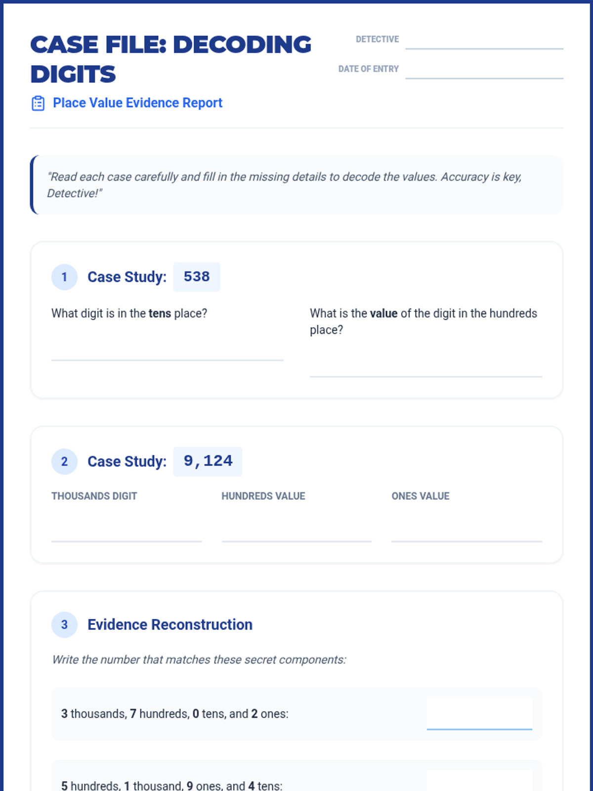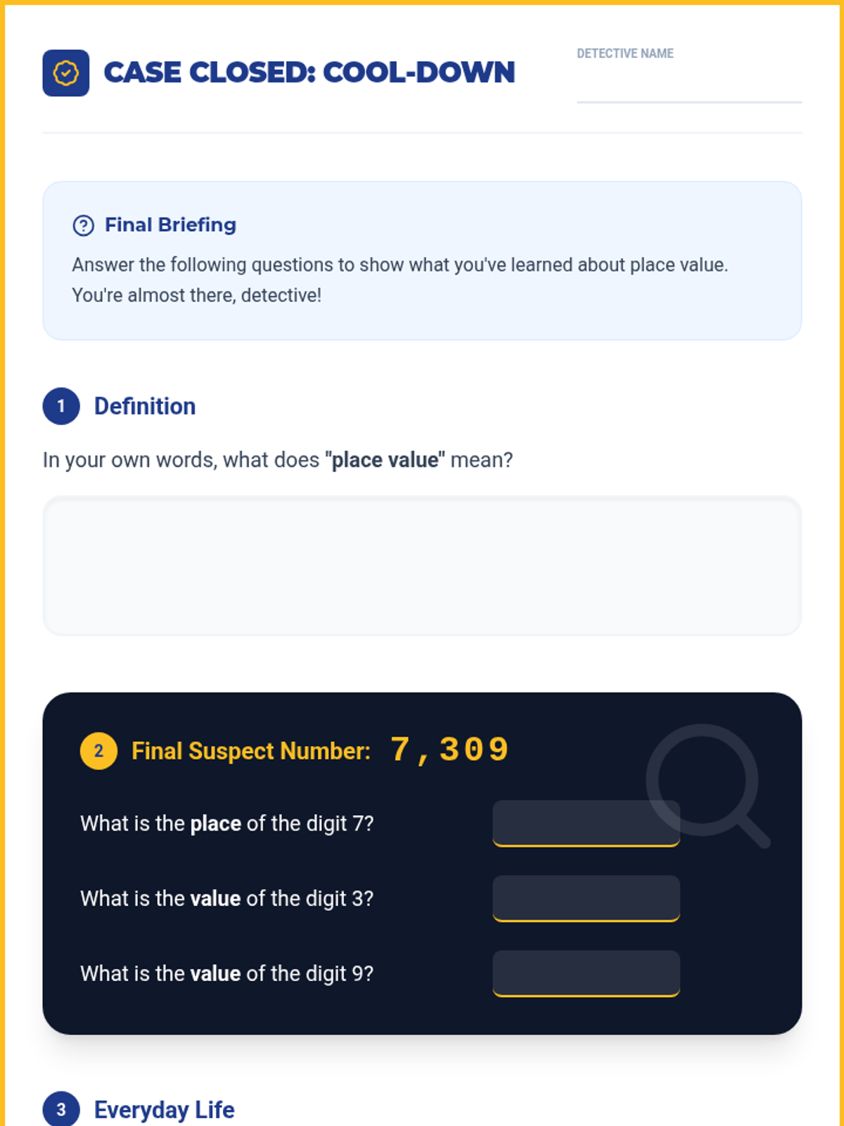 A 30-minute Tier 3 intervention lesson for 3rd graders to master place value up to the thousands place through a 'digit detective' theme.
