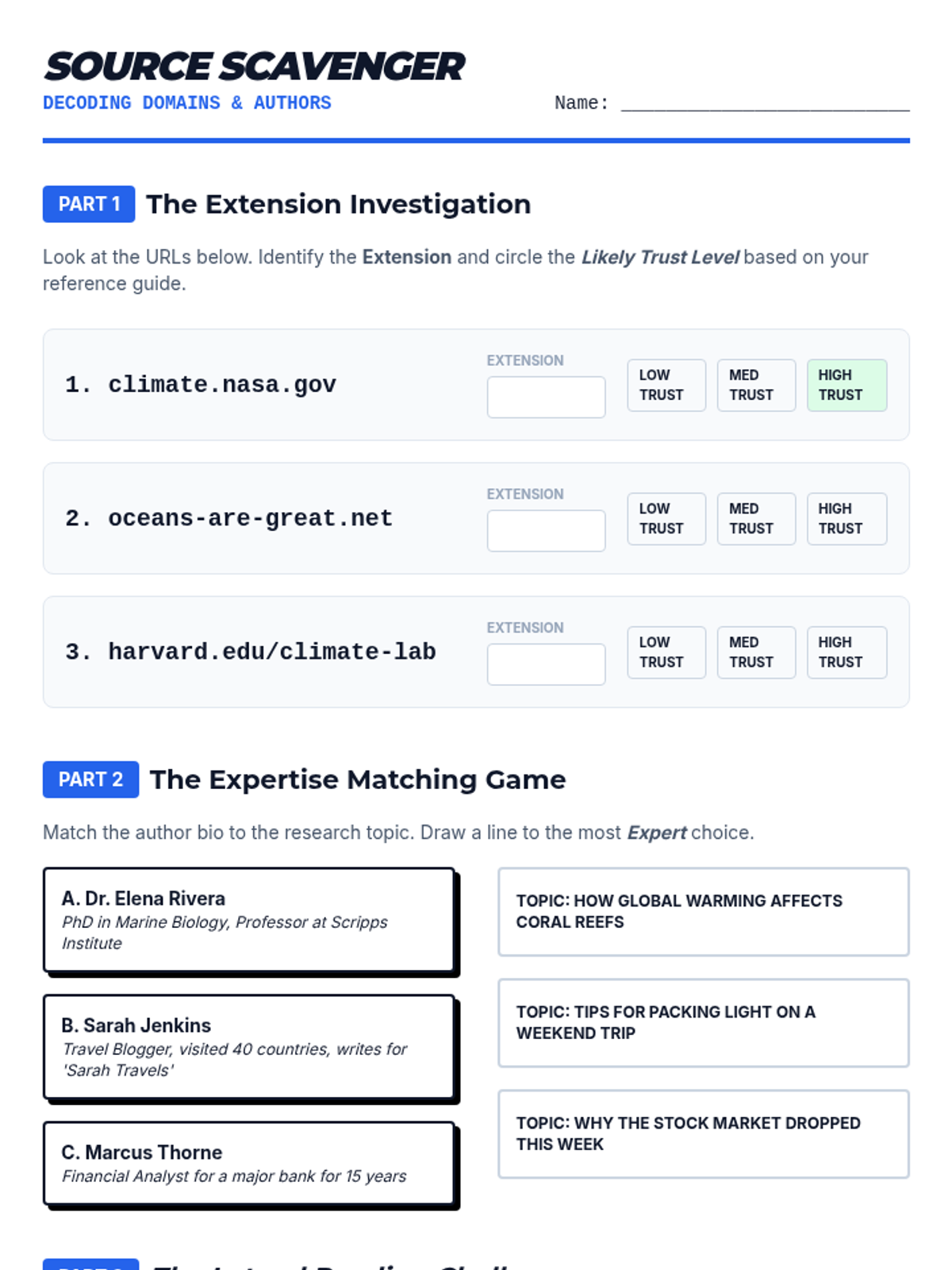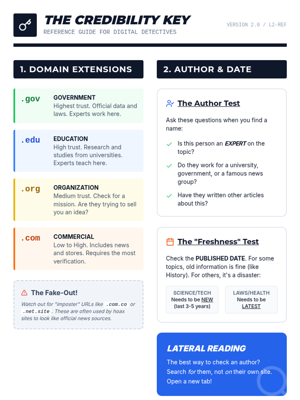 Learners decode URL extensions and investigate author expertise using lateral reading techniques to determine source authority.