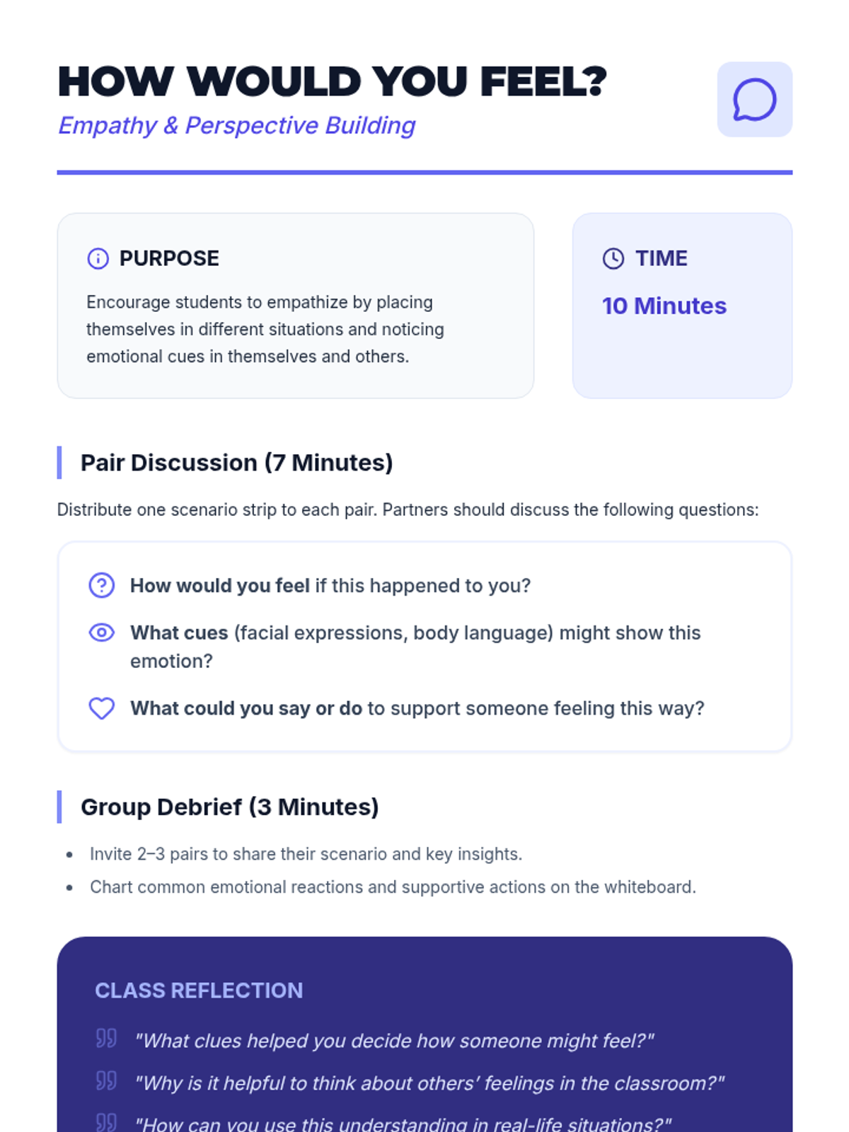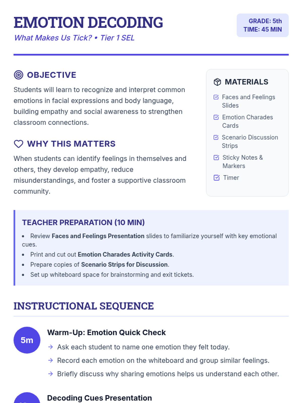 In this 45-minute Tier 1 lesson for fifth graders, students explore social awareness by recognizing emotions in themselves and others. Through interactive activities and discussion, they build empathy and strengthen classroom connections.