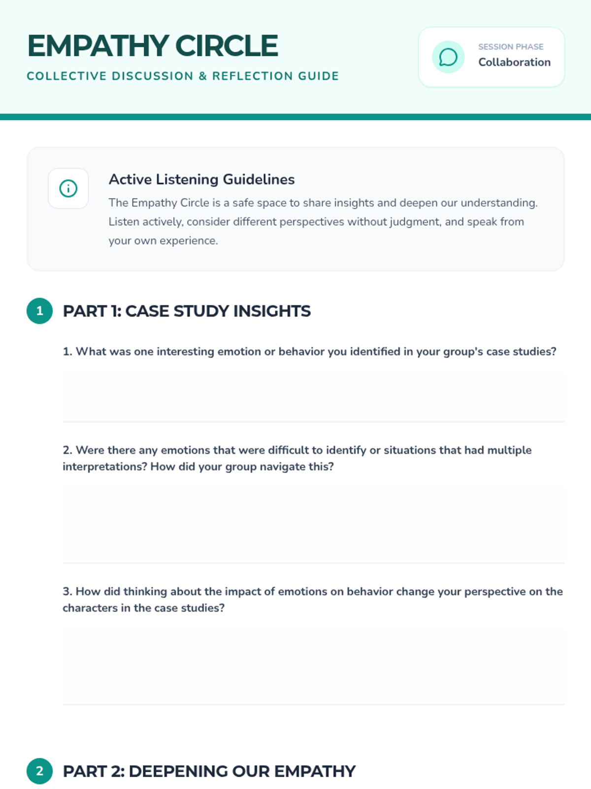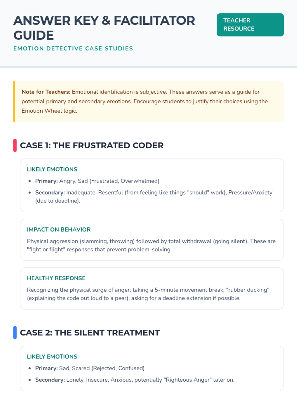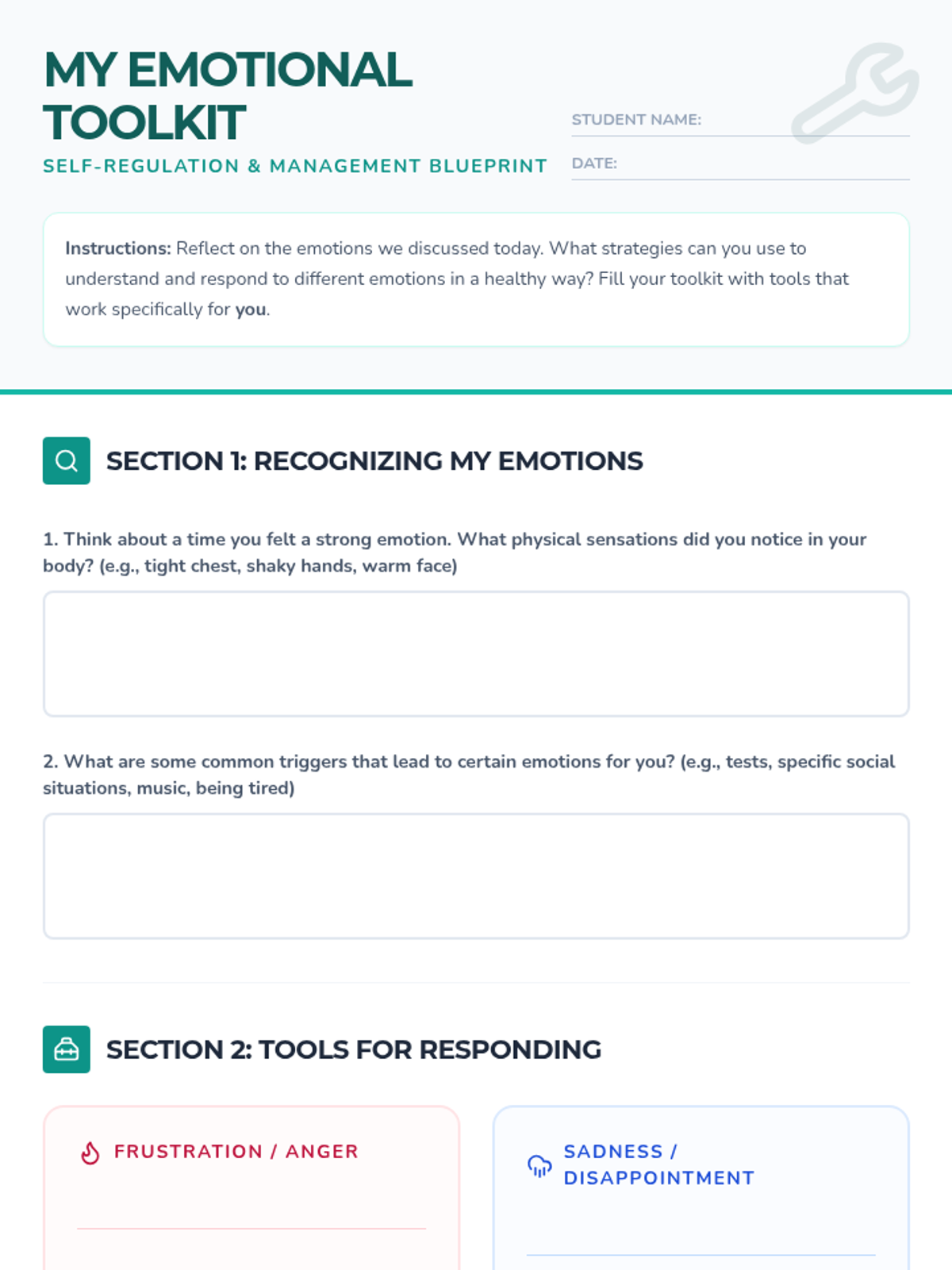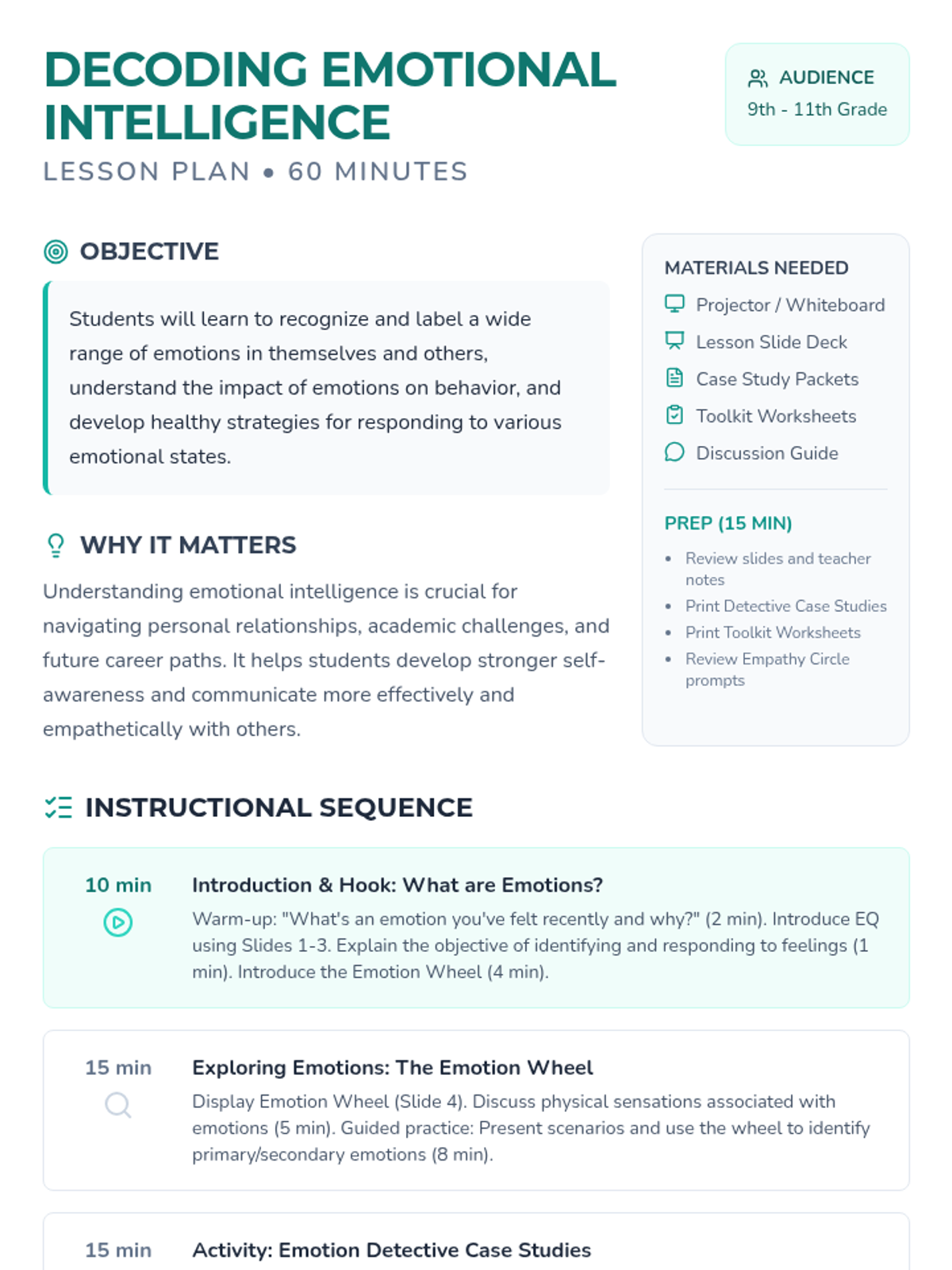 This interactive lesson for 9th-11th graders explores emotional intelligence through the 'Emotion Wheel', case study analysis, and the creation of a personal emotional toolkit. Students will build self-awareness and empathy by practicing how to recognize, label, and respond to complex emotions in themselves and others.