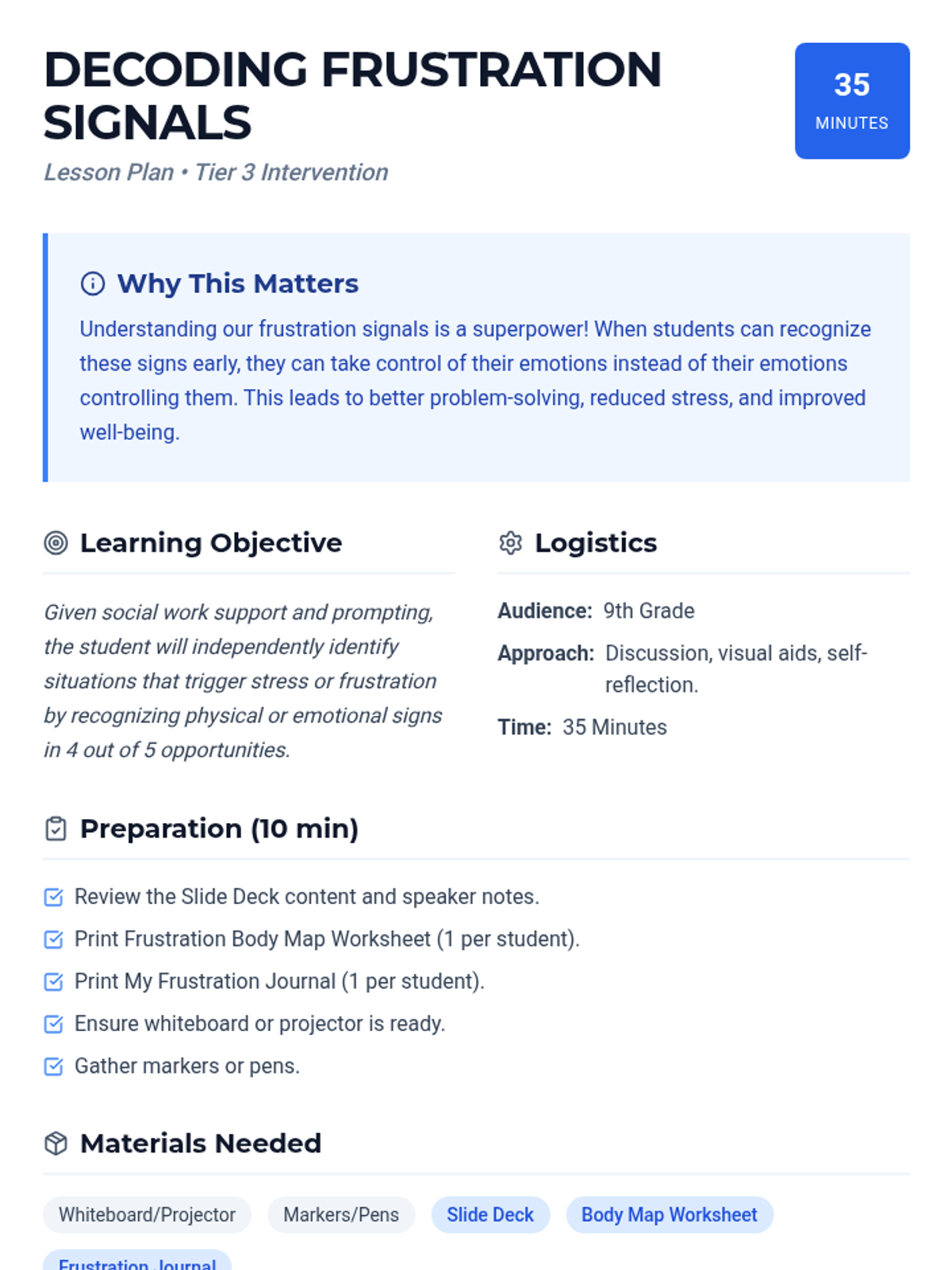 A 35-minute Tier 3 lesson for 9th-grade students to identify personal physical and emotional frustration signals, fostering self-awareness and proactive stress management.