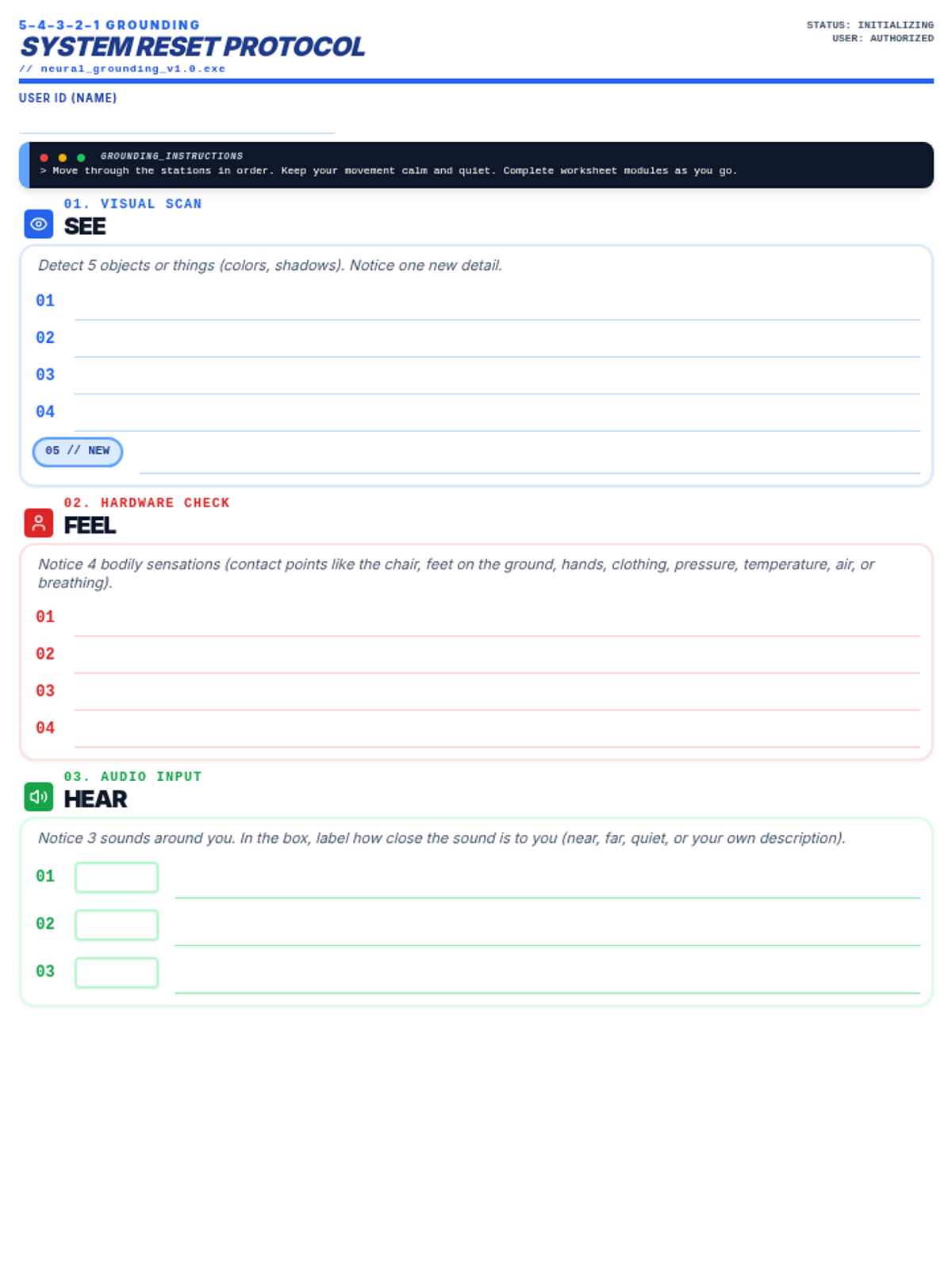 A lesson teaching students how to use the 5-4-3-2-1 grounding technique to manage stress and anxiety, framed through a technical 'system reset' metaphor. Students learn to recognize the 'spinning' state of anxiety and intercept it using sensory inputs.
