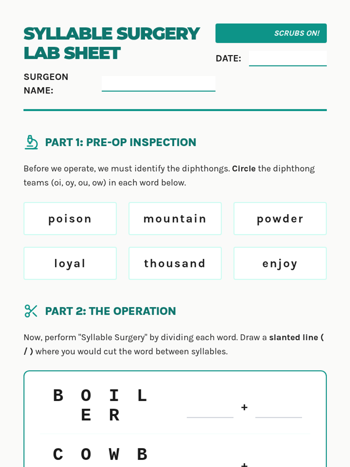 Students advance from single-syllable words to decoding two and three-syllable words containing diphthongs, such as 'poison', 'royal', 'thousand', and 'powder'. They learn to identify the diphthong as a single vowel sound to assist in proper syllable division. The lesson utilizes a 'syllable surgery' activity where students cut and reassemble complex words.