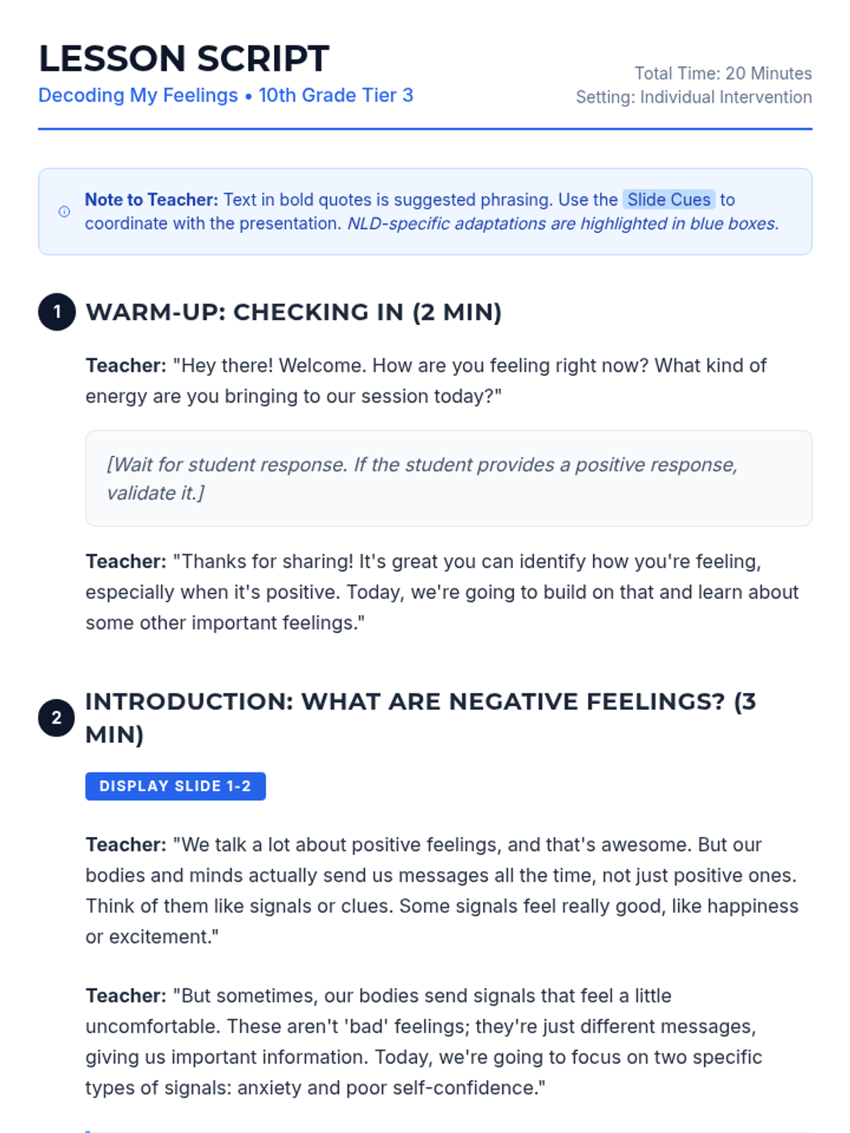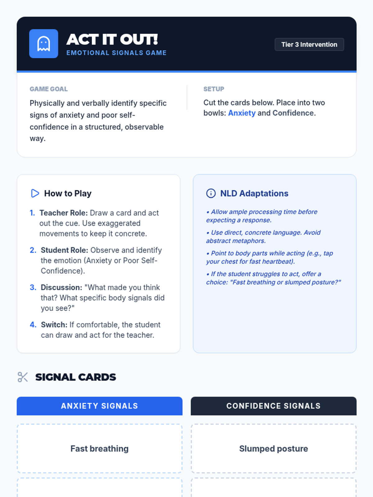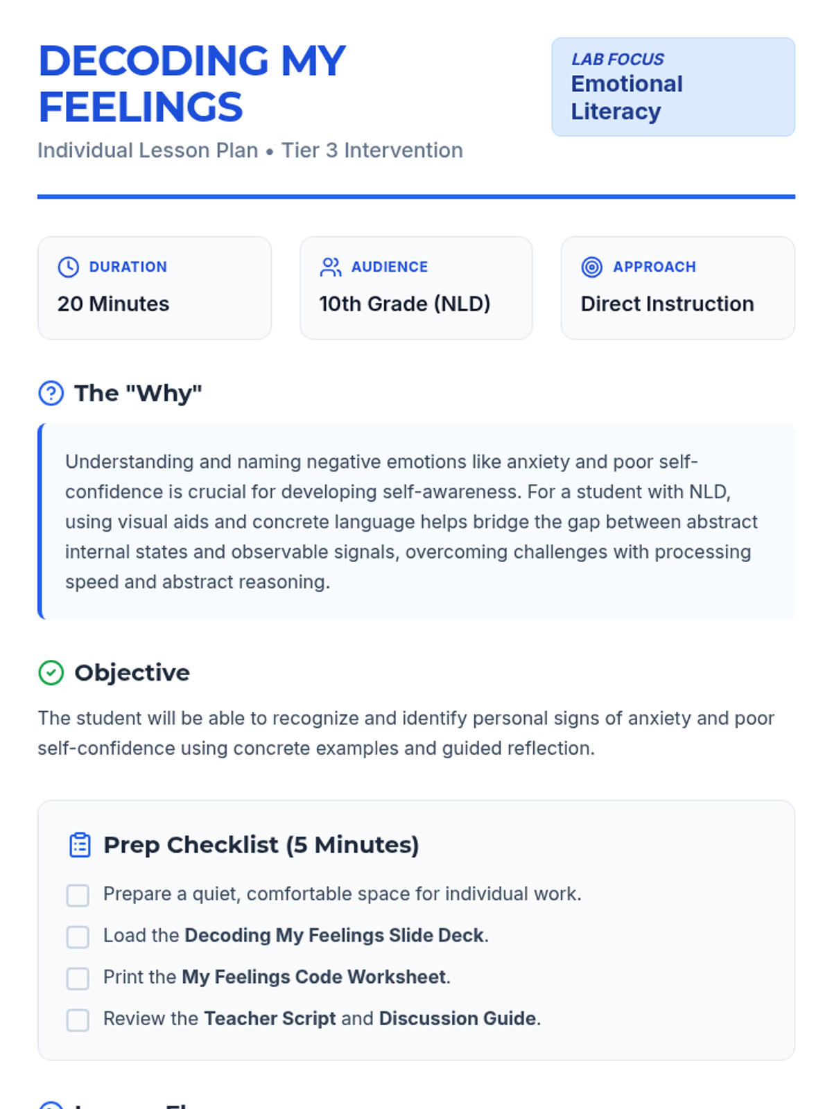 A Tier 3 individual lesson for a 10th-grade student with Non-Verbal Learning Disorder (NLD) to help them identify and decode physical and mental signals of anxiety and poor self-confidence.