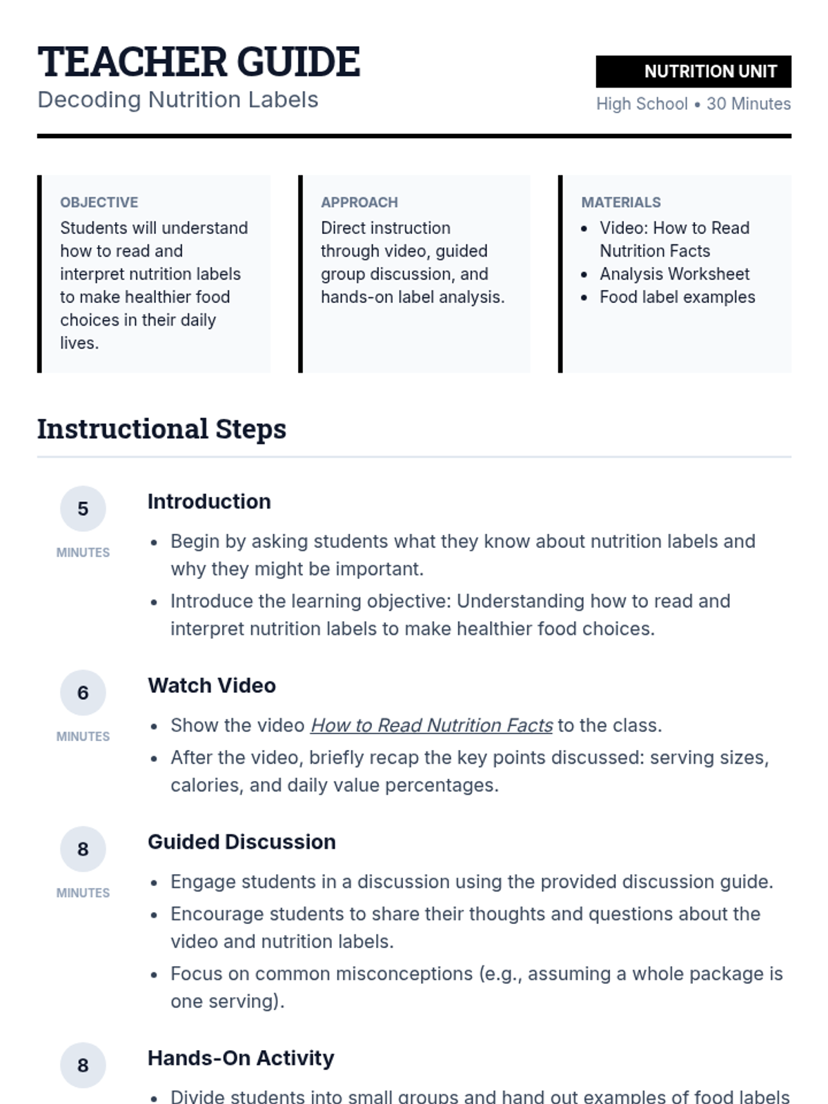 This high school nutrition lesson guides students through the complexities of nutrition labels, helping them decode serving sizes, daily values, and nutrient density to make informed dietary choices.