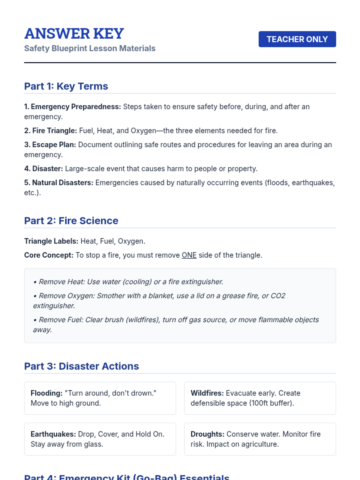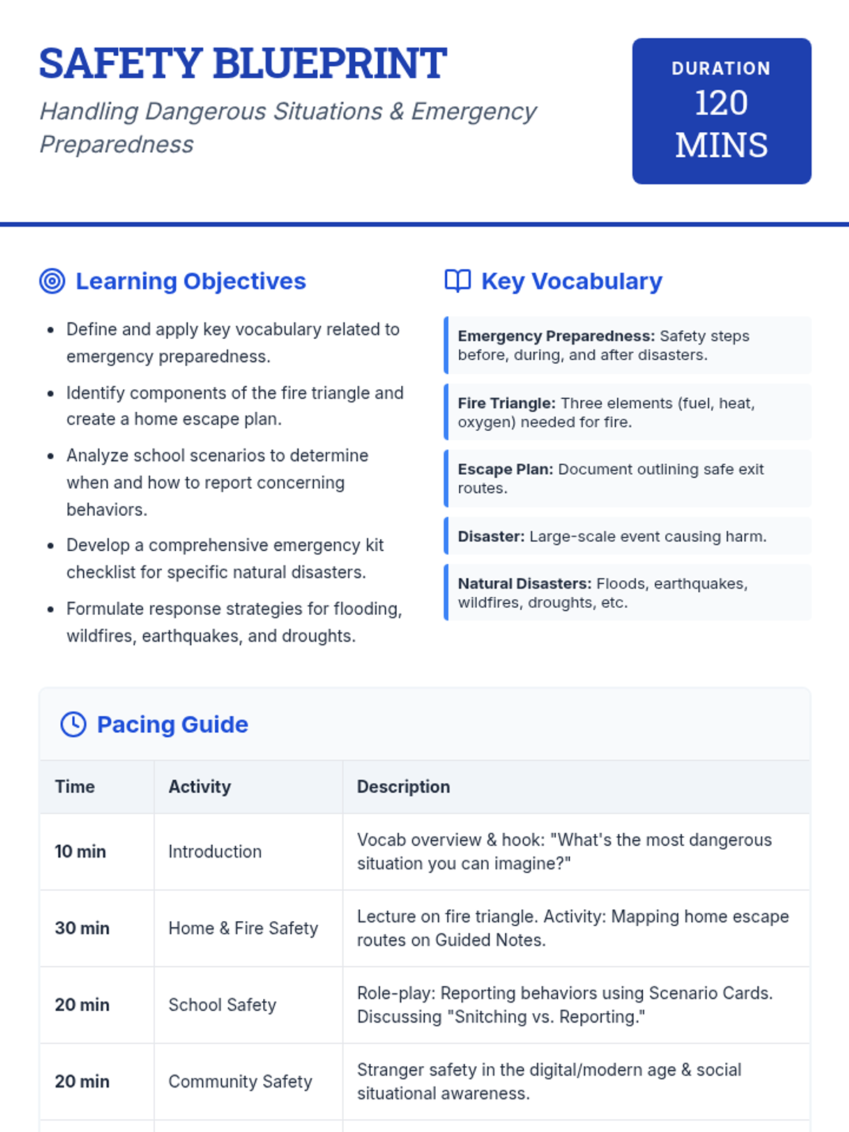 A comprehensive 2-hour lesson for 9th graders on identifying and responding to dangerous situations at home, school, and in the community, including emergency and disaster preparedness.