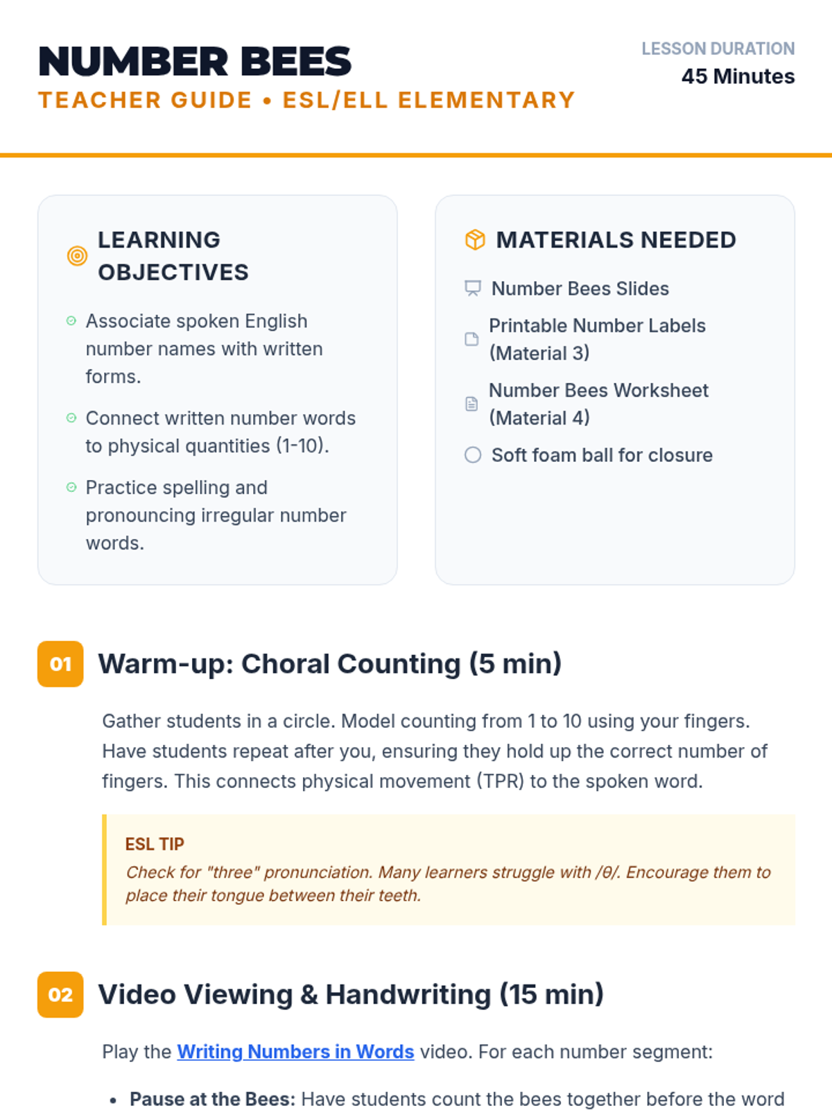 A foundational ESL lesson focused on numbers 1-10, connecting spoken words, written forms, and quantities through music, video, and movement. Students engage in choral counting, video-based handwriting practice, and a classroom-wide labeling activity.