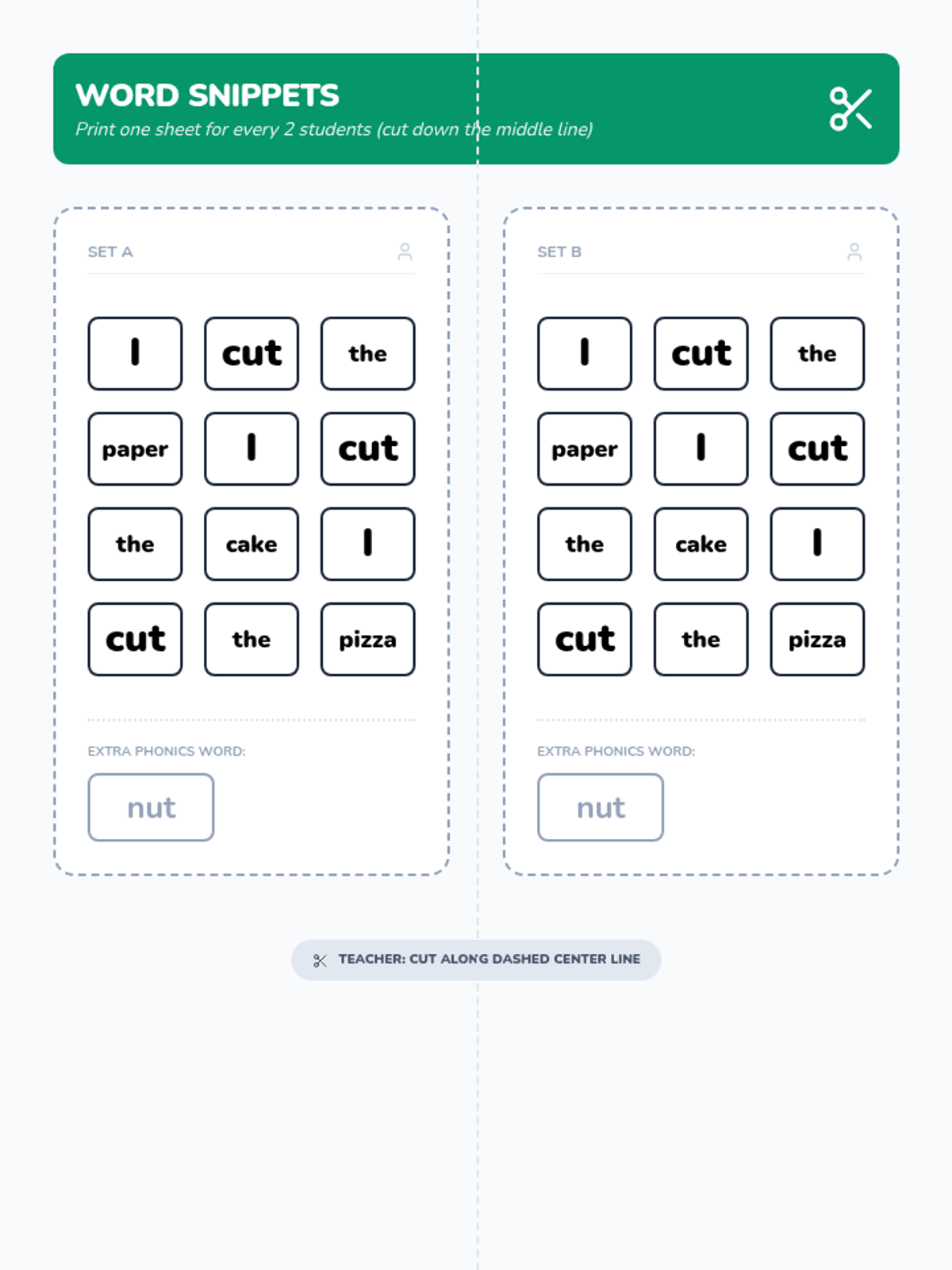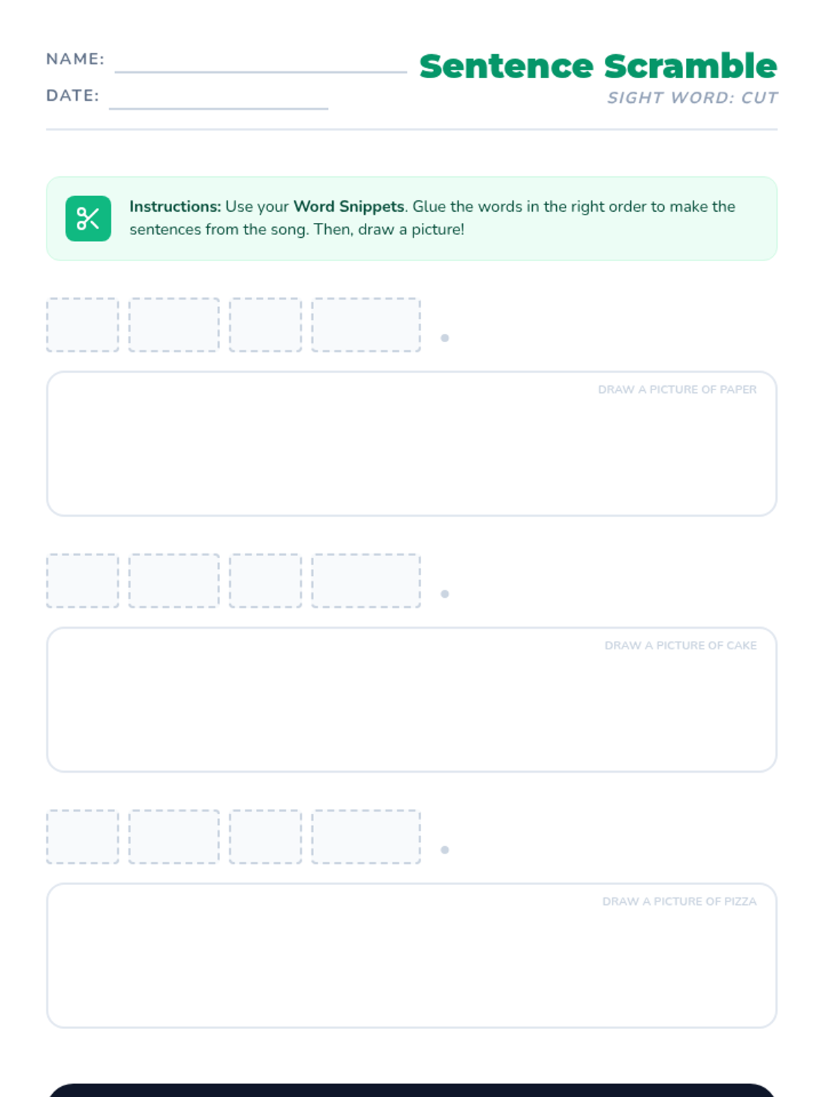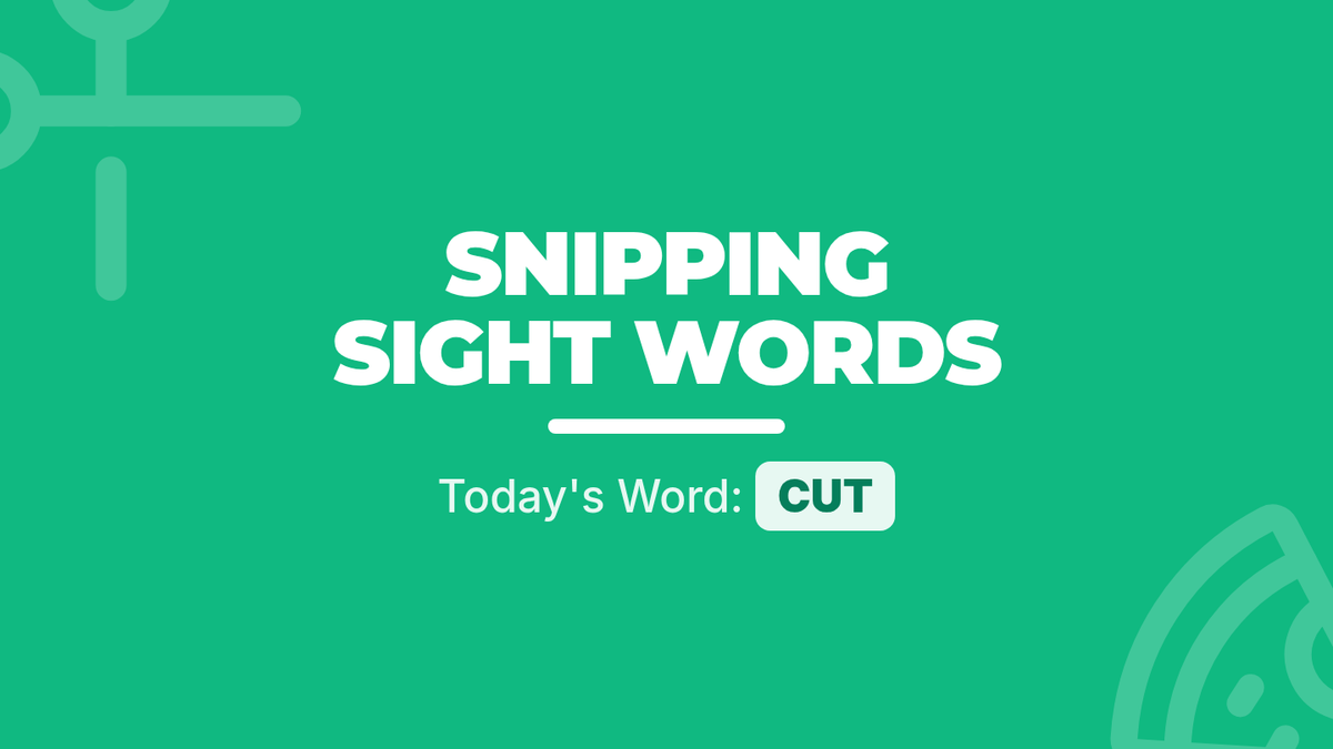 A 1st-grade phonics and sight word lesson focused on the word 'cut' and the 'ut' word family, featuring a catchy song and a hands-on sentence scramble activity.