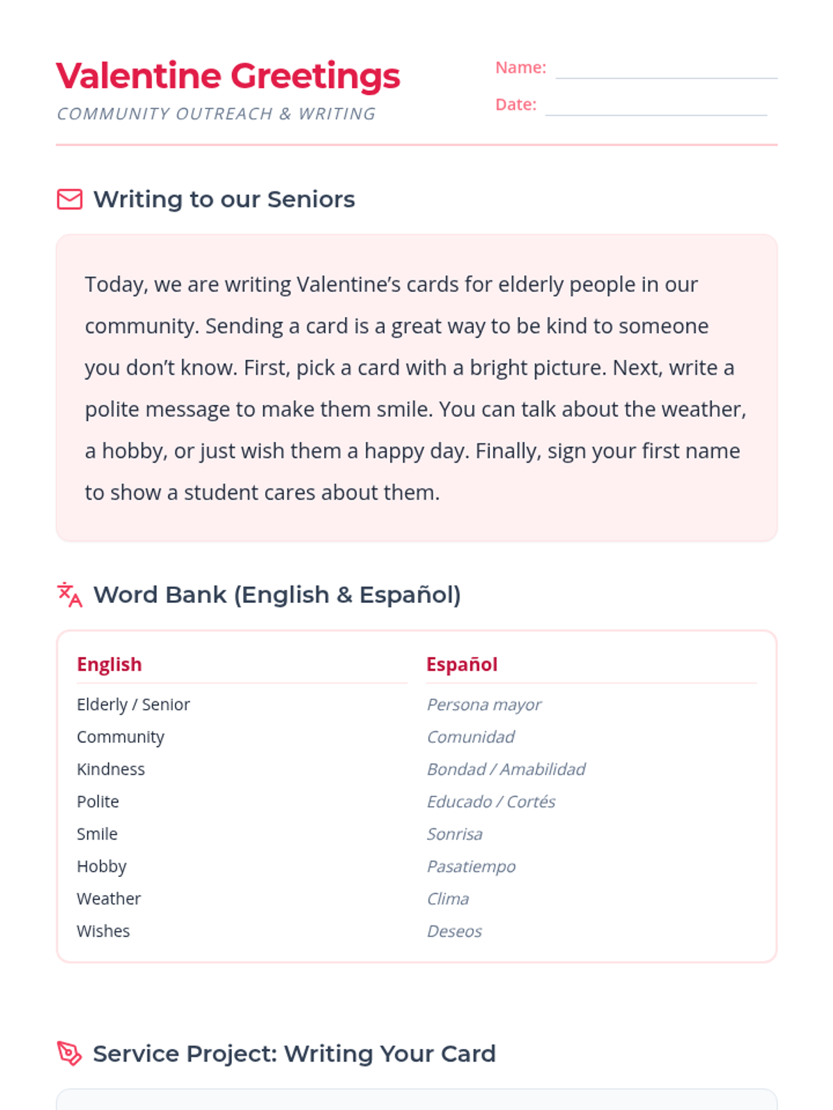 A lesson focused on the cultural tradition of sending Valentine's Day cards, designed for ESL students to practice functional reading and writing skills.
