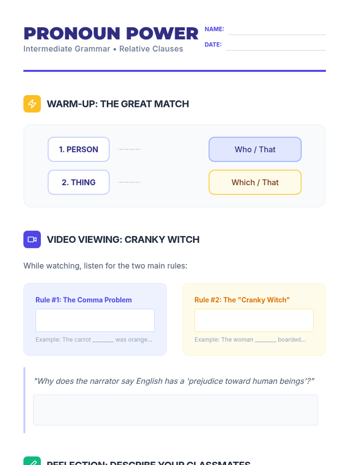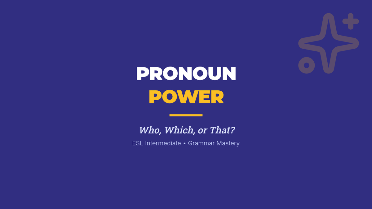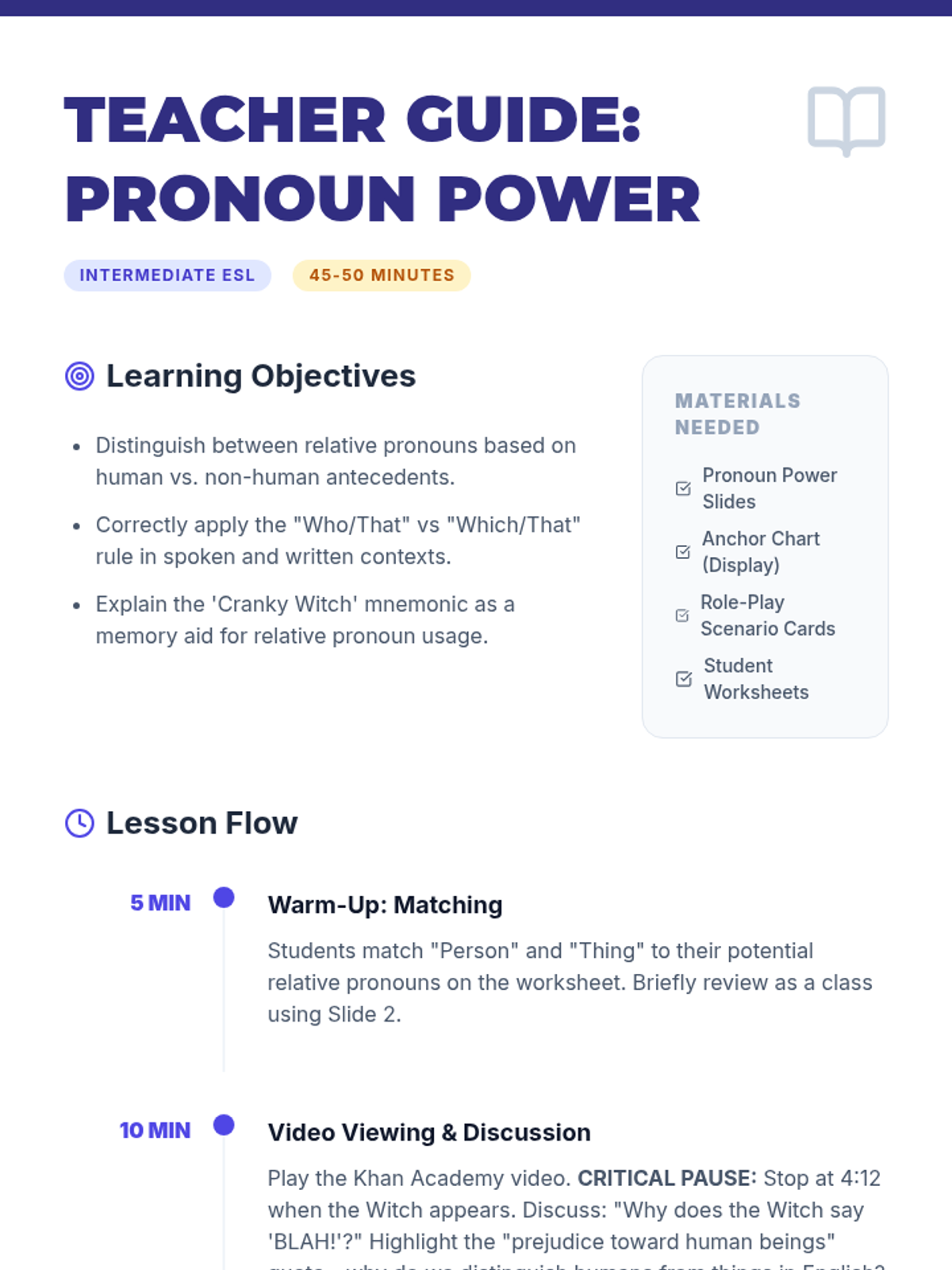 This lesson focuses on helping intermediate ELL students choose the correct relative pronouns (who, that, which) based on whether the antecedent is a person or a thing, using the 'Cranky Witch' mnemonic from Khan Academy.