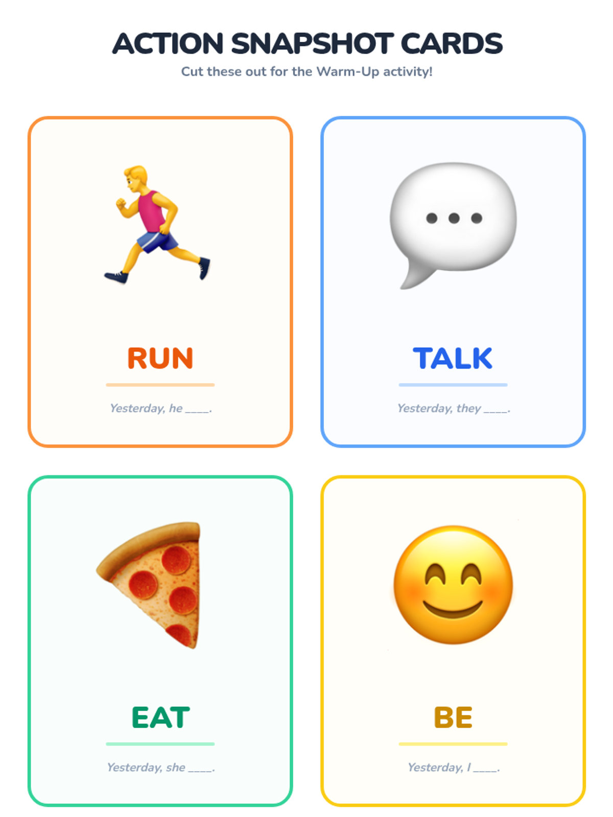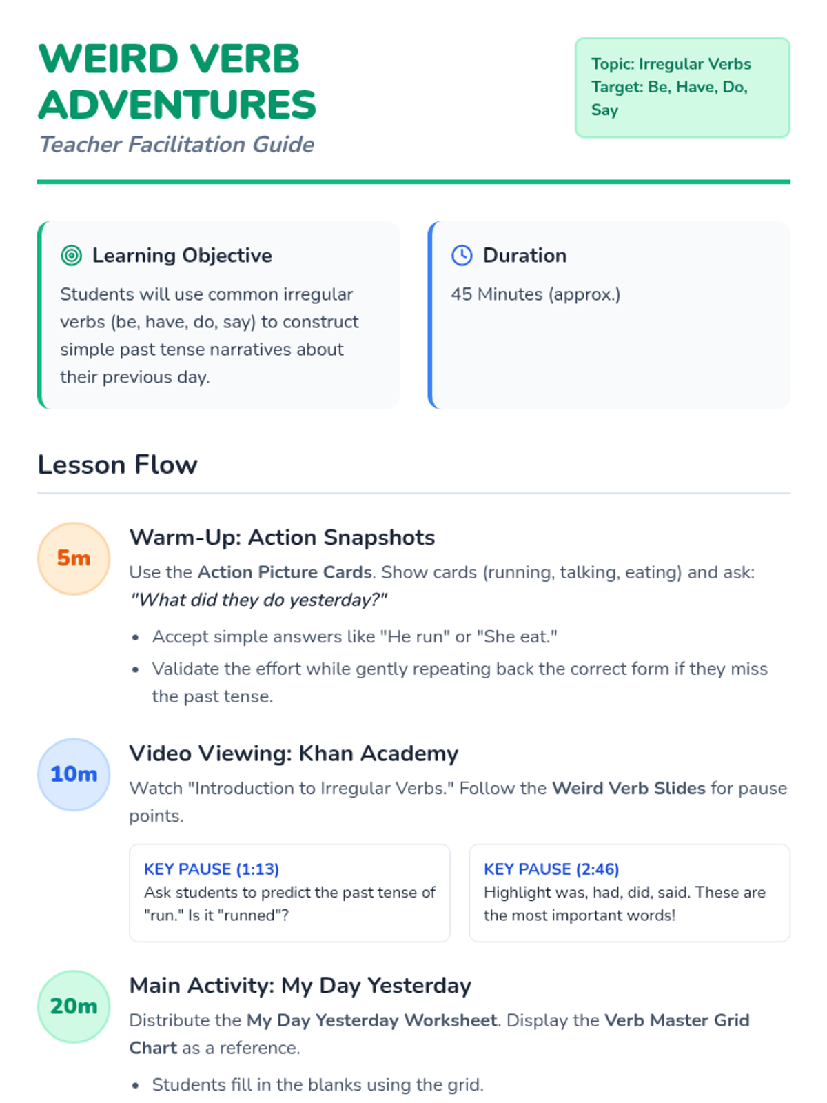 A foundational grammar lesson for ESL/ELL students focusing on the four most common irregular verbs (be, have, do, say) and their past tense forms through video analysis and scaffolded storytelling.