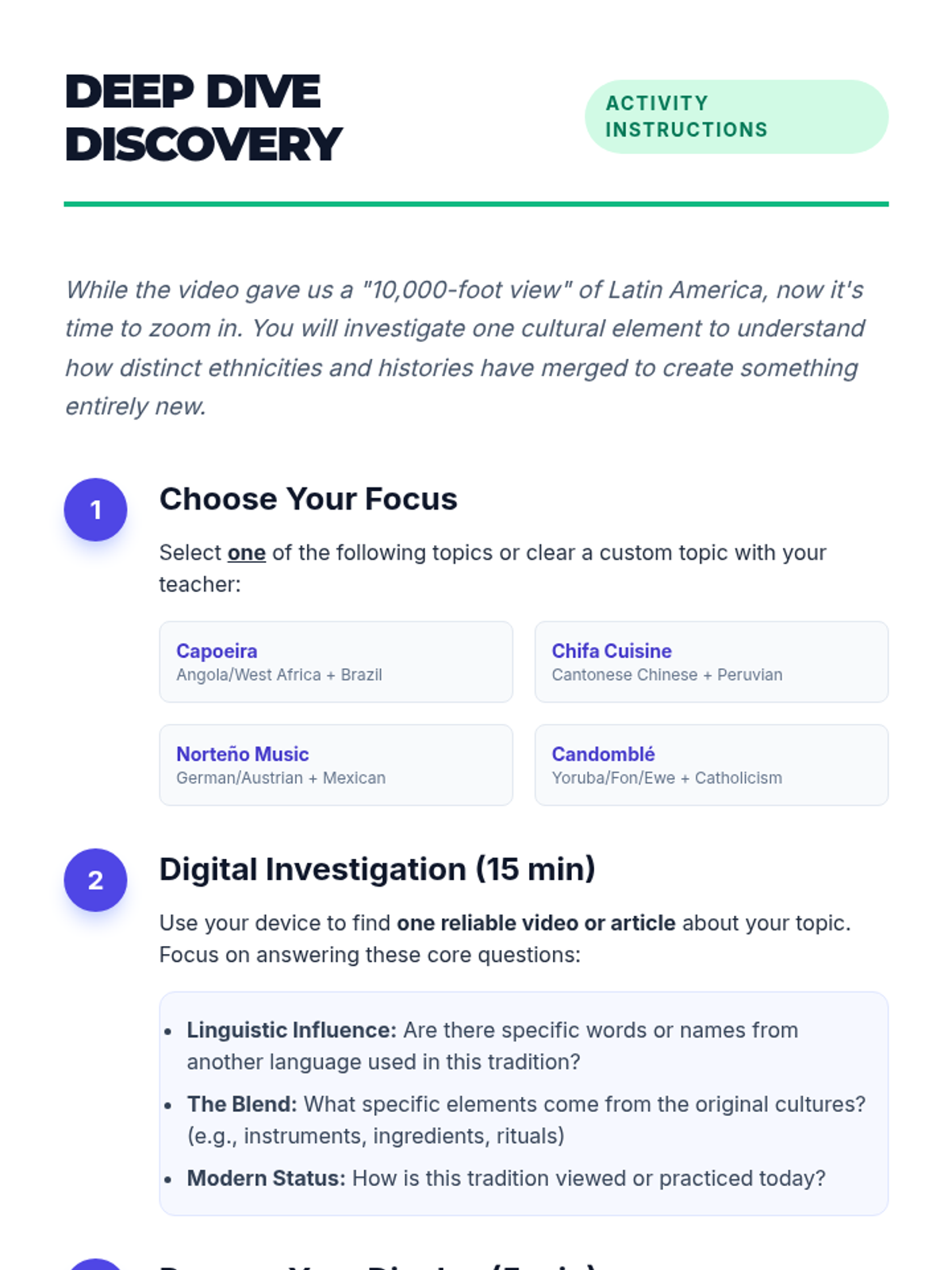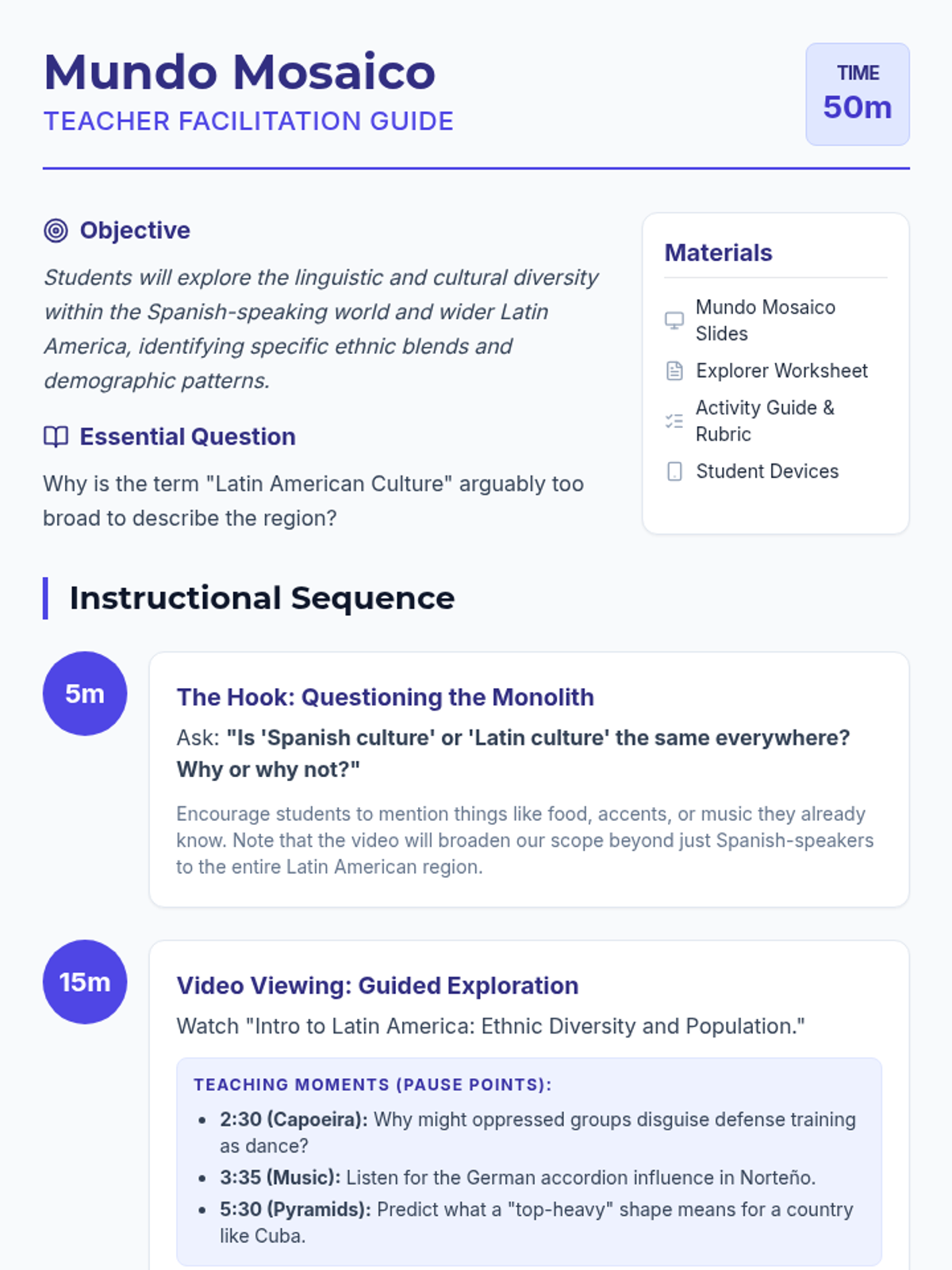A high school Spanish/World Languages lesson exploring the ethnic, linguistic, and cultural diversity of Latin America, moving beyond the 'monolith' stereotype to examine specific cultural blends like Afro-Caribbean, German-Mexican, and Asian-Peruvian influences.