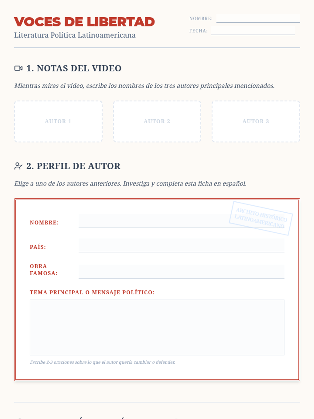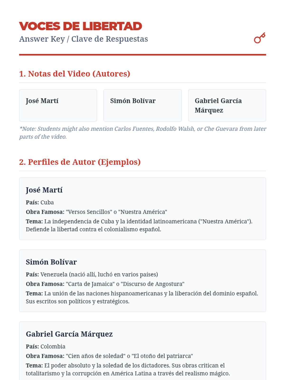 A Level 2+ Spanish lesson connecting language learning with Latin American political history and literature. Students explore the works of Martí, Bolívar, and Márquez while building author profiles in Spanish.