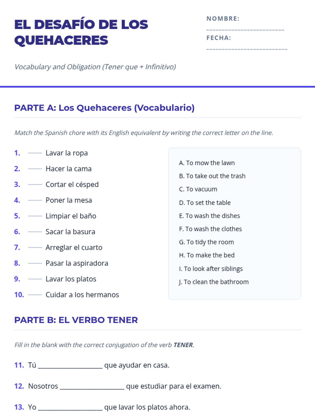 A follow-up lesson on household chores (quehaceres) focused on reinforcing vocabulary through visual practice and sentence construction. Students will engage with 30 different practice items ranging from simple identification to contextual application.